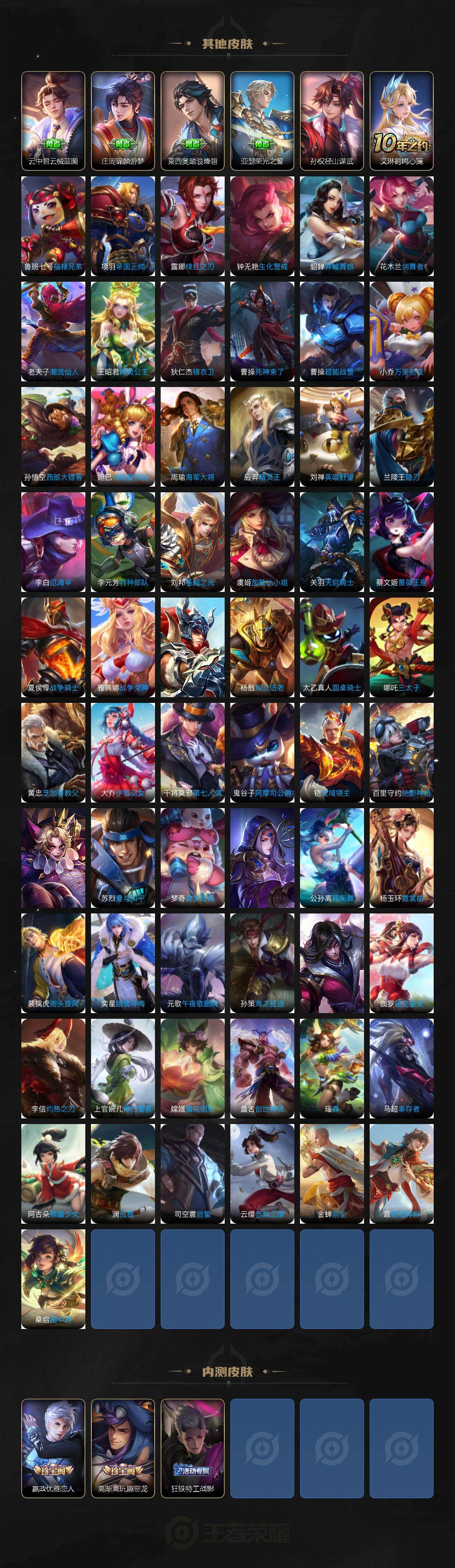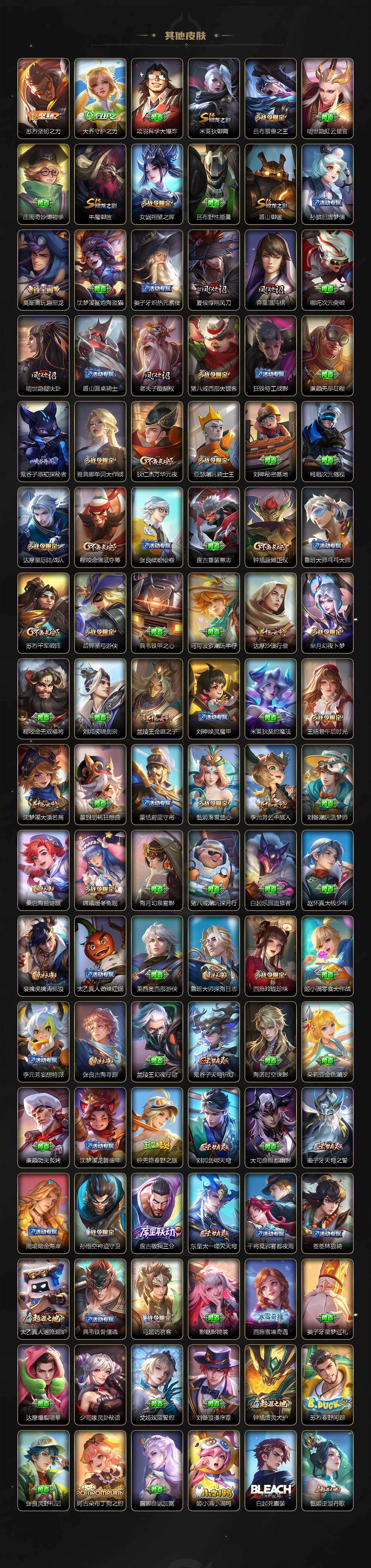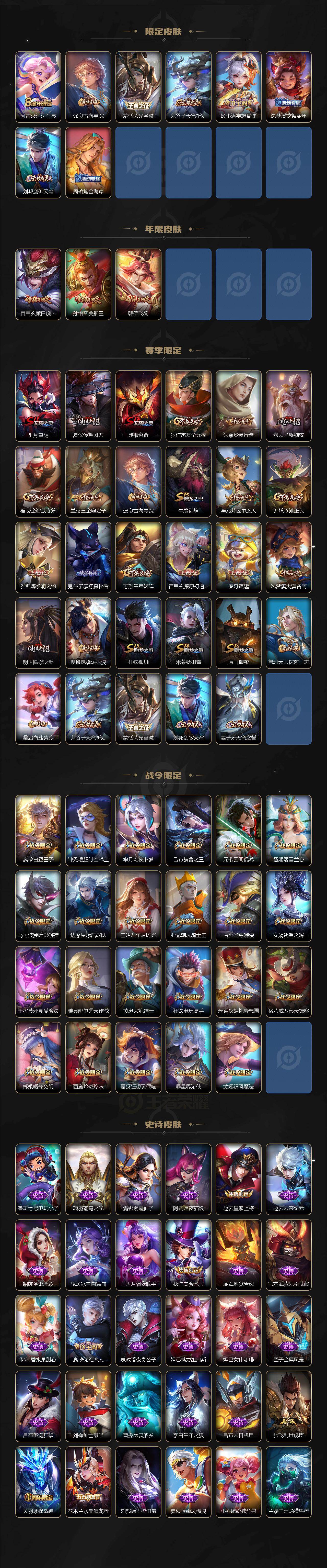 【限定皮肤】:姜子牙天穹之誓,狄仁杰阴阳师,赵云皇家上将,嬴政优雅恋人,嬴政白昼王子,庄周高山流水,高渐离玩趣恶龙,钟无艳超时空战士,芈月重明,芈月幻夜卜梦,吕布猎兽之王,元歌云间偶戏,元歌无心,夏侯惇朔风刀,甄姬游园惊梦,甄姬落雪兰心,典韦穷奇,马可波罗暗影游猎,狄仁杰魔术师,狄仁杰万华元夜,达摩星际陆战队,达摩沙漠行僧,项羽海滩派对,老夫子醍醐杖,关羽冰锋战神,程咬金演武夺筹,韩信飞衡,王昭君午后时光,兰陵王金庭之子,不知火舞绯月行,亚瑟潮玩骑士王,孙悟空美猴王,孙悟空大圣娶亲,牛魔御旌,后羿圣弓游侠,李元芳云中旅人,虞姬启明星使,钟馗驱傩正仪,女娲朔望之晖,干将莫邪冰霜恋舞曲,干将莫邪真爱魔法,雅典娜单词大作战,雅典娜黎明之约,太乙真人华丽摇滚,鬼谷子原初探秘者,鬼谷子五谷丰年,黄忠火炮绅士,苏烈千军破阵,百里玄策白虎志,百里玄策原初追逐者,弈星混沌棋,梦奇顽趣,沈梦溪大漠名商,明世隐疑决卦,裴擒虎李小龙,裴擒虎擒涛扼浪,狂铁御狮,狂铁电玩高手,米莱狄御霄,米莱狄胡桃异想国,伽罗天狼溯光者,盾山御銮,孙策挚爱之约,猪八戒西部大镖客,嫦娥拒霜思,嫦娥暖冬兔眠,西施玲珑珍味,蒙犽狂想玩偶喵,鲁班大师探海日志,桑启海盐诗旅,暃星界游侠,戈娅驭风魔法,阿古朵江河有灵,张良古海寻踪,蒙恬荣光圣徽,鬼谷子天穹祈灯,姬小满妄想食味,沈梦溪龙舞盛年,刘邦剑破天穹,周瑜熔金海岸