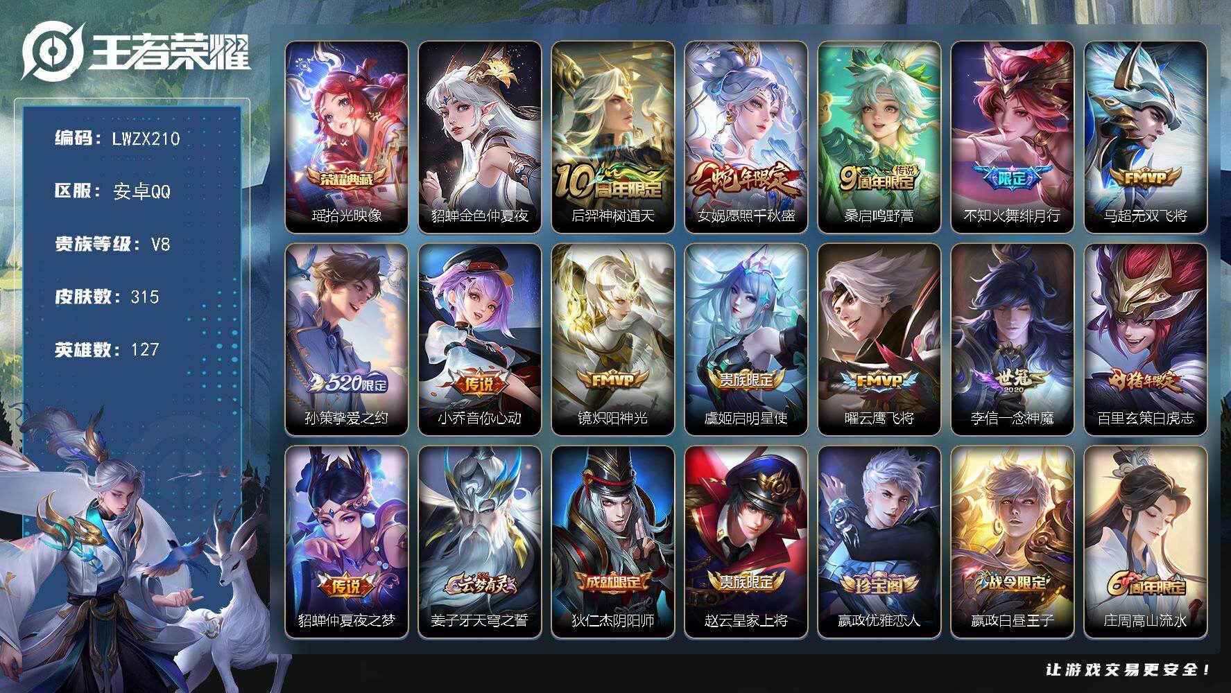 [15613278]可二次【特价出售/店主推荐】安卓Q-V8-最强王者段位-127英雄-315皮肤-1典藏皮肤-13传说-84史诗-1星元