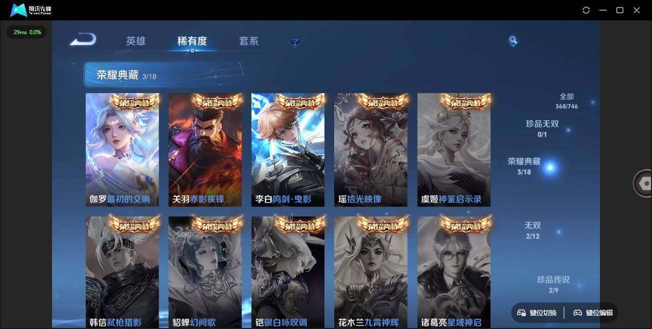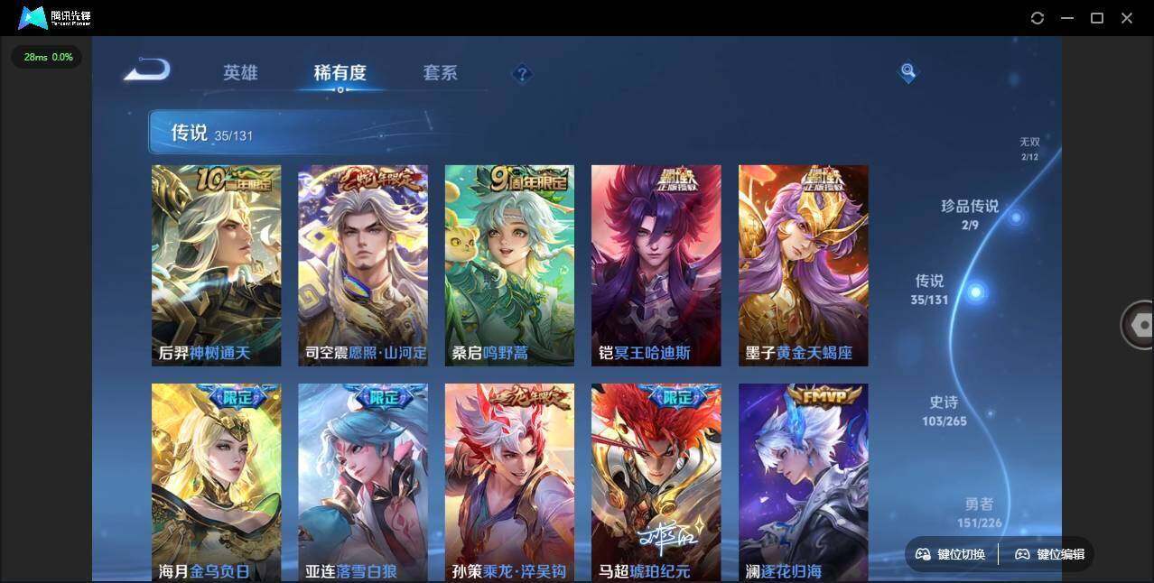 - PX_2093349-96 安卓QQ/至尊星耀/176皮肤/123英雄/0典藏/0珍品无双/0无双/1珍品传说/11传说/52史诗/8稀有英雄 【1 珍品传说】怪盗基德 马可波罗, 【11 传说皮肤】诗剑行 李白,浮生妄 夏洛特,地狱之眼 宫本武藏,默契交锋 兰陵王,炽阳神光 镜,久胜战神 干将莫邪,乘龙·铭钟鼎 赵云,寅虎·赤拳 裴擒虎,山海·苍雷引 曜,愿照·九州拓 澜,鸣野蒿 桑启, 【52