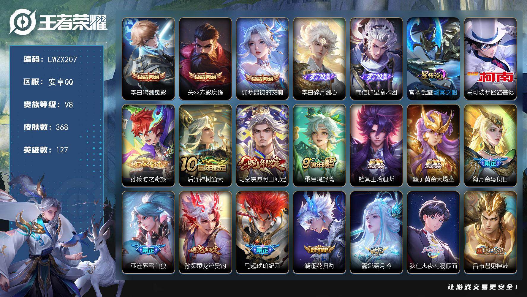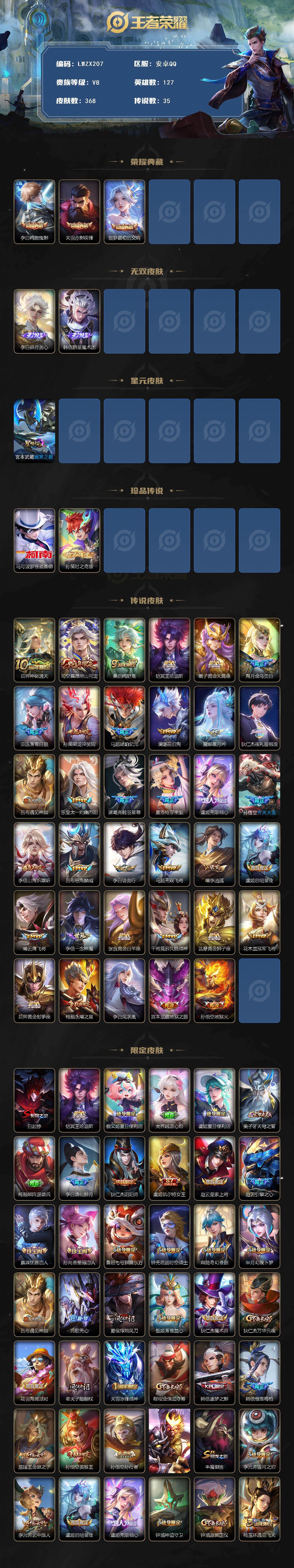 [15613330]【特价出售/店主推荐】安卓Q-V8-最强王者段位-127英雄-368皮肤-3典藏皮肤-2无双-2珍品传说-35传说-103史诗-1星元