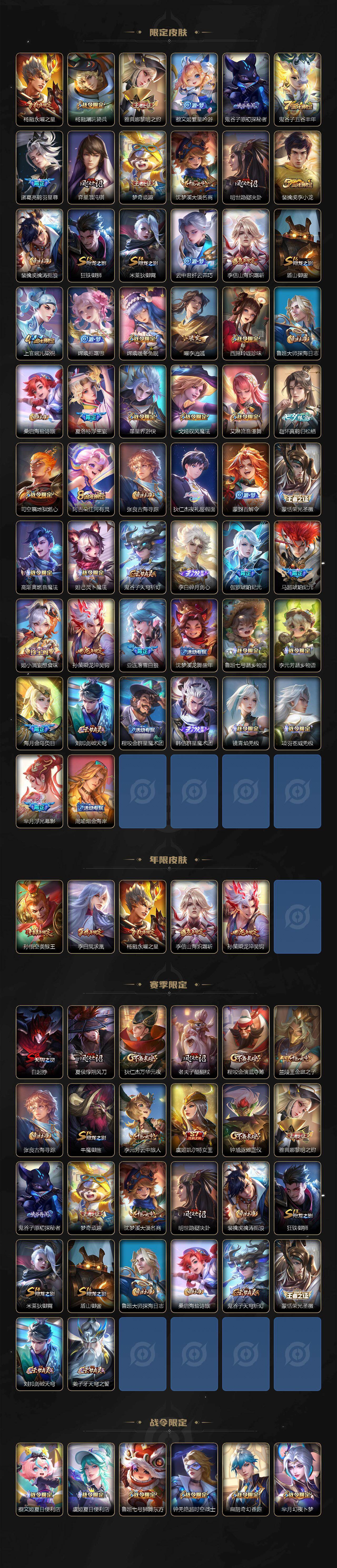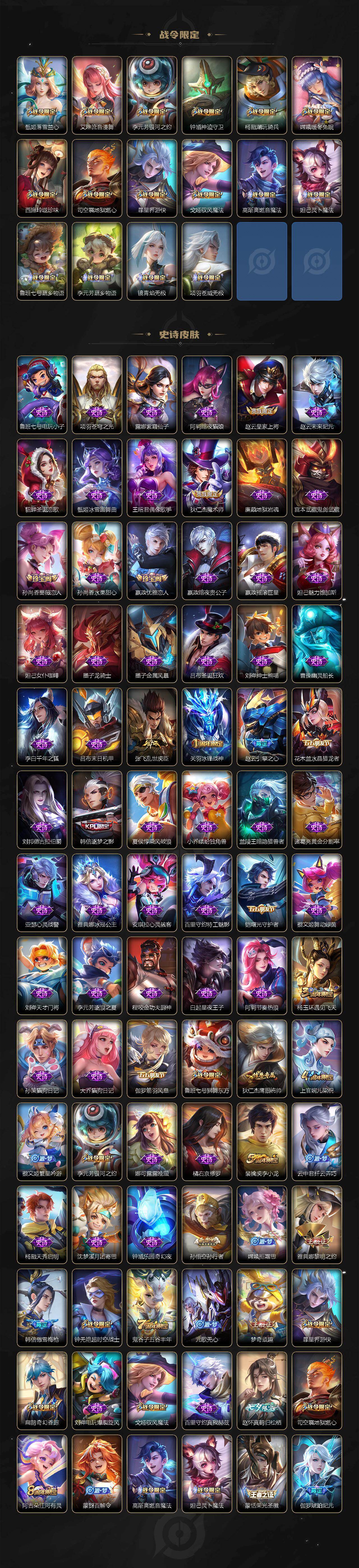【限定皮肤】:白起狰,铠冥王哈迪斯,蔡文姬夏日便利店,大乔绒语心约,虞姬夏日便利店,姜子牙天穹之誓,杨戬破阵退雄兵,李白谪仙醉月,狄仁杰阴阳师,虞姬凯尔特女王,赵云皇家上将,赵云引擎之心,嬴政优雅恋人,孙尚香蔷薇恋人,鲁班七号狮舞东方,钟无艳超时空战士,扁鹊奇幻香踪,芈月幻夜卜梦,吕布遇见神鼓,元歌无心,夏侯惇朔风刀,甄姬落雪兰心,狄仁杰魔术师,狄仁杰万华元夜,项羽海滩派对,老夫子醍醐杖,关羽冰锋战神,程咬金演武夺筹,韩信逐梦之影,韩信傲雪梅枪,兰陵王金庭之子,孙悟空美猴王,孙悟空孙行者,孙悟空齐天大圣,牛魔御旌,李元芳银河之约,李元芳云中旅人,虞姬启明星使,虞姬无限倾心,钟馗神迹守卫,钟馗驱傩正仪,杨玉环遇见飞天,杨戬永曜之星,杨戬潮玩骑兵,雅典娜黎明之约,蔡文姬繁星吟游,鬼谷子原初探秘者,鬼谷子五谷丰年,诸葛亮鹤羽星尊,弈星混沌棋,梦奇顽趣,沈梦溪大漠名商,明世隐疑决卦,裴擒虎李小龙,裴擒虎擒涛扼浪,狂铁御狮,米莱狄御霄,云中君纤云弄巧,李信山海炽霜斩,盾山御銮,上官婉儿梁祝,嫦娥拒霜思,嫦娥暖冬兔眠,曜李逍遥 ,西施玲珑珍味,鲁班大师探海日志,桑启海盐诗旅,夏洛特浮生妄,暃星界游侠,戈娅驭风魔法,艾琳流音漫舞,赵怀真鹤归松栖,司空震地狱燃心,阿古朵江河有灵,