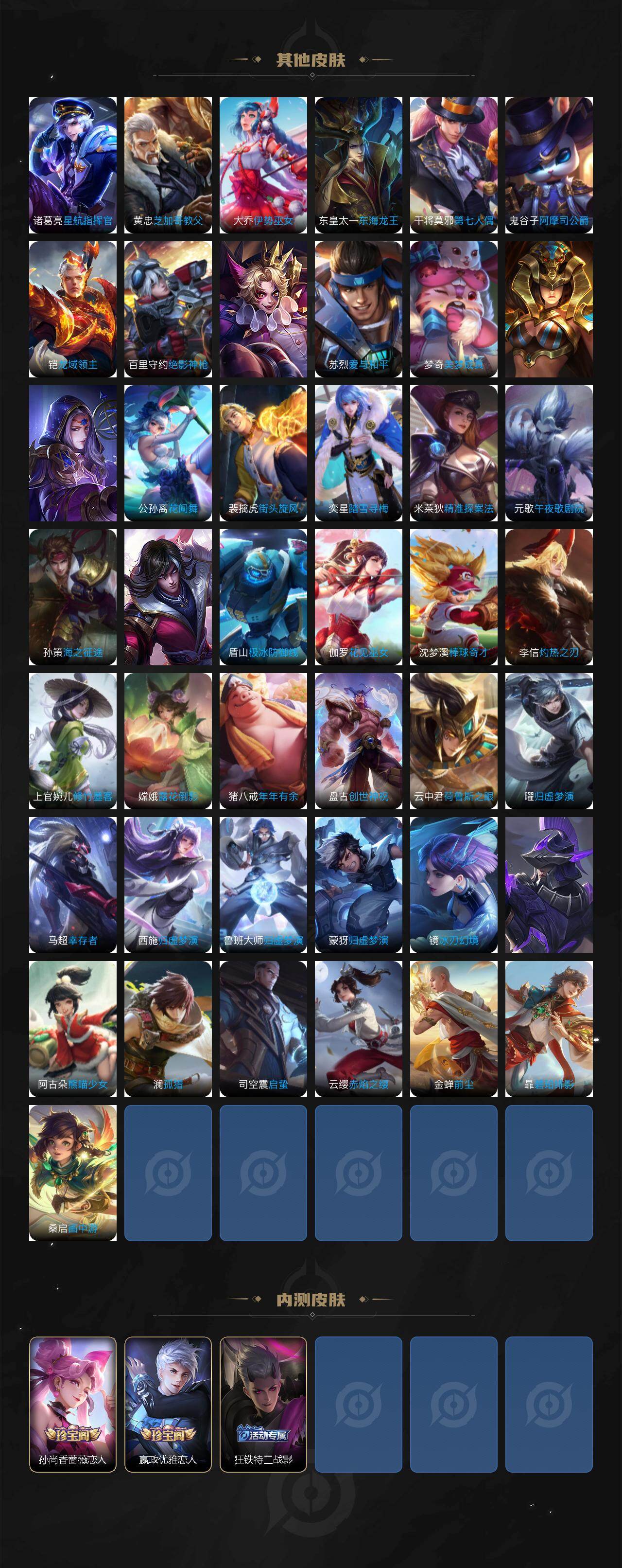 虞姬凯尔特女王,白起狰,狂铁御狮,米莱狄御霄,牛魔御旌,盾山御銮,夏侯惇朔风刀,明世隐疑决卦,老夫子醍醐杖,鬼谷子原初探秘者,狄仁杰万华元夜,程咬金演武夺筹,钟馗驱傩正仪,钟馗神迹守卫,鲁班七号狮舞东方,李元芳银河之约,弈星混沌棋,兰陵王金庭之子,沈梦溪大漠名商,李元芳云中旅人,桑启海盐诗旅,裴擒虎擒涛扼浪,鲁班大师探海日志,张良古海寻踪,项羽苍威无极,镜青焰无极