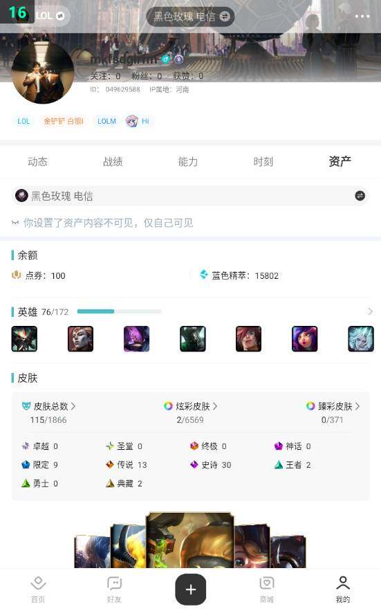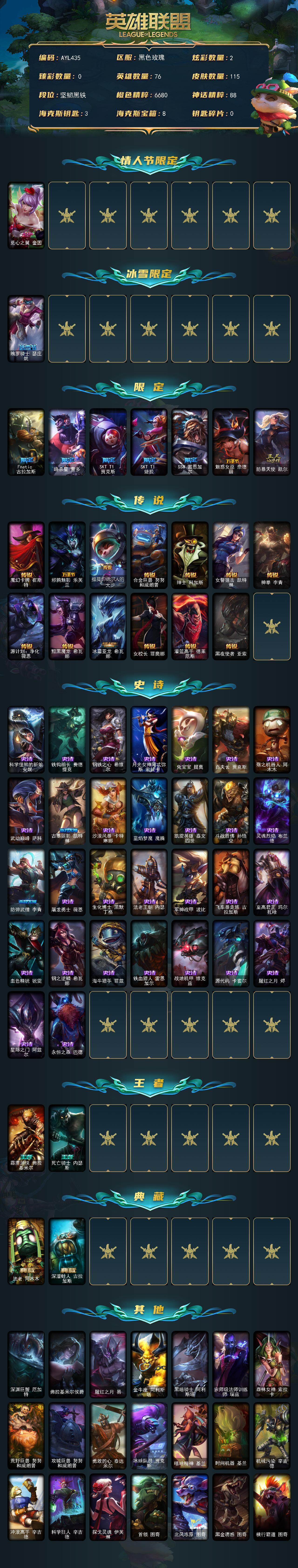 未定级段位-76英雄-115皮肤-2炫彩-0终极-0神话-9限定-13传说-30史诗