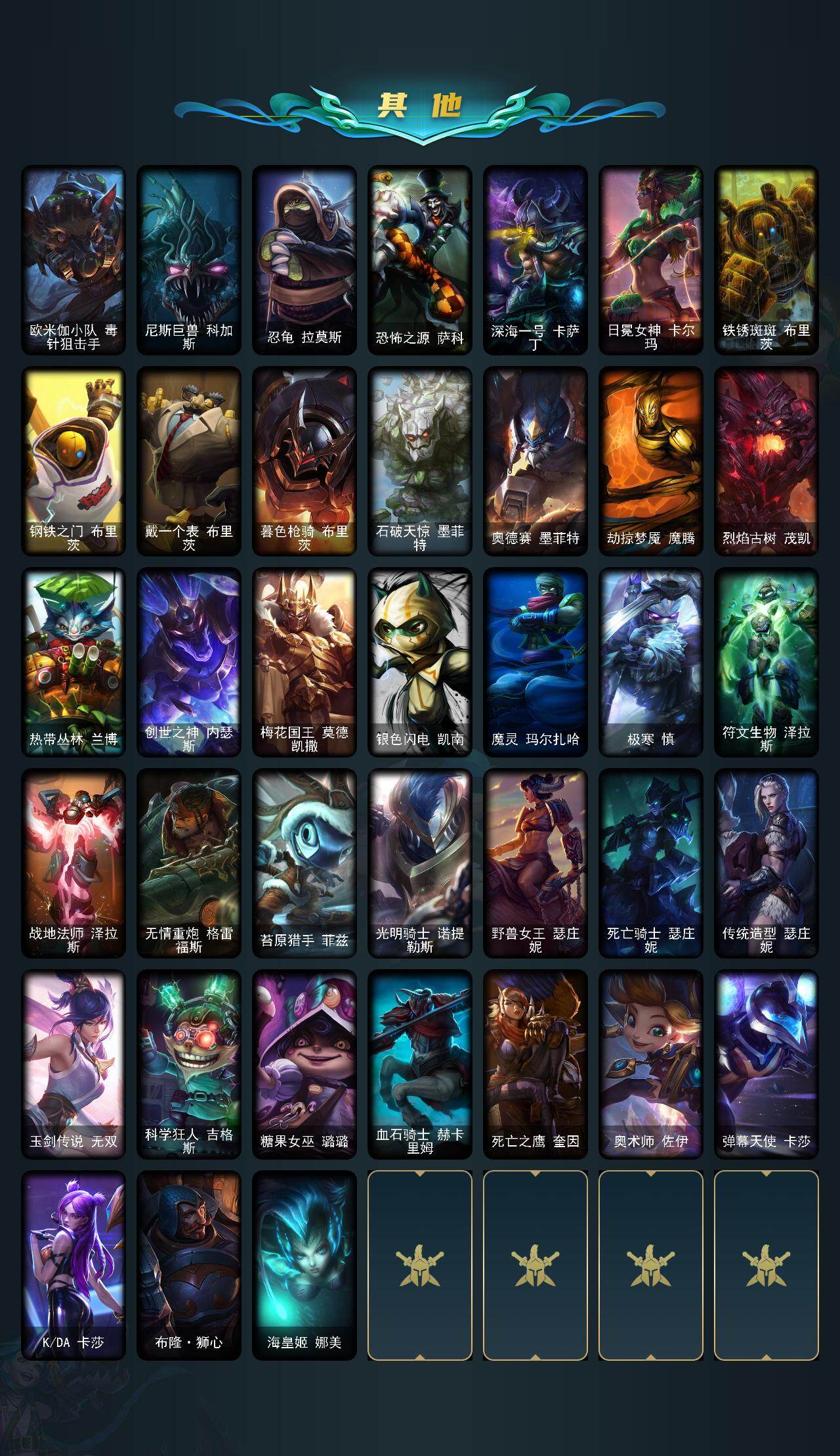 【其他皮肤1】:深渊巨蟹厄加特,弗拉基米尔侯爵,腥红之月易,金牛座阿利斯塔,黑暗骑士阿利斯塔,宗师级法师训练师瑞兹,森林女神索拉卡,荒野巨兽努努和威朗普,攻城巨兽努努和威朗普,勇敢的心泰达米尔,冰球队员贾克斯,嘻哈精神基兰,时间机器基兰,机械污染辛吉德,冲浪高手辛吉德,科学狂人辛吉德,探戈灵魂伊芙琳,首领图奇,北风冻原图奇,黑金诱惑图奇,横行霸道图奇,欧米伽小队毒针狙击手,尼斯巨兽科加斯,忍龟拉莫斯,恐怖之源萨科,深海一号卡萨丁,日冕女神卡尔玛,铁锈斑斑布里茨,钢铁之门布里茨,戴一个表布里茨,暮色枪骑布里茨,石破天惊墨菲特,奥德赛墨菲特,劫掠梦魇魔腾,烈焰古树茂凯,热带丛林兰博,创世之神内瑟斯,梅花国王莫德凯撒,银色闪电凯南,魔灵玛尔扎哈,极寒慎,符文生物泽拉斯,战地法师泽拉斯,无情重炮格雷福斯,苔原猎手菲兹,光明骑士诺提勒斯,野兽女王瑟庄妮,死亡骑士瑟庄妮,传统造型瑟庄妮,玉剑传说无双,科学狂人吉格斯,糖果女巫璐璐,血石骑士赫卡里姆,死亡之鹰奎因,奥术师佐伊,弹幕天使卡莎,