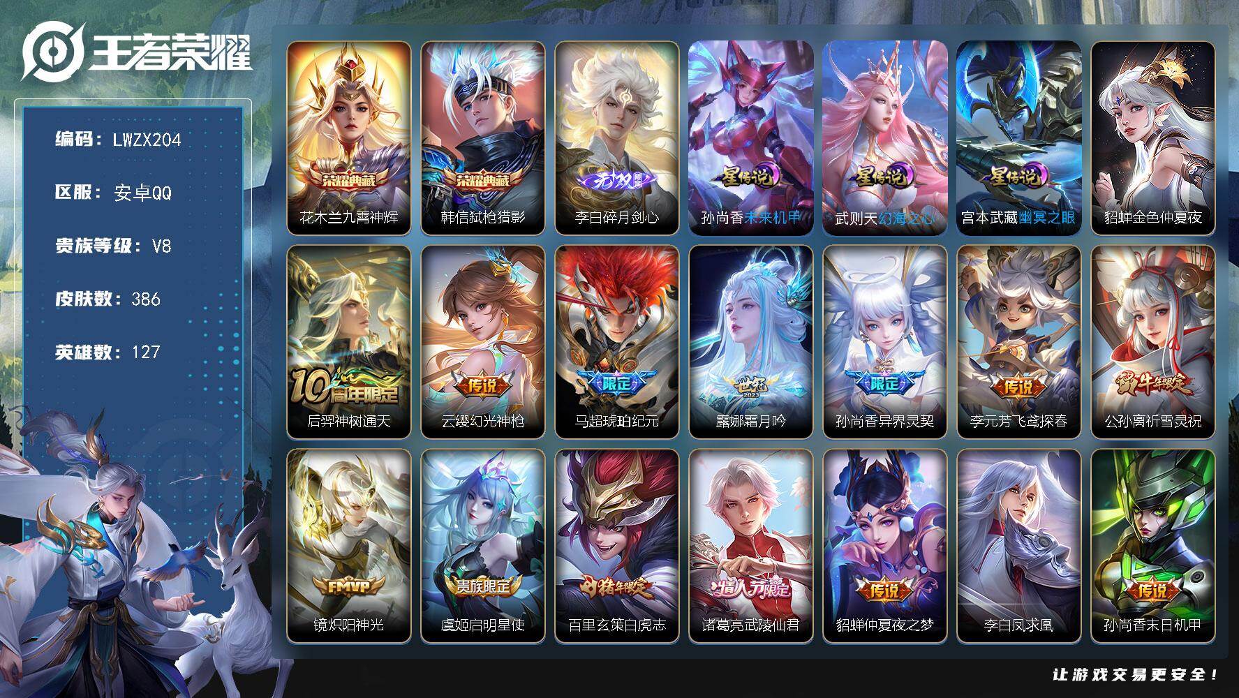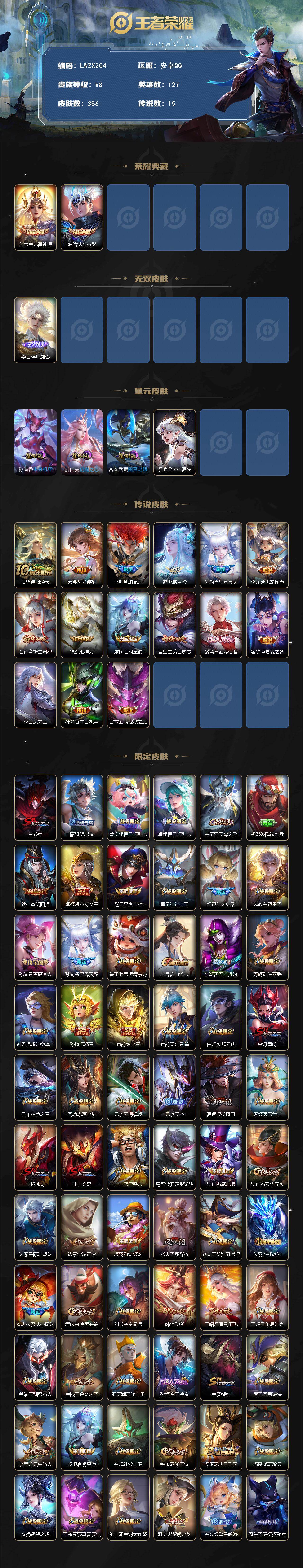 [15613342]【特价出售/店主推荐】安卓Q-V8-最强王者段位-127英雄-386皮肤-2典藏皮肤-1无双-15传说-116史诗-4星元