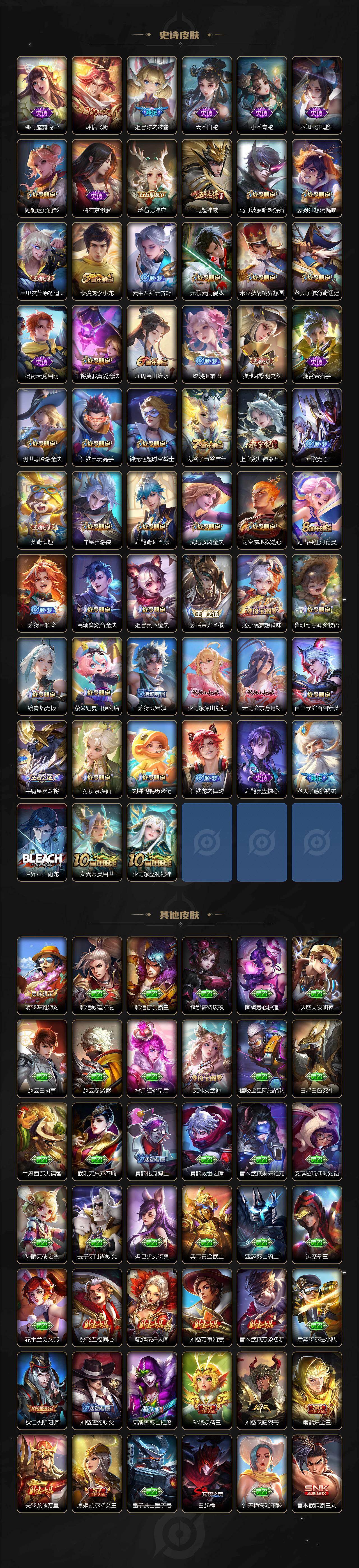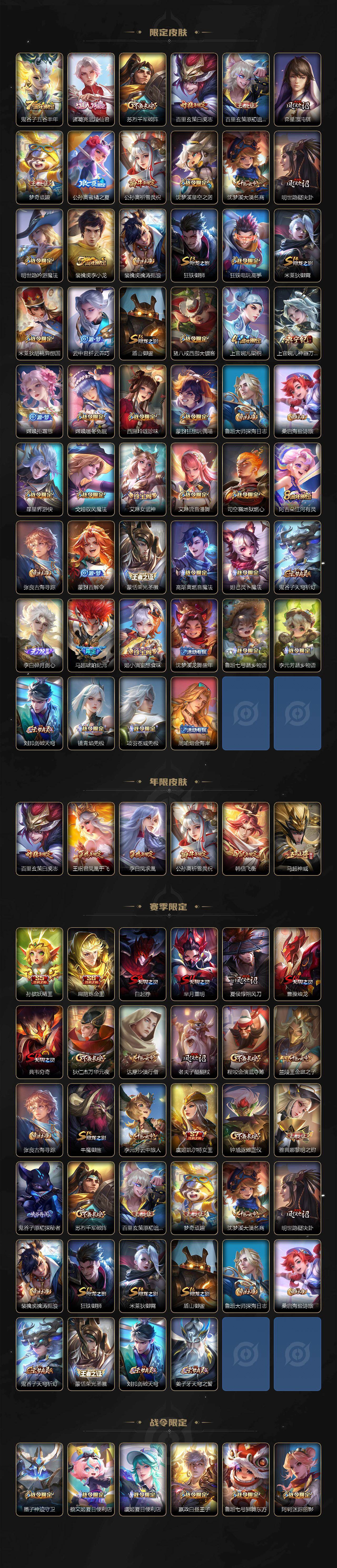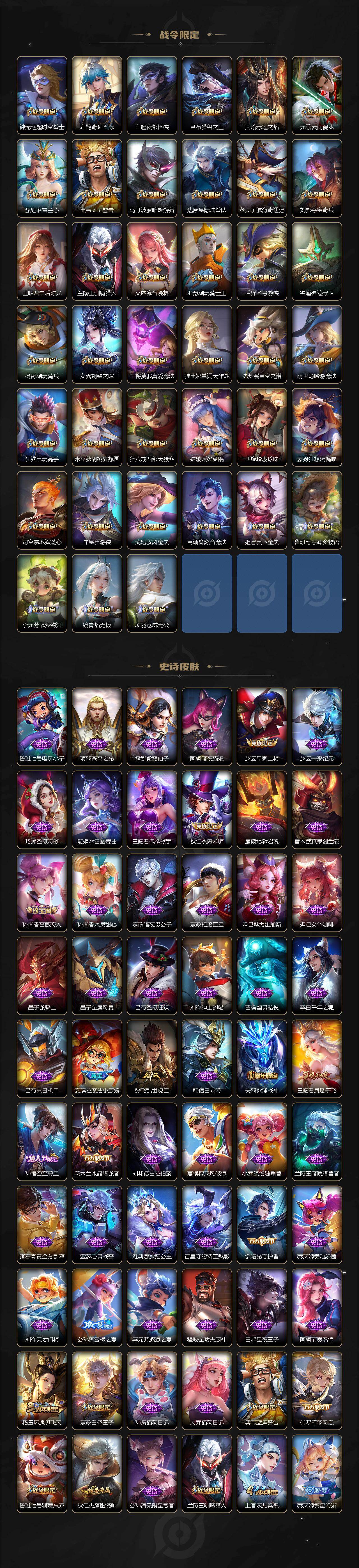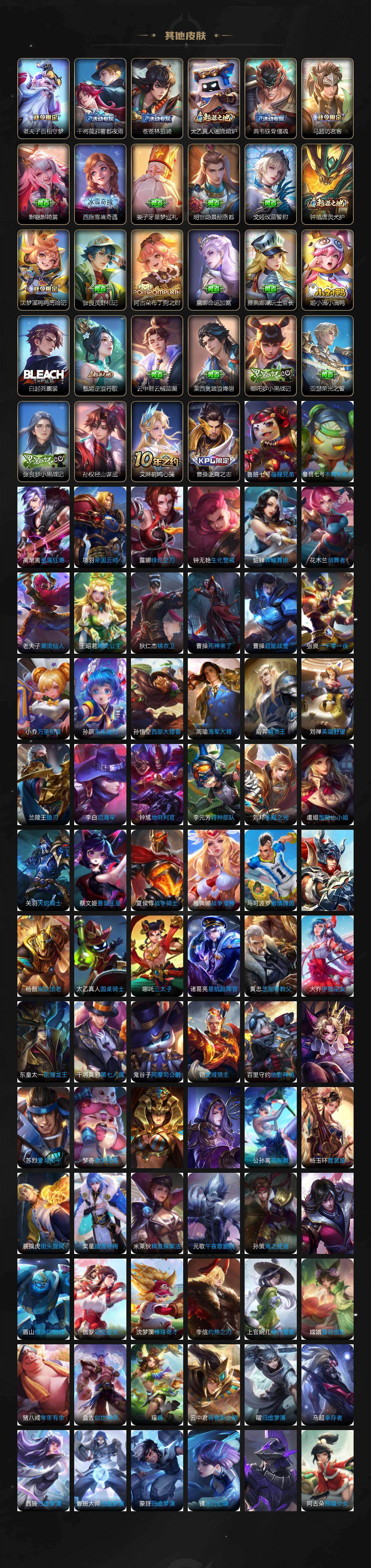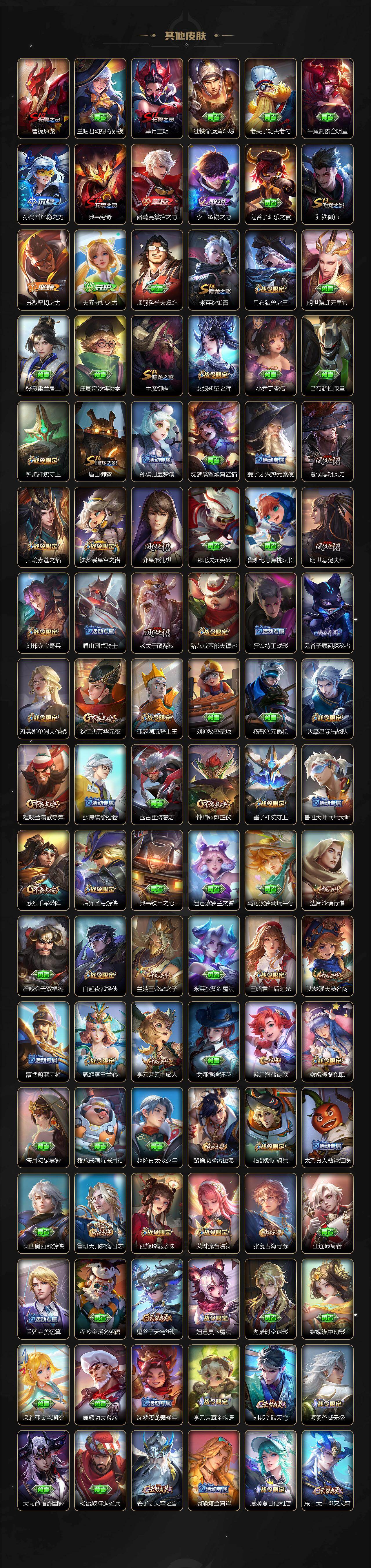 【限定皮肤】:白起狰,蒙犽顽岩魄,蔡文姬夏日便利店,虞姬夏日便利店,姜子牙天穹之誓,杨戬破阵退雄兵,狄仁杰阴阳师,虞姬凯尔特女王,赵云皇家上将,墨子神迹守卫,妲己时之彼端,嬴政白昼王子,孙尚香蔷薇恋人,孙尚香异界灵契,鲁班七号狮舞东方,庄周高山流水,高渐离死亡摇滚,阿轲迷踪丽影,钟无艳超时空战士,孙膑妖精王,扁鹊炼金王,扁鹊奇幻香踪,白起夜都怪侠,芈月重明,吕布猎兽之王,周瑜赤莲之焰,元歌云间偶戏,元歌无心,夏侯惇朔风刀,甄姬落雪兰心,曹操烛龙,典韦穷奇,典韦蓝屏警告,马可波罗暗影游猎,狄仁杰魔术师,狄仁杰万华元夜,达摩星际陆战队,达摩沙漠行僧,项羽海滩派对,老夫子醍醐杖,老夫子航海奇遇记,关羽冰锋战神,安琪拉魔法小厨娘,程咬金演武夺筹,刘邦夺宝奇兵,韩信飞衡,王昭君凤凰于飞,王昭君午后时光,兰陵王驯魔猎人,兰陵王金庭之子,亚瑟潮玩骑士王,孙悟空至尊宝,牛魔御旌,后羿圣弓游侠,李元芳云中旅人,虞姬启明星使,钟馗神迹守卫,钟馗驱傩正仪,杨玉环遇见飞天,杨戬潮玩骑兵,女娲朔望之晖,干将莫邪真爱魔法,雅典娜单词大作战,雅典娜黎明之约,蔡文姬繁星吟游,鬼谷子原初探秘者,鬼谷子五谷丰年,诸葛亮武陵仙君,苏烈千军破阵,百里玄策白虎志,百里玄策原初追逐者,弈星混沌棋,梦奇顽趣,公孙离蜜橘之夏,公孙离祈雪灵祝,沈梦溪星空之诺,沈梦溪大漠名商,明世隐疑决卦,明世隐吟游魔法,裴擒虎李小龙,裴擒虎擒涛扼浪,狂铁御狮,狂铁电玩高手,米莱狄御霄,米莱狄胡桃异想国,云中君纤云弄巧,盾山御銮,猪八戒西部大镖客,上官婉儿梁祝,上官婉儿神器万象笔,嫦娥拒霜思,嫦娥暖冬兔眠,西施玲珑珍味,蒙犽狂想玩偶喵,鲁班大师探海日志,桑启海盐诗旅,暃星界游侠,戈娅驭风魔法,艾琳女武神,艾琳流音漫舞,司空震地狱燃心,阿古朵江河有灵,张良古