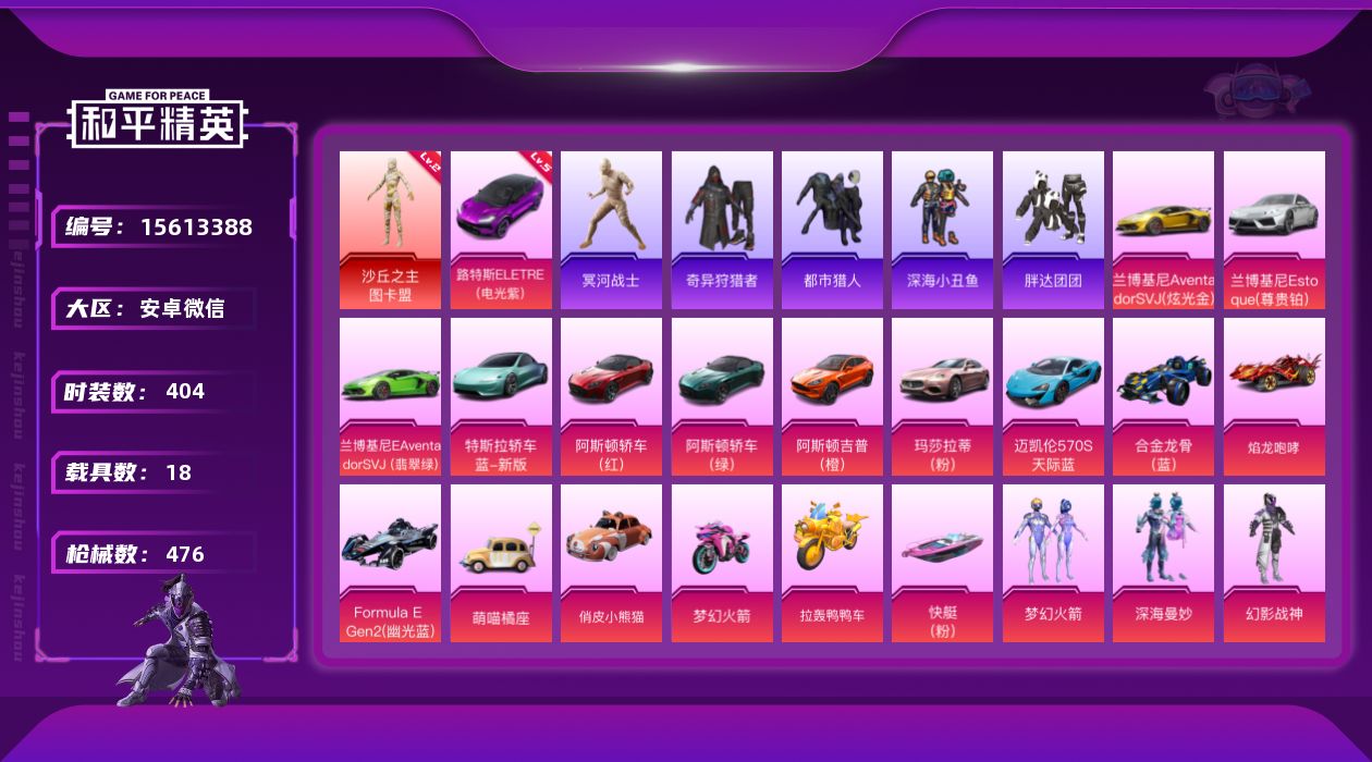 [15613388]木乃伊-29印记-双字ID-1神装-59粉装-33特效枪-18载具-23粉色飞行器-242692热力值-29王牌印记-404套装-476枪皮 【红色载具】:路特斯ELETRE(电光紫)(五级) 【红色神装等级】:沙丘之主-图卡盟(二级) 【热门品类】:粉装-梦幻火箭,套装-浪漫天命,套装-都市猎人,套装-冥河战士,套装-深海小丑鱼,套装-小丑鱼,套装-奇异狩猎者,角色-军刀雅典娜,套装-胖达团团,套装-金羽特工,套装-忍者信条,套装-暗夜行者,套装-龟仙人,套装-暗影哥特,套装-浪漫波比,套装-粉红小猪 【粉色套装】:粉装-深海曼妙,粉装-幻影战神,粉装-宝贝奶油派,粉装-水曜玄武,粉装-金曜白虎,粉装-蝶舞迷情,粉装-梦幻火箭,粉装-金属狂野,粉装-放客神游,粉装-古堡领主,粉装-天禅智恒,粉装-彗云及圣,粉装-狩月元帅,粉装-新星烈龙,粉装-向日葵,粉装-甜蜜誓约,粉装-心之恋语,粉装-极致幻想,粉装-潮汐统领,粉装-绚金战神,粉装-香水柠檬,粉装-绮梦青鸾,粉装-星之彼岸,粉装-甜梦冰蝶,粉装-馨动时刻,粉装-烈焰拳霸,粉装-虎啸骄阳,粉装-炙焰赤龙,粉装-飓风飞鹰,粉装-铁血龙王,粉装-桀骜红莲,粉装-焰龙焚天,粉装-银龙傲海,粉装-骨龙祭渊,粉装-暗夜玫瑰,角色-闪耀迪迦,角色-赛罗闪耀型,粉装-彩虹鹿灵,粉装-山涧鹿灵,角色-洛天依,粉装-沙场疾风,粉装-吟月归客,角色-零号机款机体服,角色-初号机款机体服,角色-2号机款机体服,粉装-青葱仙萝,粉装-天之羽翼,粉装-恐龙拽拽,粉装-橘柚倾心,粉装-冷魅冰骑,粉装-赤焰黑爵,粉装-紫电风暴,角色-复仇流浪者,粉装-垂柳戏鸭,粉装-第五大道,粉装-天星战神,角色-小叽联名款,玩偶服-猪猪侠,粉装-机械师花傲天 【粉色枪皮等级】:AKM-甜心宝贝(二级),AKM-炫紫旋律(一级),AKM-梦之光华(一级),AKM-百合蜜语(一级),AKM-盖世英雄(八级),M16A4-垂柳戏鸭(五级),SCAR-L-梦幻火箭(四级),SCAR-L-机甲封神(一级),SCAR-L-天蓬元帅(八级),M416-五爪金龙(六级),M416-心之恋语(三级),M416-风花雪月(四级),GROZA-香水柠檬(七级),AUG-星之彼岸(六级),M762-甜蜜誓约(一级),M762-冷魅冰骑(七级),UMP45-恐龙拽拽(六级),Ve