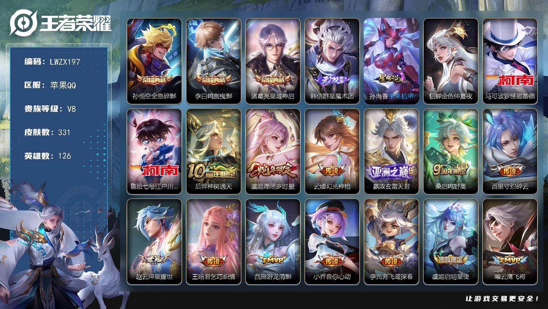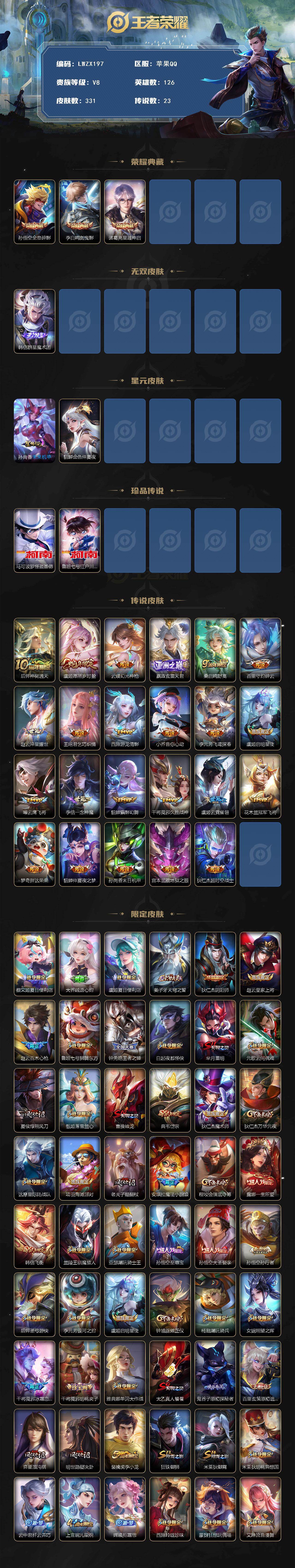 [15613414]可二次【特价出售/店主推荐】苹果Q-V8-最强王者段位-126英雄-331皮肤-3典藏皮肤-1无双-2珍品传说-23传说-93史诗-2星元