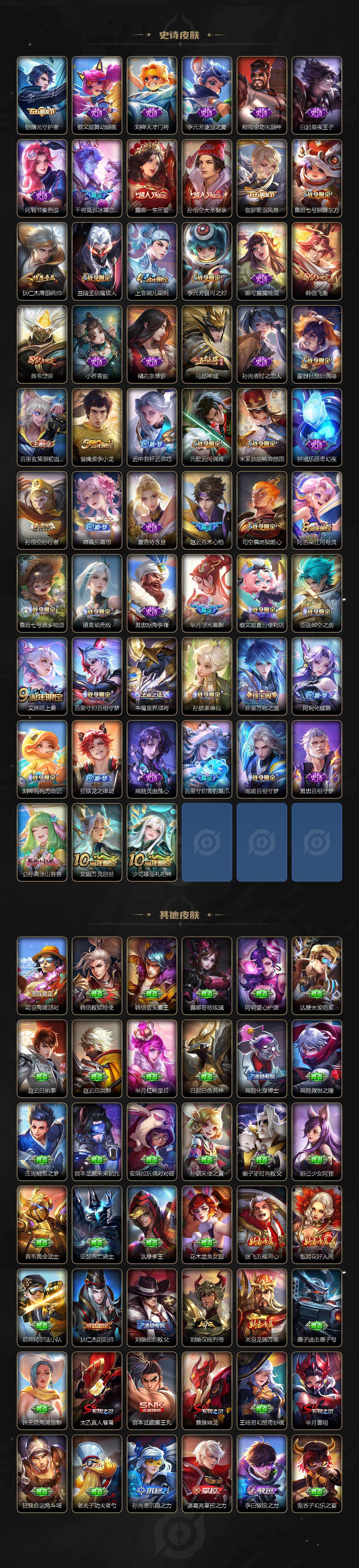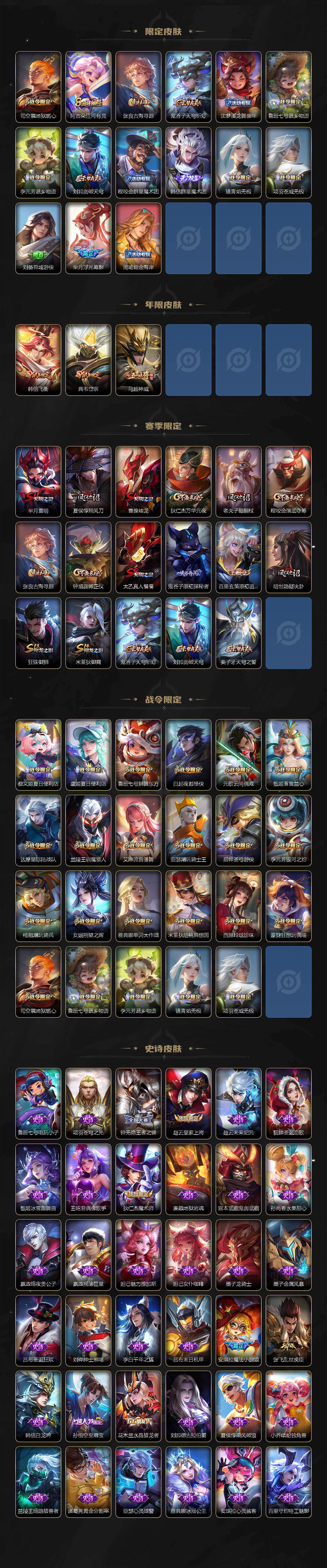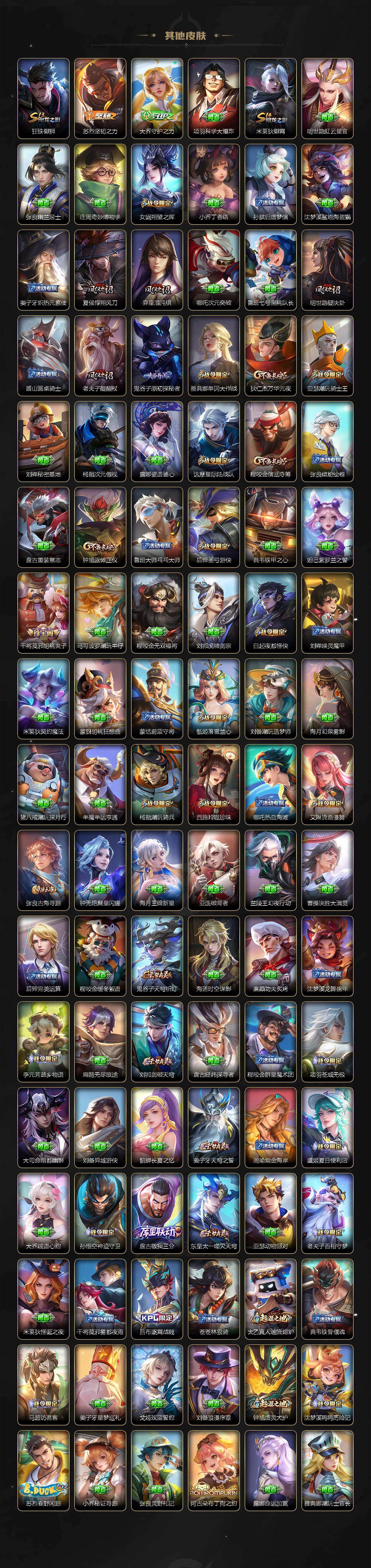 【限定皮肤】:蔡文姬夏日便利店,大乔绒语心约,虞姬夏日便利店,姜子牙天穹之誓,狄仁杰阴阳师,赵云皇家上将,赵云百木心枪,鲁班七号狮舞东方,钟无艳王者之锤,白起夜都怪侠,芈月重明,元歌云间偶戏,夏侯惇朔风刀,甄姬落雪兰心,曹操烛龙,典韦岱宗,狄仁杰魔术师,狄仁杰万华元夜,达摩星际陆战队,项羽海滩派对,老夫子醍醐杖,安琪拉魔法小厨娘,程咬金演武夺筹,露娜一生所爱,韩信飞衡,兰陵王驯魔猎人,亚瑟潮玩骑士王,孙悟空至尊宝,孙悟空大圣娶亲,孙悟空孙行者,后羿圣弓游侠,李元芳银河之约,虞姬启明星使,钟馗驱傩正仪,杨戬潮玩骑兵,女娲朔望之晖,干将莫邪冰霜恋舞曲,干将莫邪胡桃夹子,雅典娜单词大作战,太乙真人饕餮,鬼谷子原初探秘者,百里玄策原初追逐者,弈星混沌棋,明世隐疑决卦,裴擒虎李小龙,狂铁御狮,米莱狄御霄,米莱狄胡桃异想国,云中君纤云弄巧,上官婉儿梁祝,嫦娥拒霜思,西施玲珑珍味,蒙犽狂想玩偶喵,艾琳流音漫舞,司空震地狱燃心,阿古朵江河有灵,张良古海寻踪,鬼谷子天穹祈灯,沈梦溪龙舞盛年,鲁班七号蔬乡物语,李元芳蔬乡物语,刘邦剑破天穹,程咬金群星魔术团,韩信群星魔术团,镜青焰无极,项羽苍威无极,刘备异域游侠,芈月浮光幕影,周瑜熔金海岸
