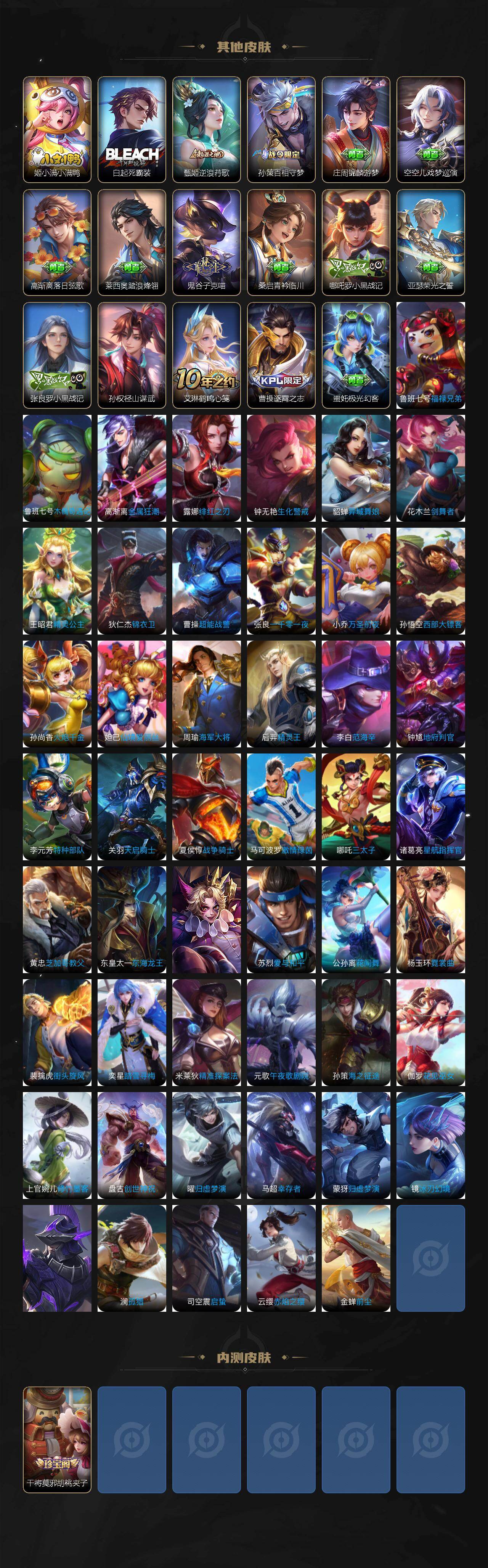 小乔青蛇,娜可露露晚萤,伽罗箭羽风息,李元芳逐浪之夏,阿轲节奏热浪,诸葛亮黄金分割率,王昭君偶像歌手,韩信白龙吟,项羽苍穹之光,孙尚香时之恋人,雅典娜冰冠公主,吕布末日机甲,鲁班七号电玩小子,橘右京修罗,墨子龙骑士,嬴政摇滚巨星,刘禅绅士熊喵,刘禅天才门将,白起星夜王子,安琪拉心灵骇客,程咬金功夫厨神,刘邦德古拉伯爵,兰陵王暗隐猎兽者,宫本武藏鬼剑武藏,亚瑟心灵战警,钟馗乐园奇幻夜,蔡文姬舞动绿茵,廉颇地狱岩魂,小乔缤纷独角兽,夏侯惇乘风破浪,花木兰水晶猎龙者,铠曙光守护者,墨子金属风暴,百里玄策原初追逐者,吕布圣诞狂欢,貂蝉圣诞恋歌,百里守约特工魅影,嬴政暗夜贵公子,嫦娥拒霜思,李白千年之狐,夏洛特永昼