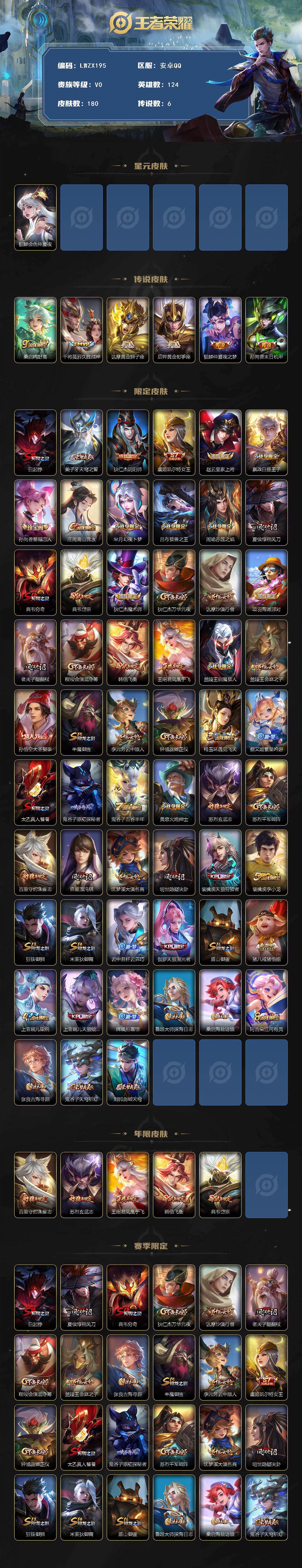 - [15146632]【店主推荐捡漏号!可直接换绑】安卓Q-V6-最强王者段位-125英雄-223皮肤-1典藏皮肤-7传说-50史诗 【英雄全皮】:影全皮 【荣耀典藏】:虞姬神鉴启示录 【传说皮肤】:澜愿照九州拓,云缨幻光神枪,桑启鸣野蒿,典韦战鼓燎原,澜逐花归海,曜云鹰飞将,宫本武藏地狱之眼 【限定皮肤】:大乔绒语心约,姜子牙天穹之誓,杨戬破阵退雄兵,狄仁杰阴阳师,赵云皇家上将,庄周高山流水,高渐离玩趣恶龙,元歌无心,马可波罗暗影游猎,狄仁杰魔术师,达摩沙漠行僧,项羽海滩派对,兰陵王金庭之子,李元芳云中旅人,钟馗驱傩正仪,干将莫邪胡桃夹子,苏烈千军破阵,沈梦溪大漠名商,裴擒虎李小龙,裴擒虎擒涛扼浪,云中君纤云弄巧,嫦娥拒霜思,鲁班大师探海日志,桑启海盐诗旅,司空震地狱燃心,阿古朵江河有灵,张良古海寻踪,蒙犽百解令,鬼谷子天穹祈灯,沈梦溪龙舞盛年,刘邦剑破天穹,程咬金群星魔术团,刘备异域游侠,周瑜熔金海岸 【赛季限定】:达摩沙漠行僧,兰陵王金庭之子,张良古海寻踪,李元芳云中旅人,钟馗驱傩正仪,苏烈千军破阵,沈梦溪大漠名商,裴擒虎擒涛扼浪,鲁班大师探海日志,桑启海盐诗旅,鬼谷子天穹祈灯,刘邦剑破天穹,姜子牙天穹之誓 【战令限定】:马可波罗暗影游猎,司空震地狱燃心 【史诗皮肤】:露娜紫霞仙子,赵云皇家上将,貂蝉圣诞恋歌,甄姬冰雪圆舞曲,王昭君偶像歌手,狄仁杰魔术师,宫本武藏鬼剑武藏,孙尚香水果甜心,嬴政摇滚巨星,妲己魅力维加斯,墨子金属风暴,吕布圣诞狂欢,刘禅绅士熊喵,李白千年之狐,韩信白龙吟,花木兰水晶猎龙者,夏侯惇乘风破浪,亚瑟心灵战警,安琪拉心灵骇客,百里守约特工魅影,铠曙光守护者,蔡文姬舞动绿茵,程咬金功夫厨神,阿轲节奏热浪,孙策猫狗日记,伽罗箭羽风息,狄仁杰鹰眼统帅,马可波罗暗影游猎,裴擒虎李小龙,云中君纤云弄巧,庄周高山流水,嫦娥拒霜思,元歌无心,司空震地狱燃心,阿古朵江河有灵,蒙犽百解令,百里守约百相守梦,牛魔星界战将,孙膑茶境仙,赵怀真器灵浮梦炉,狄仁杰绮世丹青,阿轲化蝶舞,狂铁龙之律动,周瑜百相守梦,黄忠百相守梦,西施织梦人,公孙离涂山容容,莱西奥光弋星穹,女娲万灵启世,少司缘巫礼祀神 【其他皮肤】:项羽海滩派对,韩信教廷特使,韩信街头霸王,赵云白执事,赵云忍炎影,芈月红桃皇后,白起白色死神,牛魔西部大镖客,扁鹊化身博士,扁鹊救世之瞳,宫本武藏未来纪元,安琪拉玩偶对对碰,