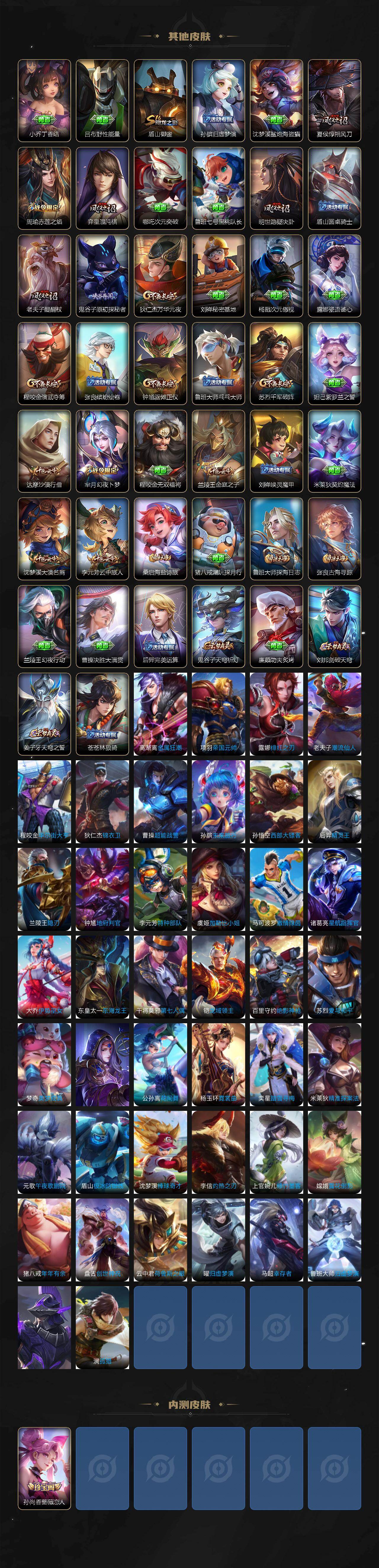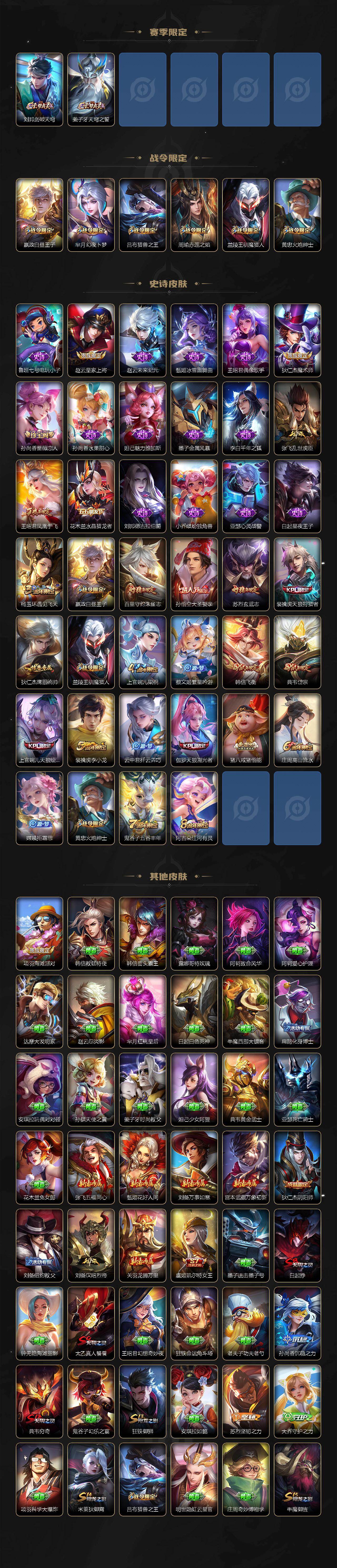 【赛季限定】:白起狰,夏侯惇朔风刀,典韦穷奇,狄仁杰万华元夜,达摩沙漠行僧,老夫子醍醐杖,程咬金演武夺筹,兰陵王金庭之子,张良古海寻踪,牛魔御旌,李元芳云中旅人,虞姬凯尔特女王,钟馗驱傩正仪,太乙真人饕餮,鬼谷子原初探秘者,苏烈千军破阵,弈星混沌棋,沈梦溪大漠名商,明世隐疑决卦,狂铁御狮,米莱狄御霄,盾山御銮,鲁班大师探海日志,桑启海盐诗旅,鬼谷子天穹祈灯,刘邦剑破天穹,姜子牙天穹之誓
