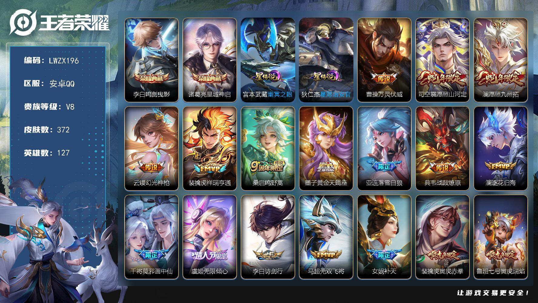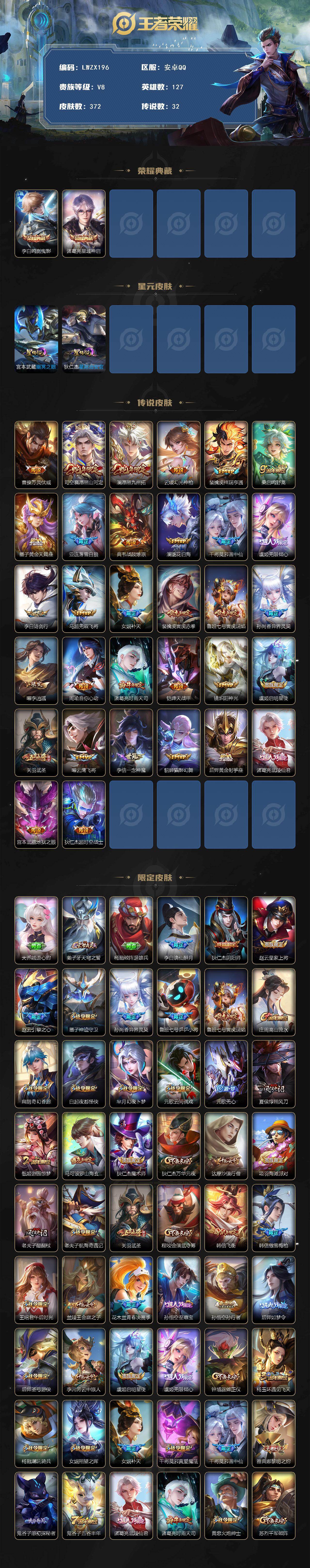 [15613458]【特价出售/店主推荐】安卓Q-V8-至尊星耀III段位-127英雄-372皮肤-2典藏皮肤-32传说-101史诗-2星元