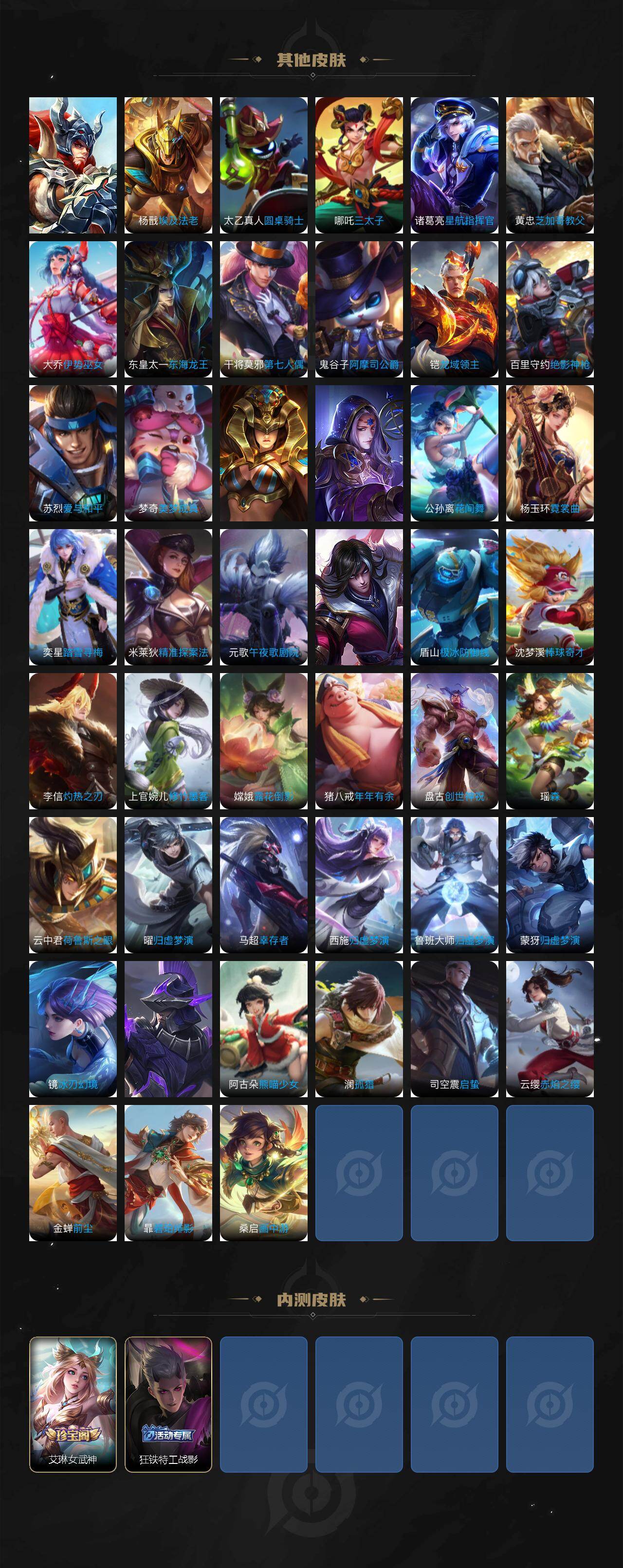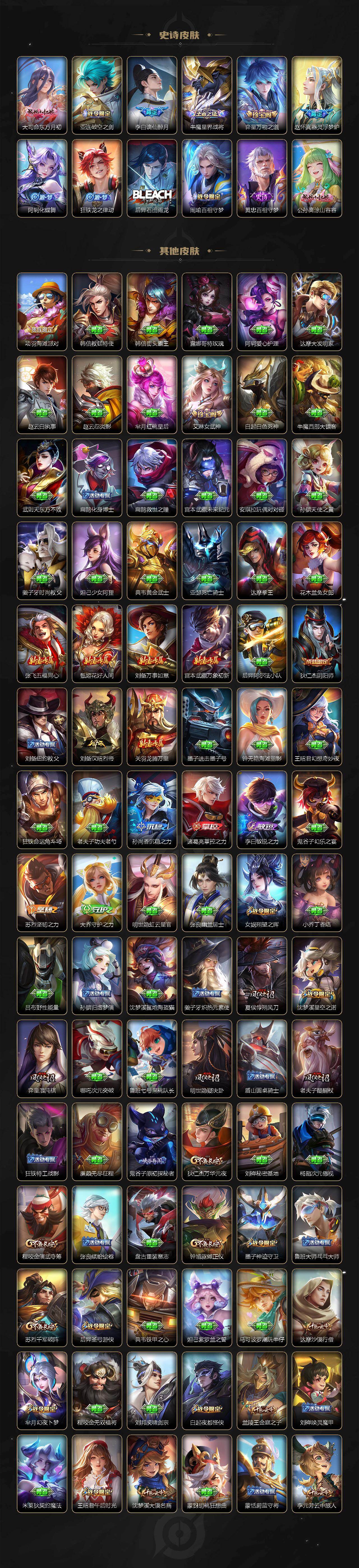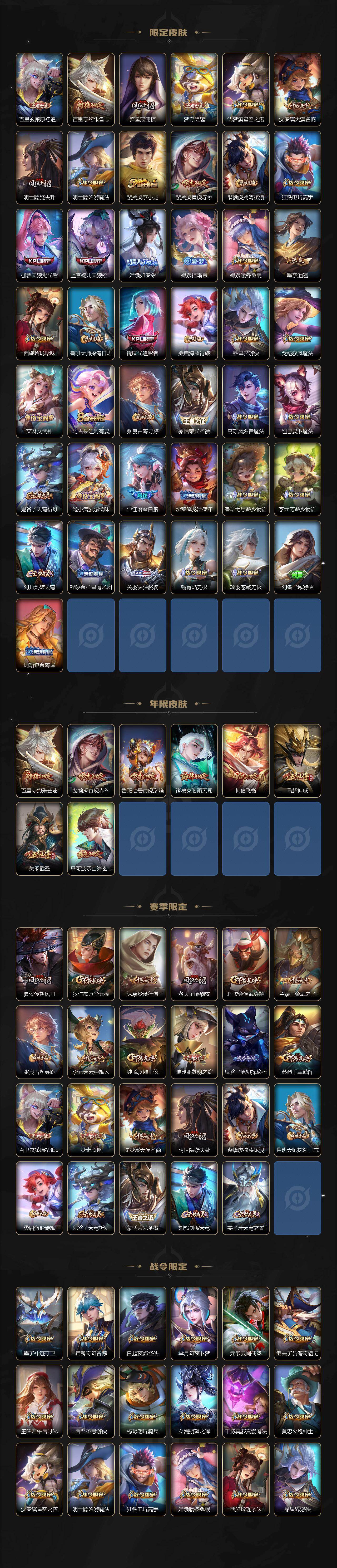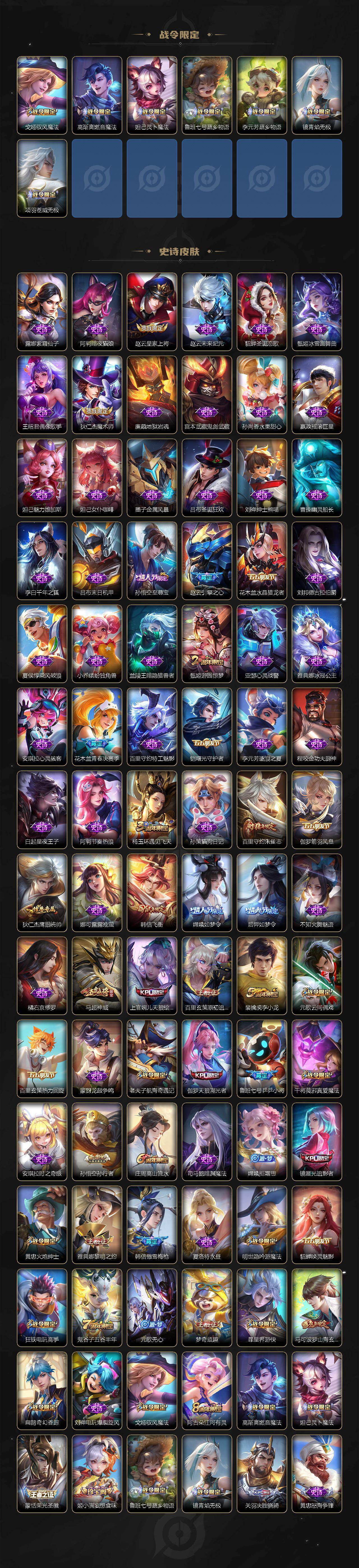 【限定皮肤】:大乔绒语心约,姜子牙天穹之誓,杨戬破阵退雄兵,李白谪仙醉月,狄仁杰阴阳师,赵云皇家上将,赵云引擎之心,墨子神迹守卫,孙尚香异界灵契,鲁班七号乒乒小将,鲁班七号寅虎瑞焰,庄周高山流水,扁鹊奇幻香踪,白起夜都怪侠,芈月幻夜卜梦,元歌云间偶戏,元歌无心,夏侯惇朔风刀,甄姬游园惊梦,马可波罗山海玄木吟,狄仁杰魔术师,狄仁杰万华元夜,达摩沙漠行僧,项羽海滩派对,老夫子醍醐杖,老夫子航海奇遇记,关羽武圣,程咬金演武夺筹,韩信飞衡,韩信傲雪梅枪,王昭君午后时光,兰陵王金庭之子,花木兰青春决赛季,孙悟空至尊宝,孙悟空孙行者,后羿如梦令,后羿圣弓游侠,李元芳云中旅人,虞姬启明星使,虞姬无限倾心,钟馗驱傩正仪,杨玉环遇见飞天,杨戬潮玩骑兵,女娲朔望之晖,女娲补天,干将莫邪真爱魔法,干将莫邪画中仙,雅典娜黎明之约,鬼谷子原初探秘者,鬼谷子五谷丰年,诸葛亮武陵仙君,诸葛亮时雨天司,黄忠火炮绅士,苏烈千军破阵,百里玄策原初追逐者,百里守约朱雀志,弈星混沌棋,梦奇顽趣,沈梦溪星空之诺,沈梦溪大漠名商,明世隐疑决卦,明世隐吟游魔法,裴擒虎李小龙,裴擒虎寅虎赤拳,裴擒虎擒涛扼浪,狂铁电玩高手,伽罗天狼溯光者,上官婉儿天狼绘梦者,嫦娥如梦令,嫦娥拒霜思,嫦娥暖冬兔眠,曜李逍遥 ,西施玲珑珍味,鲁班大师探海日志,镜匿光追影者,桑启海盐诗旅,暃星界游侠,戈娅驭风魔法,艾琳女武神,阿古朵江河有灵,张良古海寻踪,蒙恬荣光圣徽,高渐离燃音魔法,妲己灵卜魔法,鬼谷子天穹祈灯,姬小满妄想食味,亚连落雪白狼,沈梦溪龙舞盛年,鲁班七