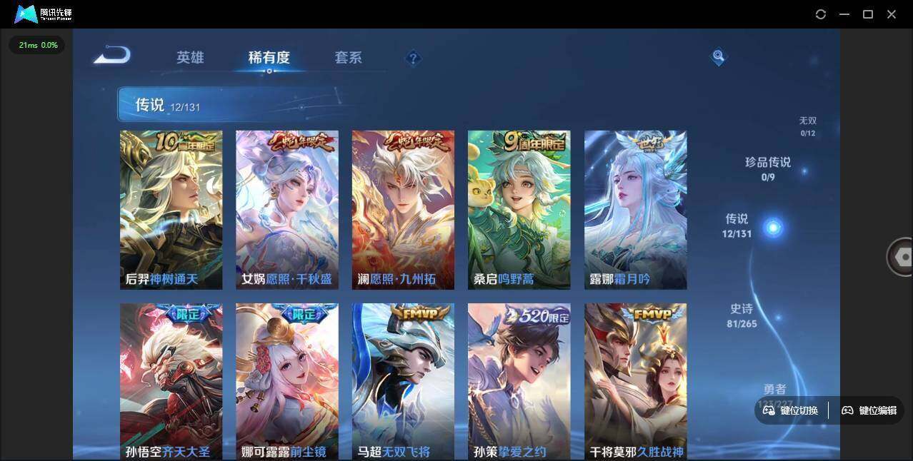 【传说皮肤】:后羿神树通天,女娲愿照千秋盛,澜愿照九州拓,桑启鸣野蒿,露娜霜月吟,孙悟空齐天大圣,娜可露露前尘镜,马超无双飞将,孙策挚爱之约,干将莫邪久胜战神,达摩黄金狮子座,貂蝉仲夏夜之梦