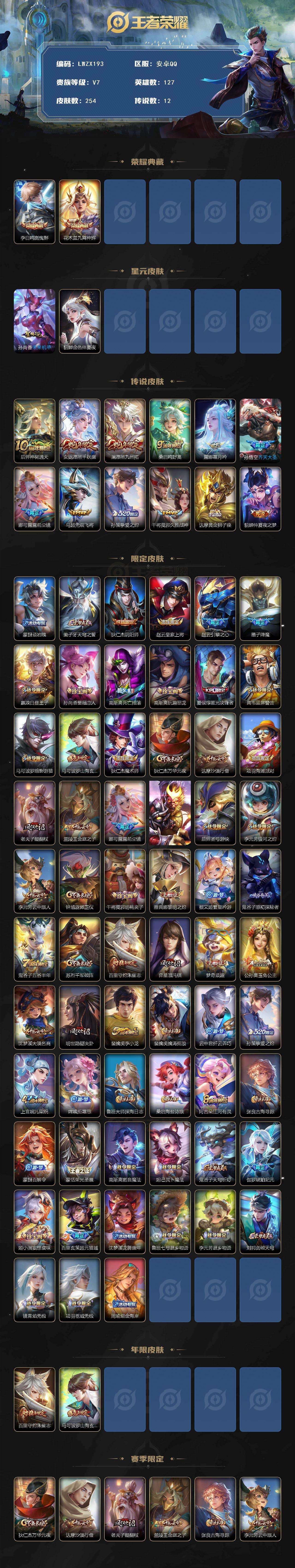 [15613472]【特价出售/店主推荐】安卓Q-V7-最强王者段位-127英雄-254皮肤-2典藏皮肤-12传说-81史诗-2星元