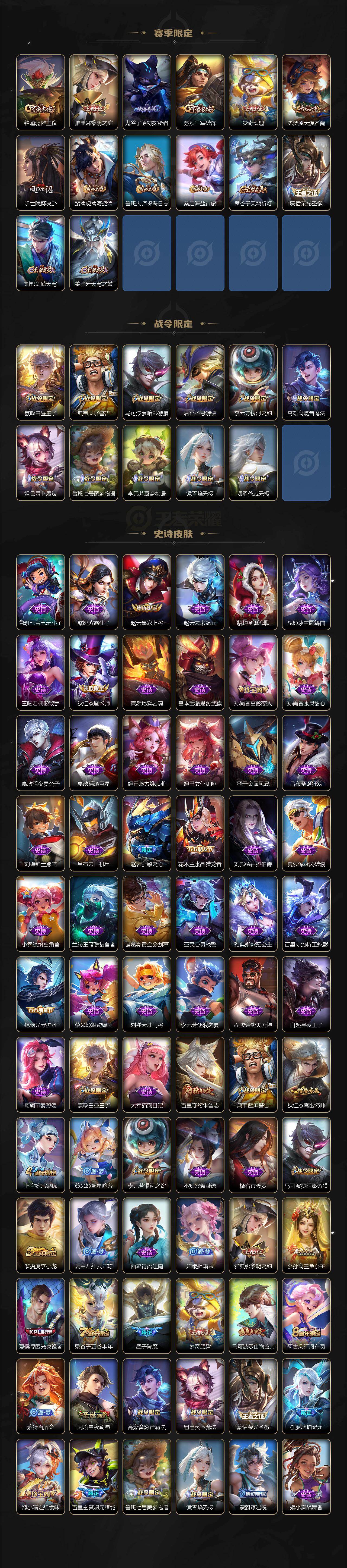 【赛季限定】:狄仁杰万华元夜,达摩沙漠行僧,老夫子醍醐杖,兰陵王金庭之子,张良古海寻踪,李元芳云中旅人,钟馗驱傩正仪,雅典娜黎明之约,鬼谷子原初探秘者,苏烈千军破阵,弈星混沌棋,梦奇顽趣,沈梦溪大漠名商,明世隐疑决卦,裴擒虎擒涛扼浪,鲁班大师探海日志,桑启海盐诗旅,鬼谷子天穹祈灯,蒙恬荣光圣徽,刘邦剑破天穹,姜子牙天穹之誓