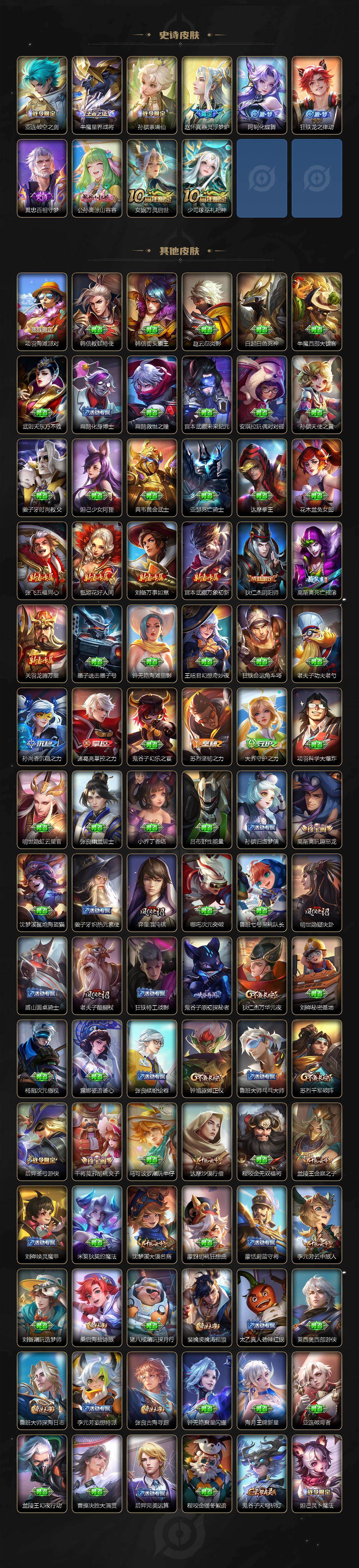 【限定皮肤】:蒙犽顽岩魄,姜子牙天穹之誓,狄仁杰阴阳师,赵云皇家上将,赵云引擎之心,墨子降魔,嬴政白昼王子,孙尚香蔷薇恋人,高渐离死亡摇滚,高渐离玩趣恶龙,夏侯惇匿光决锋者,典韦蓝屏警告,马可波罗暗影游猎,马可波罗山海玄木吟,狄仁杰魔术师,狄仁杰万华元夜,达摩沙漠行僧,项羽海滩派对,老夫子醍醐杖,兰陵王金庭之子,娜可露露前尘镜,孙悟空齐天大圣,后羿圣弓游侠,李元芳银河之约,李元芳云中旅人,钟馗驱傩正仪,干将莫邪胡桃夹子,雅典娜黎明之约,蔡文姬繁星吟游,鬼谷子原初探秘者,鬼谷子五谷丰年,苏烈千军破阵,百里守约朱雀志,弈星混沌棋,梦奇顽趣,公孙离玉兔公主,沈梦溪大漠名商,明世隐疑决卦,裴擒虎李小龙,裴擒虎擒涛扼浪,云中君纤云弄巧,孙策挚爱之约,上官婉儿梁祝,嫦娥拒霜思,鲁班大师探海日志,桑启海盐诗旅,阿古朵江河有灵,张良古海寻踪,蒙犽百解令,蒙恬荣光圣徽,高渐离燃音魔法,妲己灵卜魔法,鬼谷子天穹祈灯,伽罗琥珀纪元,姬小满妄想食味,百里玄策超元猎域,沈梦溪龙舞盛年,鲁班七号蔬乡物语,李元芳蔬乡物语,刘邦剑破天穹,镜青焰无极,项羽苍威无极,周瑜熔金海岸
