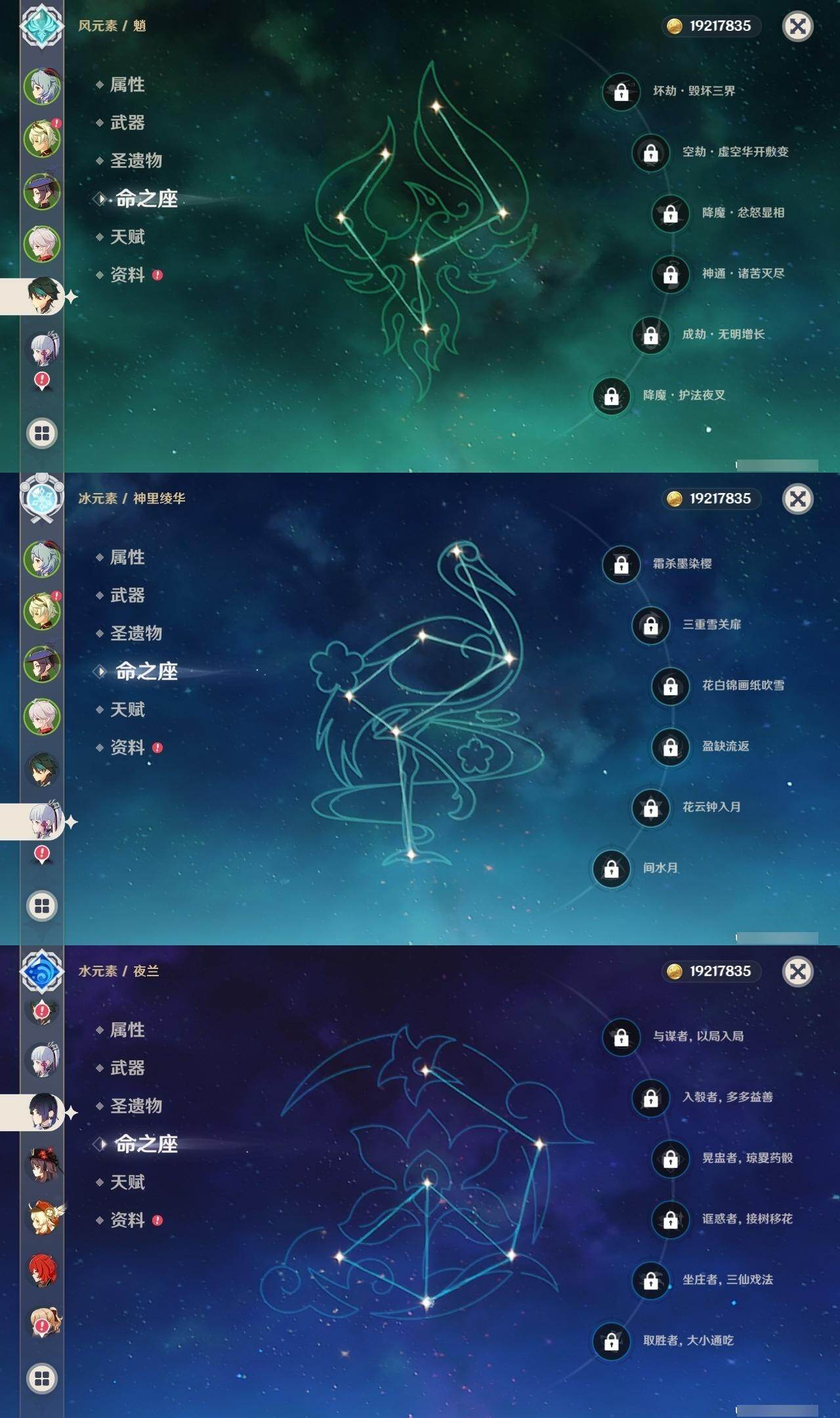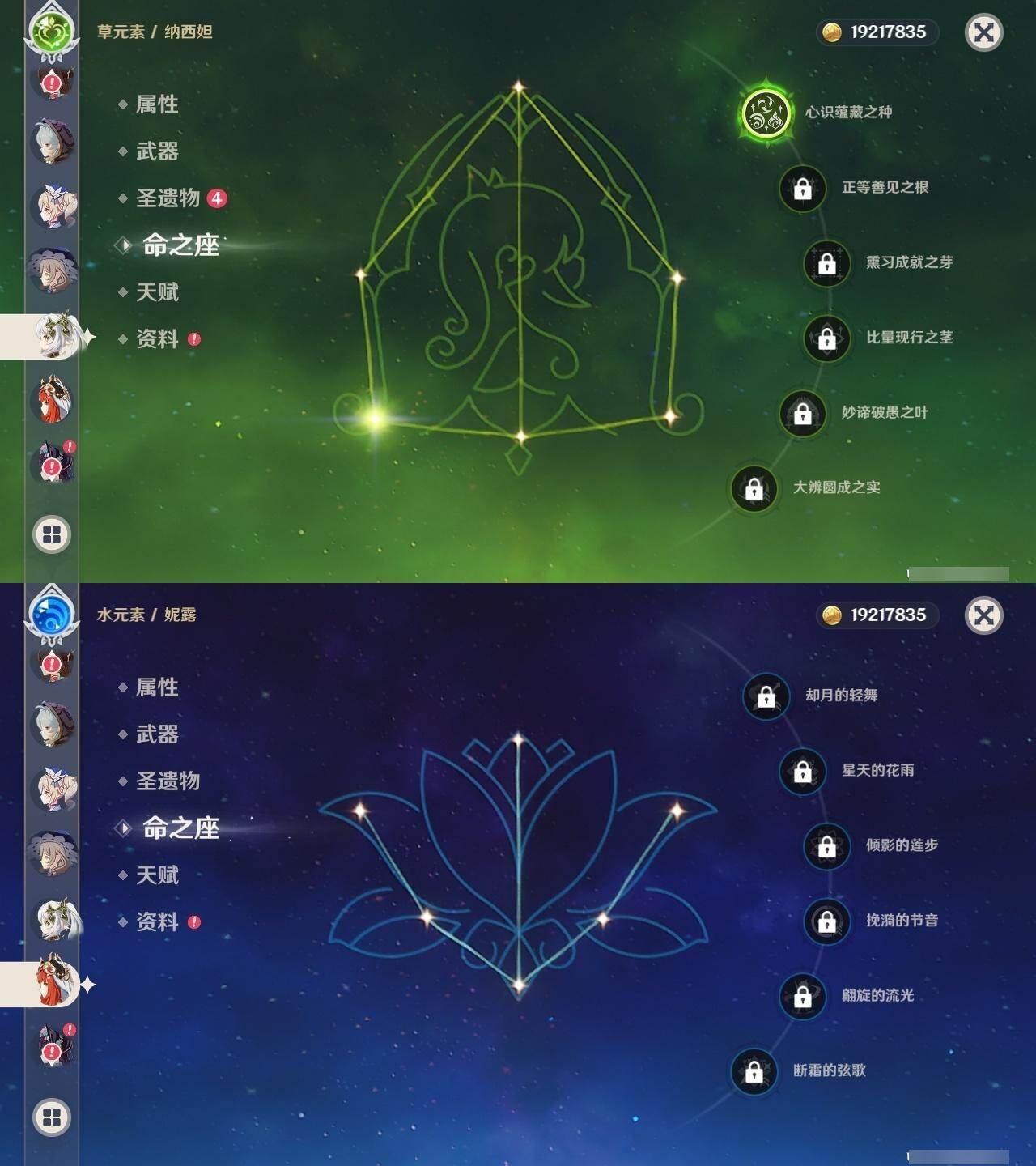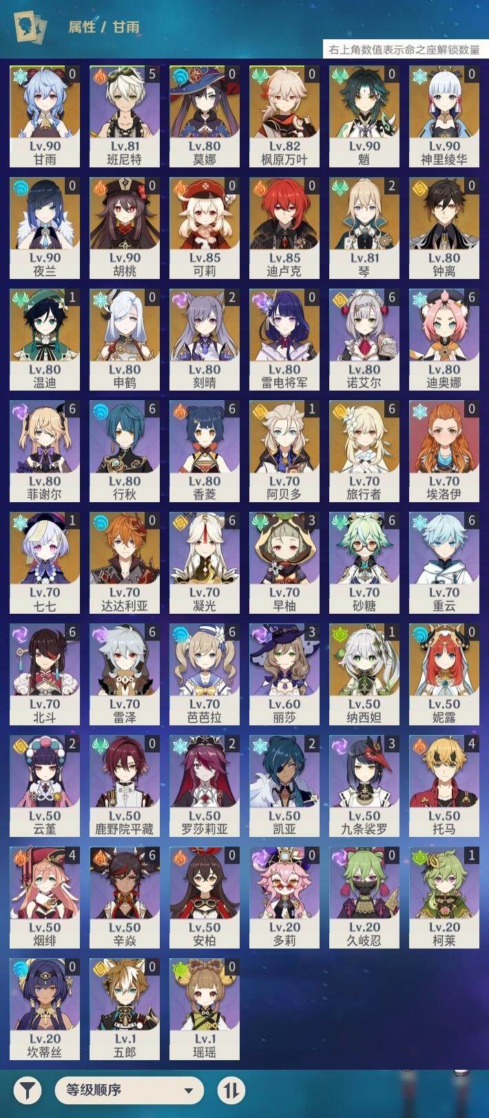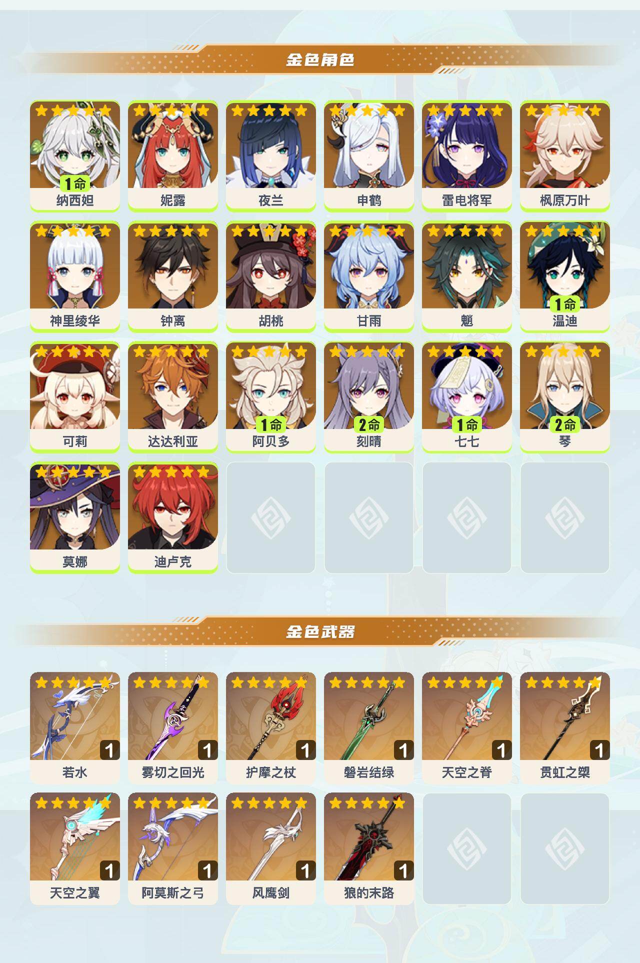 1命纳西妲,0命妮露,0命夜兰,0命申鹤,0命雷电将军,0命枫原万叶,0命神里绫华,0命钟离,0命胡桃,0命甘雨,0命魈,1命温迪,0命可莉,0命达达利亚,1命阿贝多,2命刻晴,1命七七,2命琴,0命莫娜,0命迪卢克,精1若水,精1雾切之回光,精1护摩之杖,精1磐岩结绿,精1天空之脊,精1贯虹之槊,精1天空之翼,精1阿莫斯之弓,精1风鹰剑,精1狼的末路