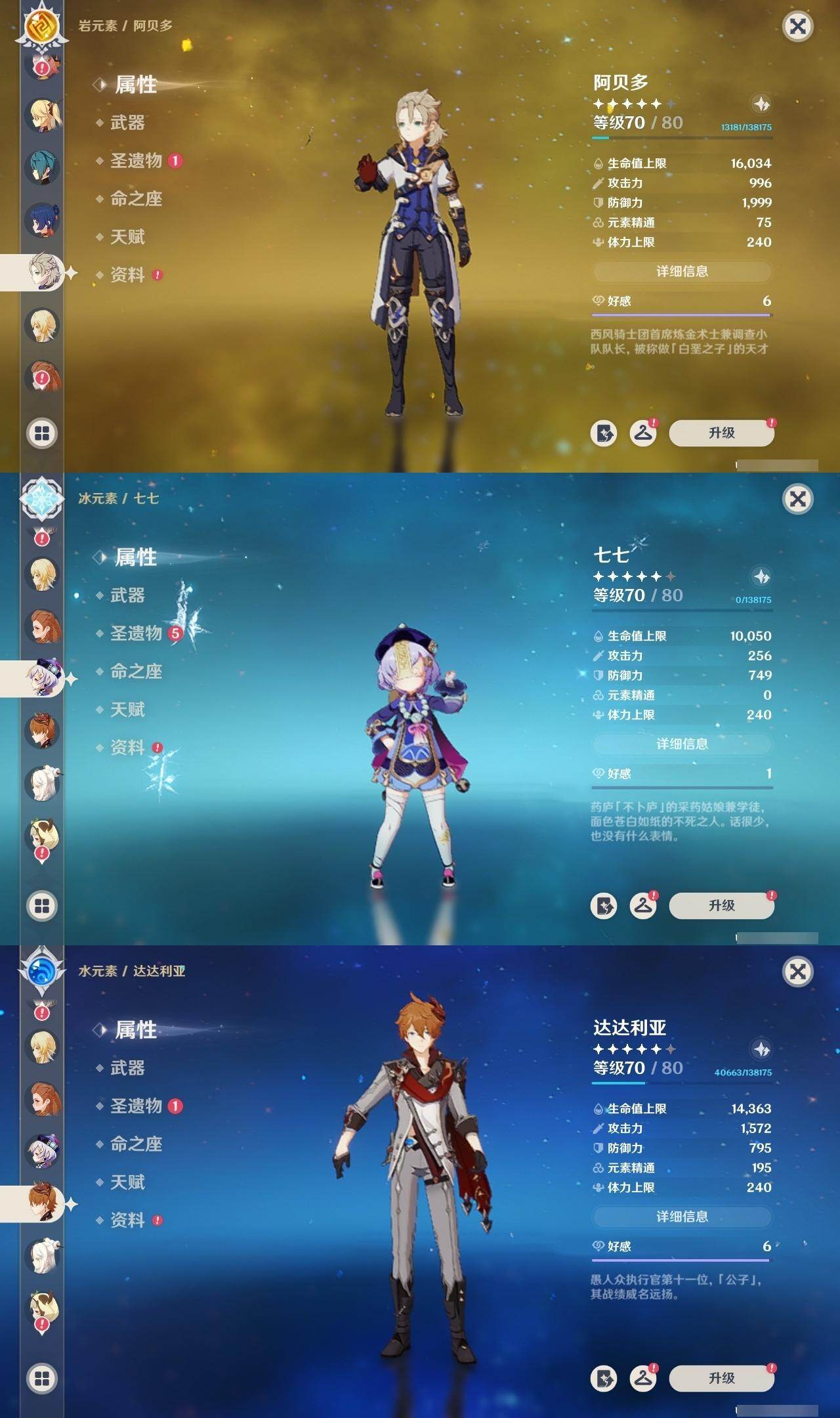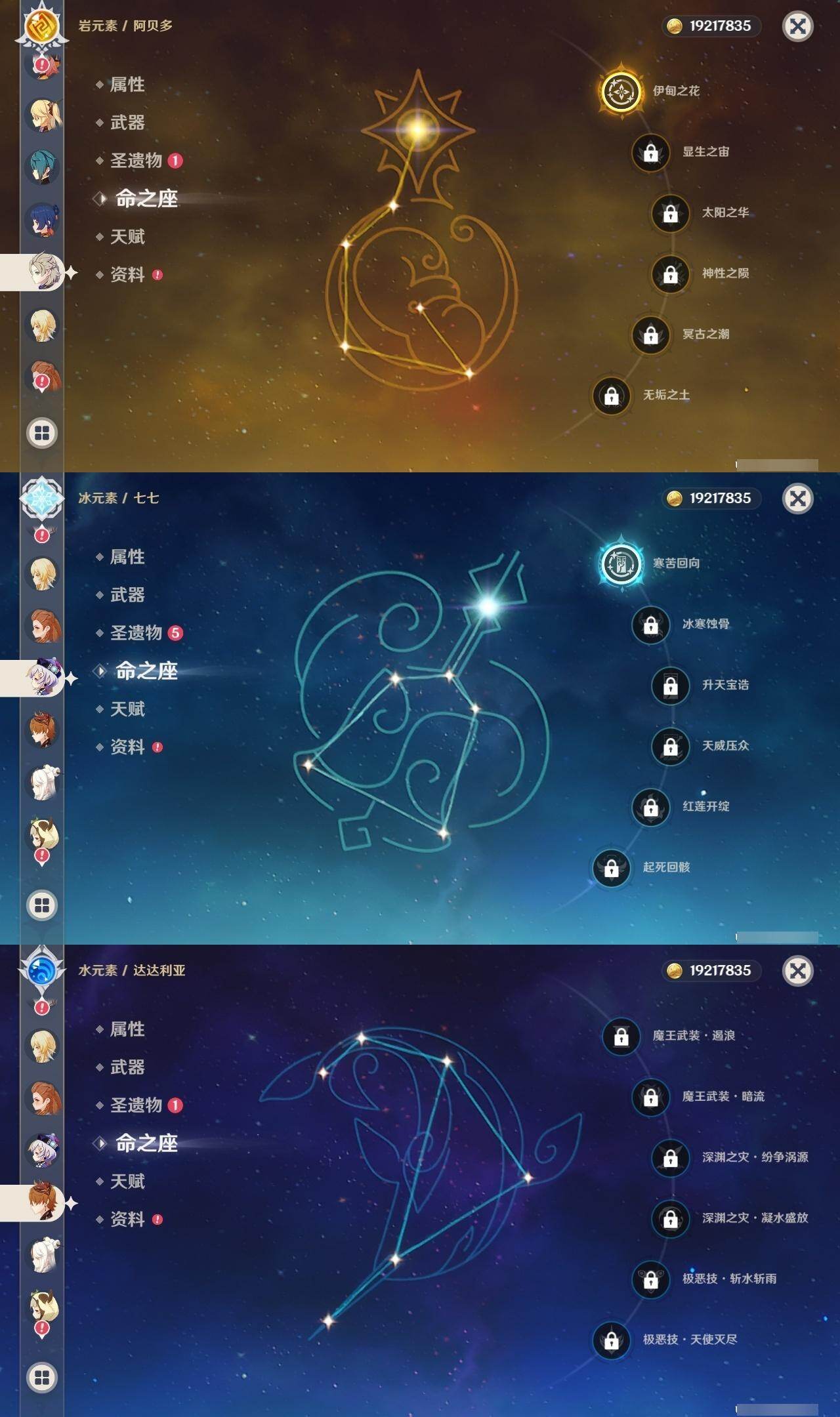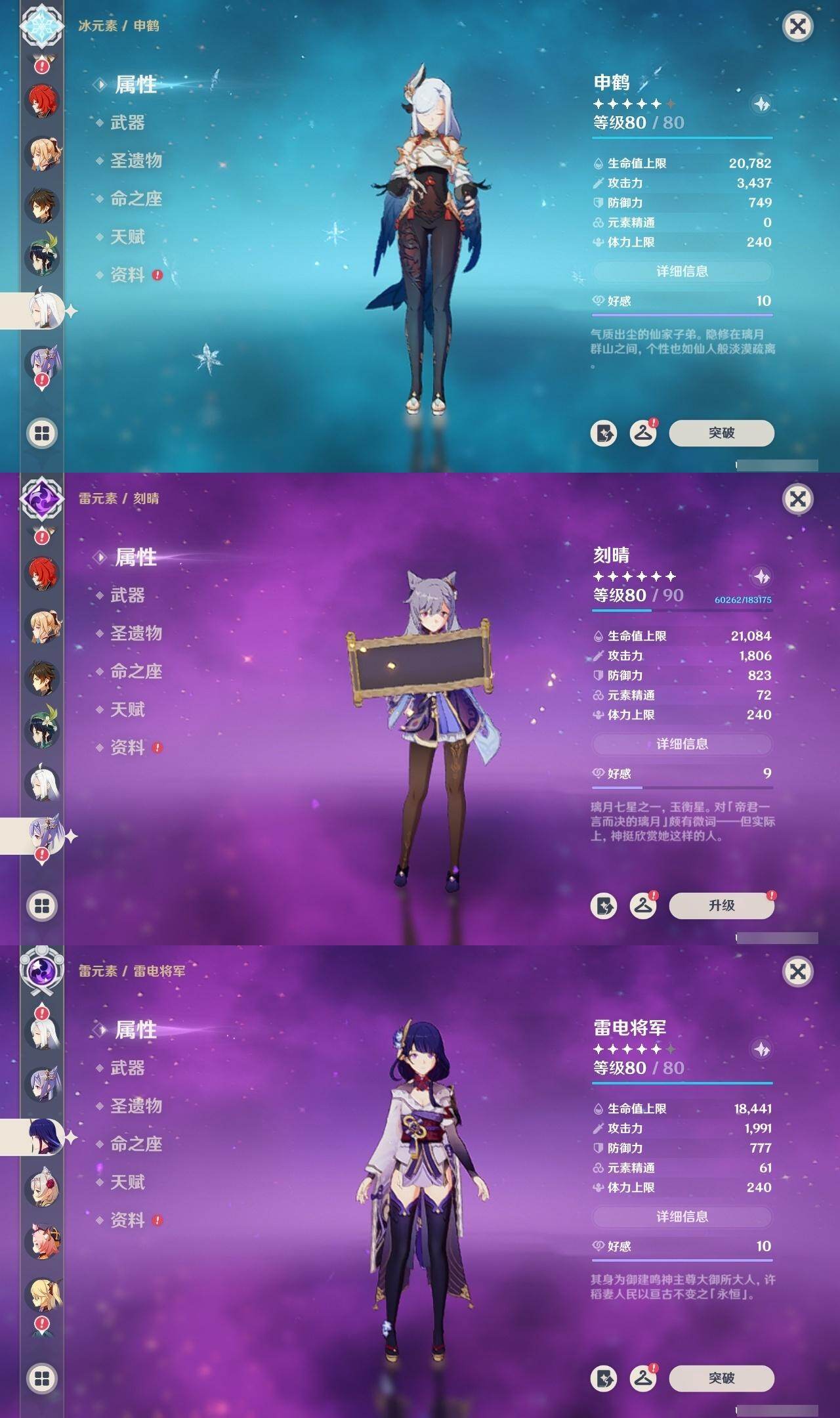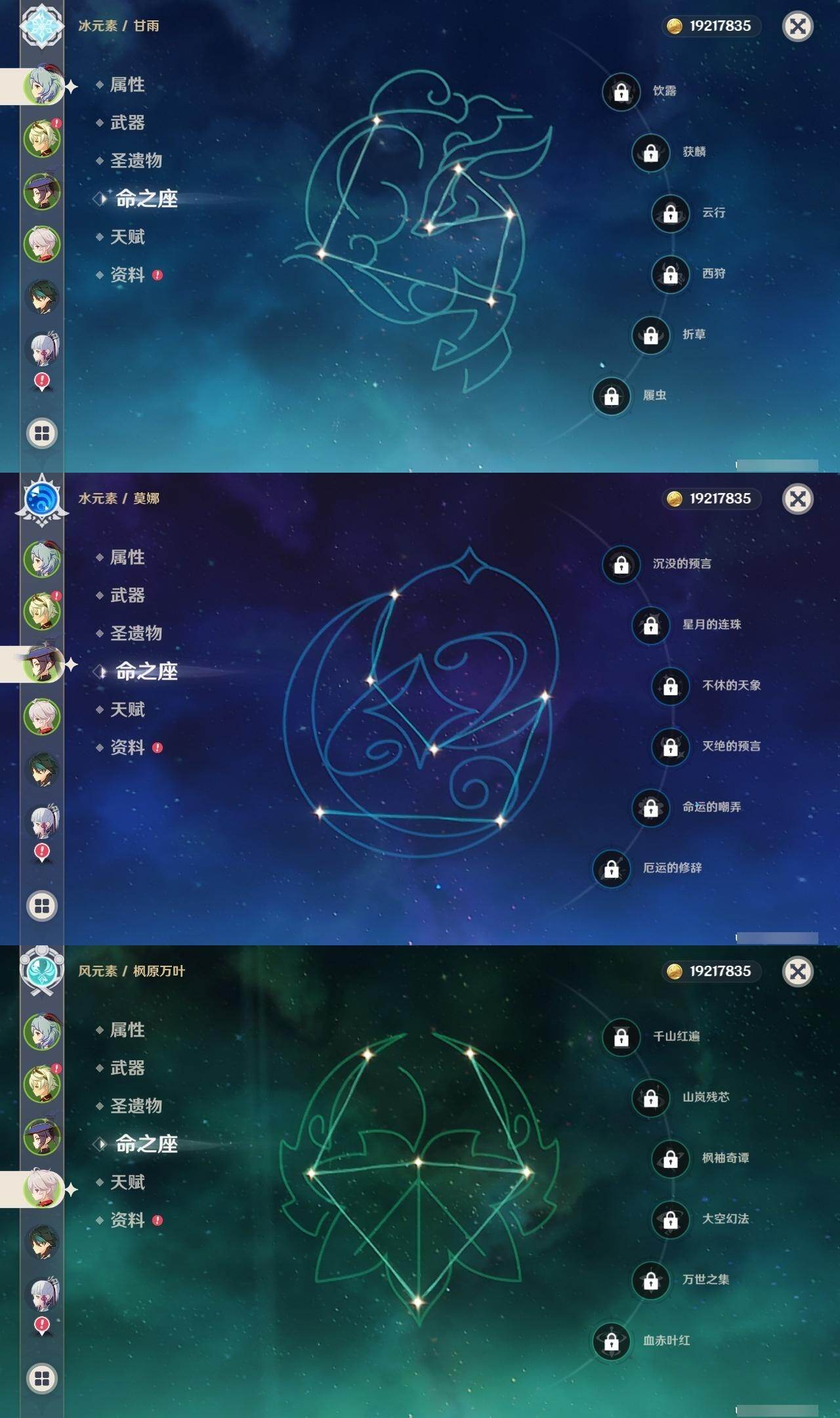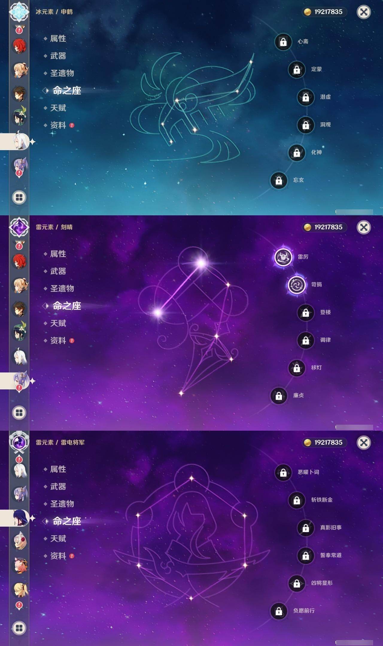 1命纳西妲,0命妮露,0命夜兰,0命申鹤,0命雷电将军,0命枫原万叶,0命神里绫华,0命钟离,0命胡桃,0命甘雨,0命魈,1命温迪,0命可莉,0命达达利亚,1命阿贝多,2命刻晴,1命七七,2命琴,0命莫娜,0命迪卢克,精1若水,精1雾切之回光,精1护摩之杖,精1磐岩结绿,精1天空之脊,精1贯虹之槊,精1天空之翼,精1阿莫斯之弓,精1风鹰剑,精1狼的末路
