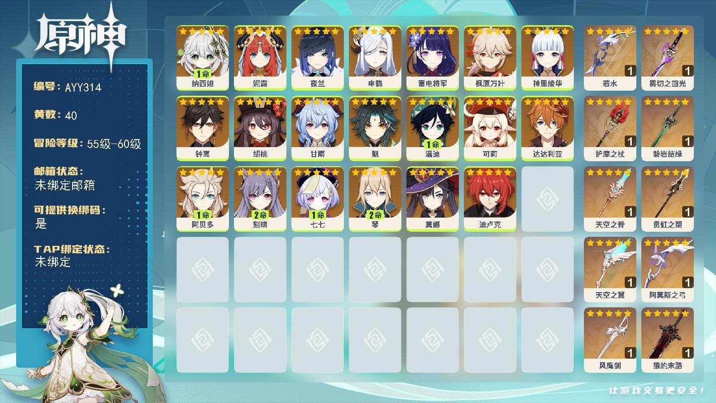 [15613549]59级/40黄/女主/20个五星角色/12个五星武器 1命纳西妲,0命妮露,0命夜兰,0命申鹤,0命雷电将军,0命枫原万叶,0命神里绫华,0命钟离,0命胡桃,0命甘雨,0命魈,1命温迪,0命可莉,0命达达利亚,1命阿贝多,2命刻晴,1命七七,2命琴,0命莫娜,0命迪卢克,精1若水,精1雾切之回光,精1护摩之杖,精1磐岩结绿,精1天空之脊,精1贯虹之槊,精1天空之翼,精1阿莫斯之弓,精1风鹰剑,精1狼的末路