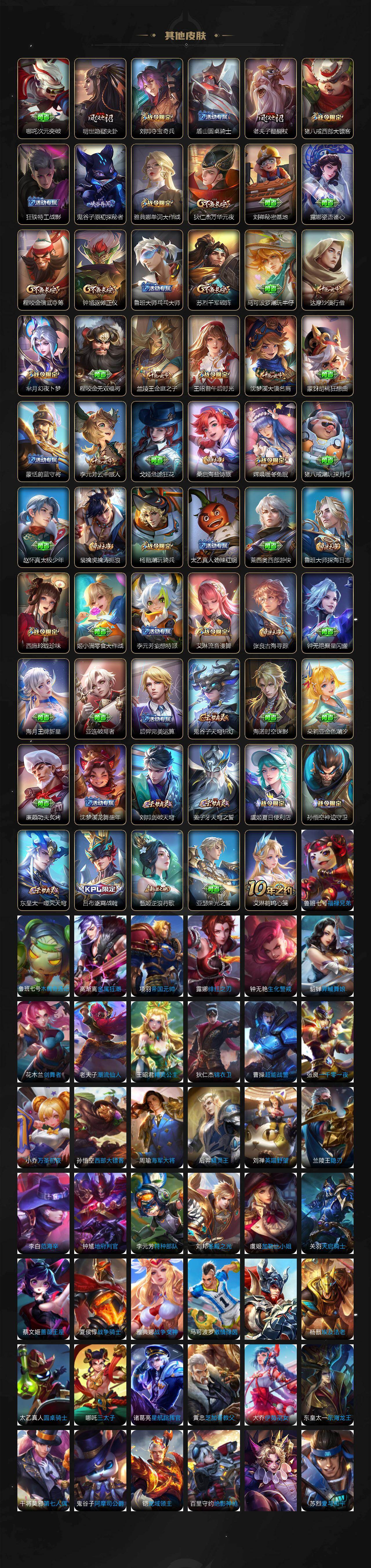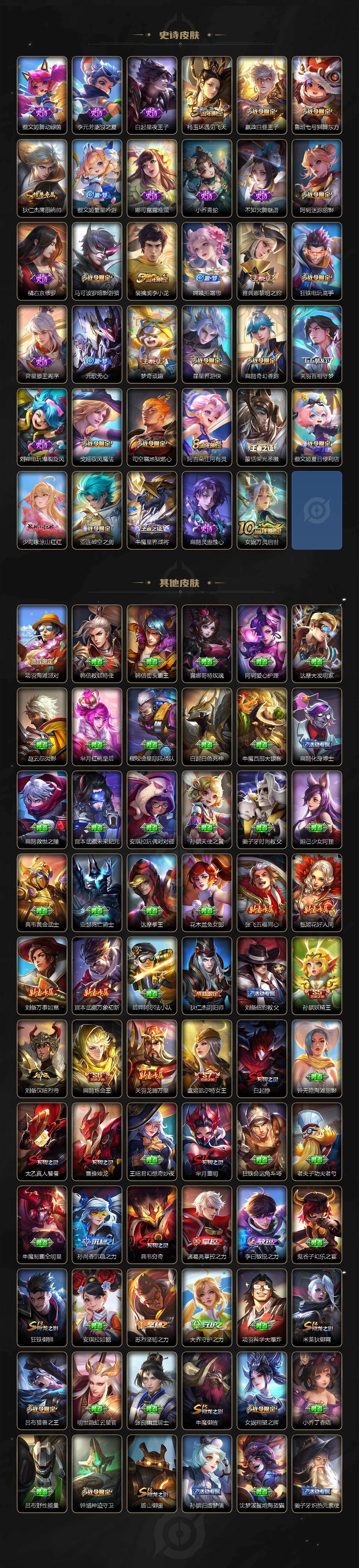【限定皮肤】:白起狰,蔡文姬夏日便利店,虞姬夏日便利店,姜子牙天穹之誓,狄仁杰阴阳师,虞姬凯尔特女王,赵云皇家上将,嬴政优雅恋人,嬴政白昼王子,孙尚香蔷薇恋人,鲁班七号狮舞东方,阿轲迷踪丽影,孙膑妖精王,扁鹊炼金王,扁鹊奇幻香踪,芈月重明,芈月幻夜卜梦,吕布猎兽之王,元歌无心,曹操烛龙,典韦穷奇,马可波罗暗影游猎,马可波罗妄想实况,狄仁杰魔术师,狄仁杰万华元夜,达摩沙漠行僧,项羽海滩派对,老夫子醍醐杖,关羽百相守梦,貂蝉逐梦之音,程咬金演武夺筹,刘邦夺宝奇兵,王昭君午后时光,兰陵王金庭之子,牛魔御旌,后羿辉光之辰,李元芳云中旅人,虞姬启明星使,钟馗神迹守卫,钟馗驱傩正仪,杨玉环遇见飞天,杨戬潮玩骑兵,女娲朔望之晖,雅典娜单词大作战,雅典娜黎明之约,蔡文姬繁星吟游,太乙真人饕餮,鬼谷子原初探秘者,苏烈千军破阵,梦奇顽趣,沈梦溪大漠名商,明世隐疑决卦,裴擒虎李小龙,裴擒虎擒涛扼浪,狂铁御狮,狂铁电玩高手,米莱狄御霄,盾山御銮,猪八戒西部大镖客,嫦娥拒霜思,嫦娥暖冬兔眠,西施玲珑珍味,鲁班大师探海日志,桑启海盐诗旅,暃星界游侠,戈娅驭风魔法,艾琳流音漫舞,司空震地狱燃心,阿古朵江河有灵,张良古海寻踪,蒙恬荣光圣徽,鬼谷子天穹祈灯,沈梦溪龙舞盛年,刘邦剑破天穹