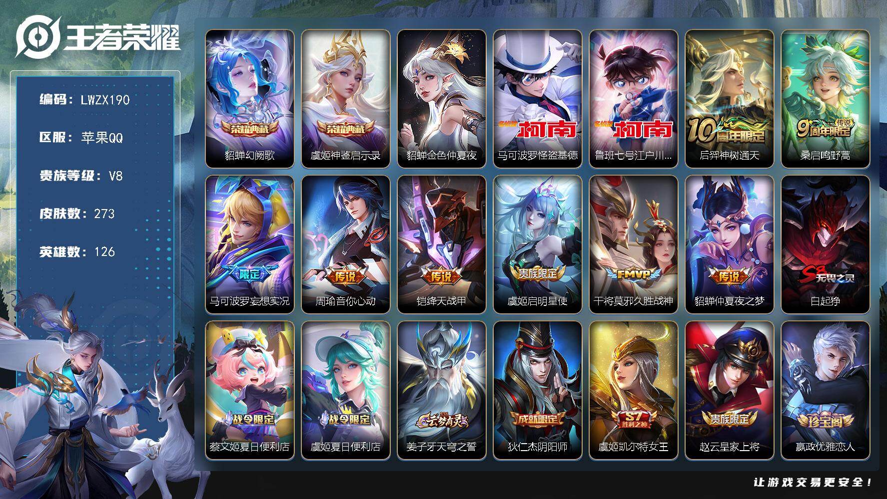 [15613521]【特价出售/店主推荐】苹果Q-V8-最强王者段位-126英雄-273皮肤-2典藏皮肤-2珍品传说-8传说-65史诗-1星元
