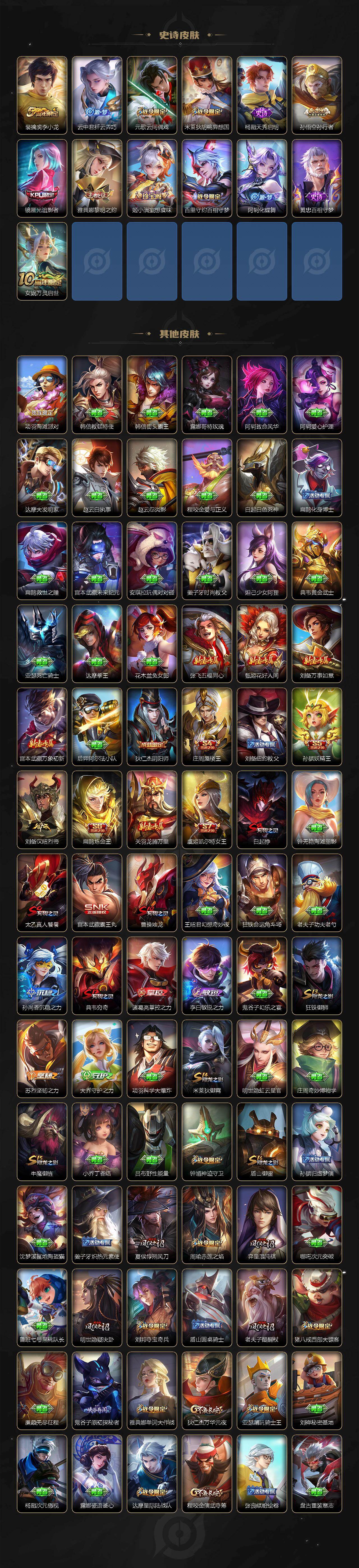 【赛季限定】:庄周蜃楼王,孙膑妖精王,扁鹊炼金王,白起狰,夏侯惇朔风刀,曹操烛龙,典韦穷奇,狄仁杰万华元夜,达摩沙漠行僧,老夫子醍醐杖,程咬金演武夺筹,兰陵王金庭之子,张良古海寻踪,牛魔御旌,虞姬凯尔特女王,钟馗驱傩正仪,雅典娜黎明之约,太乙真人饕餮,鬼谷子原初探秘者,苏烈千军破阵,百里玄策原初追逐者,弈星混沌棋,明世隐疑决卦,狂铁御狮,米莱狄御霄,盾山御銮,鬼谷子天穹祈灯,刘邦剑破天穹