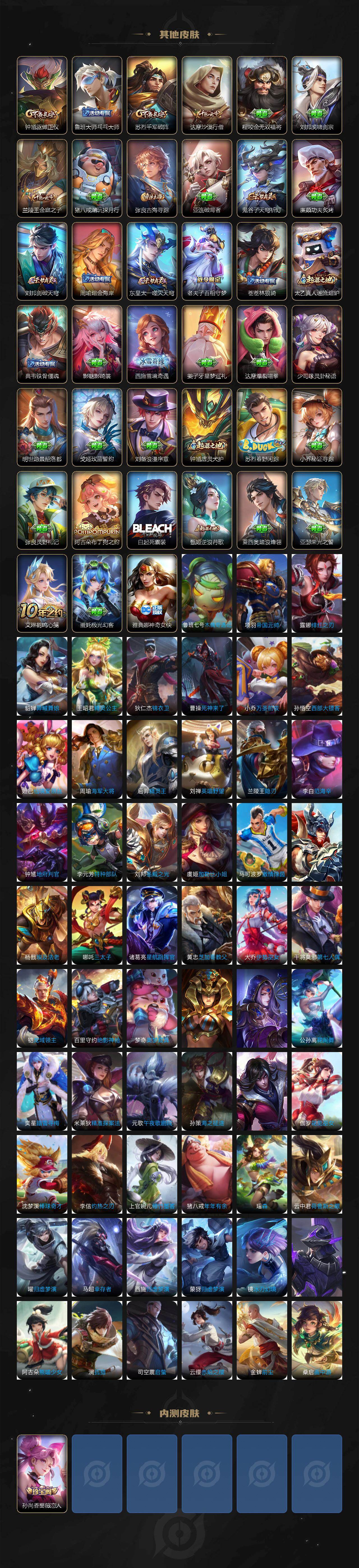 【限定皮肤】:白起狰,狄仁杰阴阳师,虞姬凯尔特女王,赵云皇家上将,妲己时之彼端,孙尚香蔷薇恋人,鲁班七号狮舞东方,庄周蜃楼王,阿轲迷踪丽影,孙膑妖精王,扁鹊炼金王,吕布天魔缭乱,周瑜赤莲之焰,元歌云间偶戏,夏侯惇朔风刀,甄姬游园惊梦,曹操烛龙,典韦穷奇,马可波罗逐梦之星,马可波罗暗影游猎,狄仁杰魔术师,狄仁杰万华元夜,达摩星际陆战队,达摩沙漠行僧,项羽海滩派对,老夫子醍醐杖,关羽冰锋战神,程咬金演武夺筹,刘邦夺宝奇兵,兰陵王默契交锋,兰陵王驯魔猎人,兰陵王金庭之子,亚瑟潮玩骑士王,孙悟空至尊宝,孙悟空大圣娶亲,孙悟空零号赤焰,孙悟空孙行者,牛魔御旌,后羿辉光之辰,钟馗神迹守卫,钟馗驱傩正仪,雅典娜单词大作战,雅典娜黎明之约,蔡文姬繁星吟游,太乙真人饕餮,鬼谷子原初探秘者,苏烈千军破阵,百里玄策白虎志,百里玄策原初追逐者,百里守约朱雀志,弈星混沌棋,明世隐疑决卦,裴擒虎李小龙,狂铁御狮,米莱狄御霄,米莱狄胡桃异想国,云中君纤云弄巧,盾山御銮,猪八戒西部大镖客,上官婉儿梁祝,上官婉儿天狼绘梦者,蒙犽狂想玩偶喵,镜匿光追影者,张良古海寻踪,鬼谷子天穹祈灯,姬小满妄想食味,刘邦剑破天穹,周瑜熔金海岸