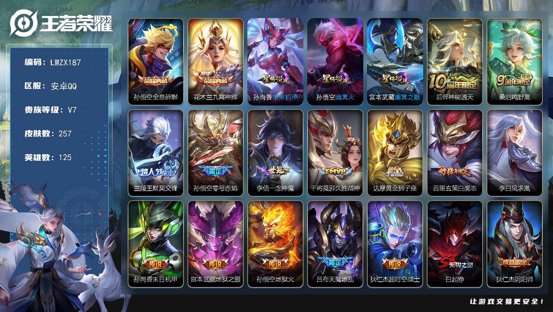 [15613580]可二次【特价出售/店主推荐】安卓Q-V7-最强王者段位-125英雄-257皮肤-2典藏皮肤-14传说-61史诗-3星元