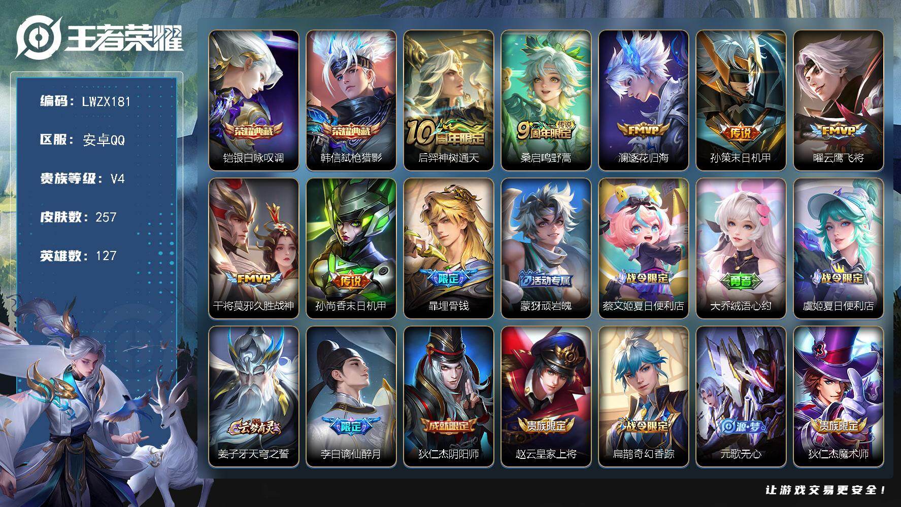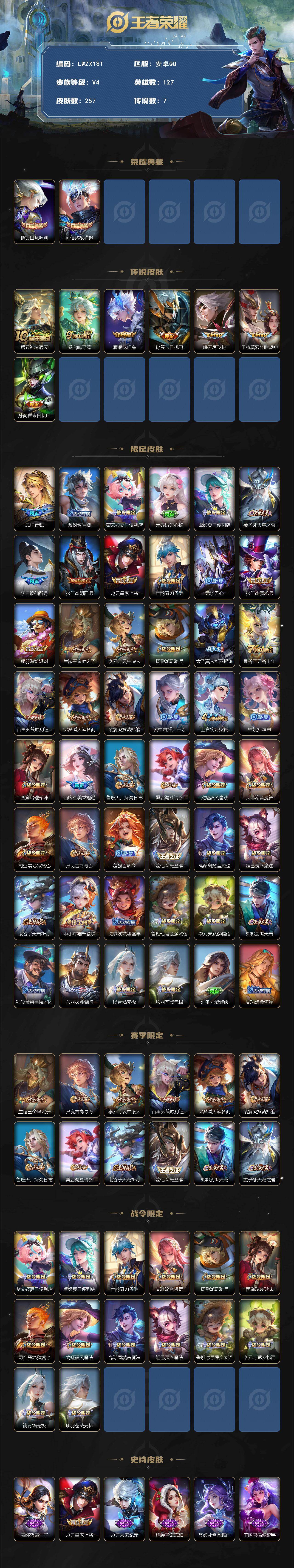 [15613620]【特价出售/店主推荐】安卓Q-V4-最强王者段位-127英雄-257皮肤-2典藏皮肤-7传说-84史诗