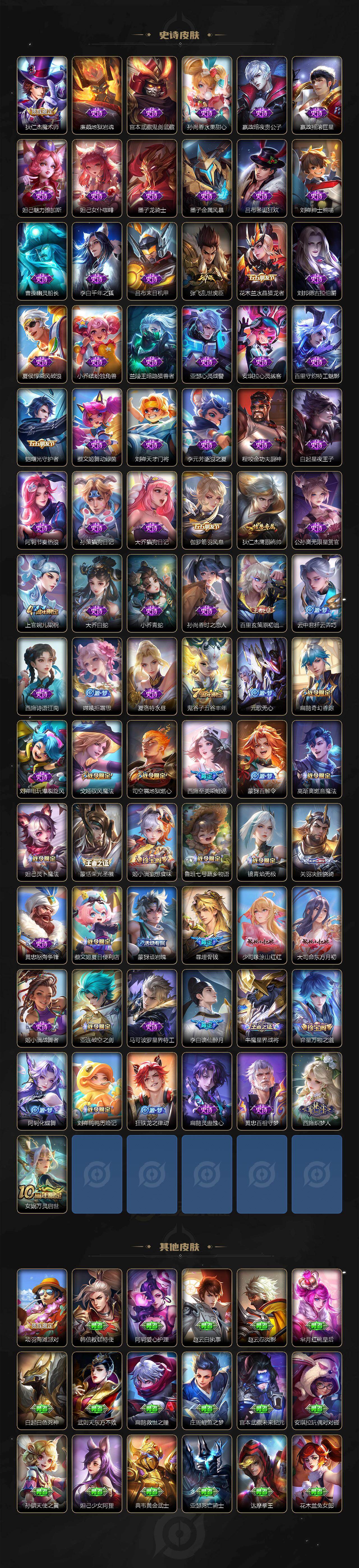 【限定皮肤】:暃埋骨钱,蒙犽顽岩魄,蔡文姬夏日便利店,大乔绒语心约,虞姬夏日便利店,姜子牙天穹之誓,李白谪仙醉月,狄仁杰阴阳师,赵云皇家上将,扁鹊奇幻香踪,元歌无心,狄仁杰魔术师,项羽海滩派对,兰陵王金庭之子,李元芳云中旅人,杨戬潮玩骑兵,太乙真人华丽摇滚,鬼谷子五谷丰年,百里玄策原初追逐者,沈梦溪大漠名商,裴擒虎擒涛扼浪,云中君纤云弄巧,上官婉儿梁祝,嫦娥拒霜思,西施玲珑珍味,西施至美乘鲤谣,鲁班大师探海日志,桑启海盐诗旅,戈娅驭风魔法,艾琳流音漫舞,司空震地狱燃心,张良古海寻踪,蒙犽百解令,蒙恬荣光圣徽,高渐离燃音魔法,妲己灵卜魔法,鬼谷子天穹祈灯,姬小满妄想食味,沈梦溪龙舞盛年,鲁班七号蔬乡物语,李元芳蔬乡物语,刘邦剑破天穹,程咬金群星魔术团,关羽决胜骁骑,镜青焰无极,项羽苍威无极,刘备异域游侠,周瑜熔金海岸