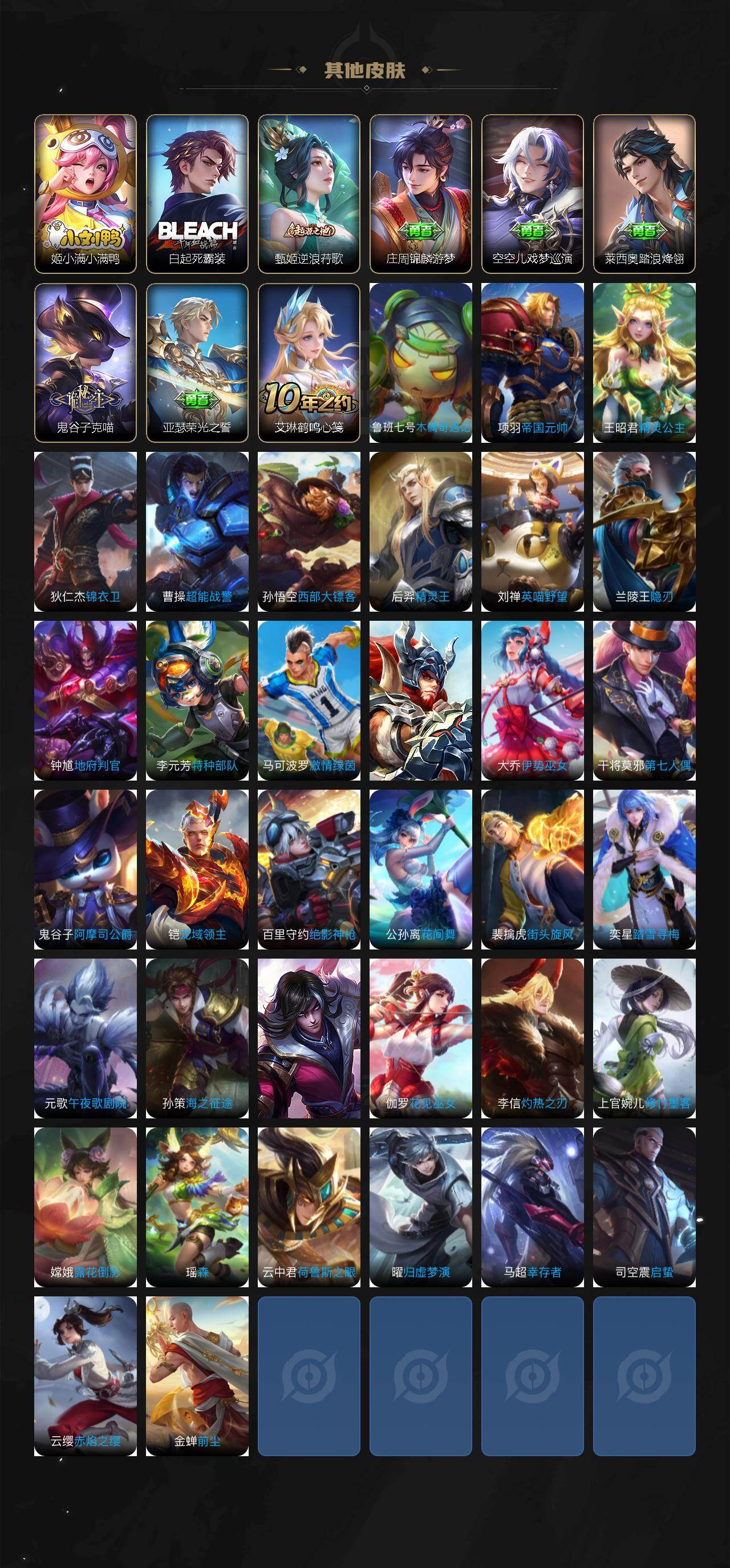 小乔青蛇,大乔白蛇,伽罗箭羽风息,李元芳逐浪之夏,公孙离无限星赏官,大乔猫狗日记,孙策猫狗日记,阿轲节奏热浪,露娜紫霞仙子,王昭君偶像歌手,孙尚香时之恋人,吕布末日机甲,墨子龙骑士,嬴政摇滚巨星,刘禅绅士熊喵,刘禅天才门将,白起星夜王子,安琪拉心灵骇客,程咬金功夫厨神,刘邦德古拉伯爵,兰陵王暗隐猎兽者,曹操幽灵船长,宫本武藏鬼剑武藏,亚瑟心灵战警,蔡文姬舞动绿茵,廉颇地狱岩魂,西施诗语江南,小乔缤纷独角兽,夏侯惇乘风破浪,花木兰水晶猎龙者,铠曙光守护者,墨子金属风暴,百里玄策原初追逐者,吕布圣诞狂欢,貂蝉圣诞恋歌,百里守约特工魅影,嬴政暗夜贵公子,嫦娥拒霜思,李白千年之狐,夏洛特永昼,刘禅电玩·爆裂旋风,蒙犽百解令,高渐离燃音魔法,关羽决胜骁骑,李白谪仙醉月