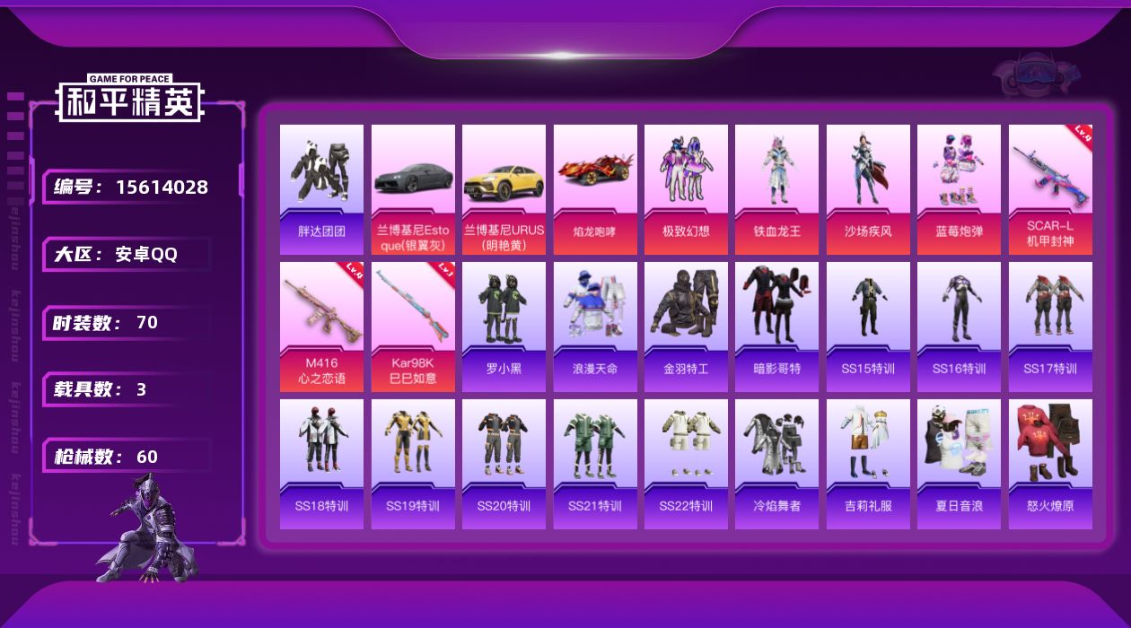 [15614028]安卓 手Q-港澳-4粉装-3特效枪-3载具-2粉色飞行器-26828热力值-3王牌印记-70套装-60枪皮