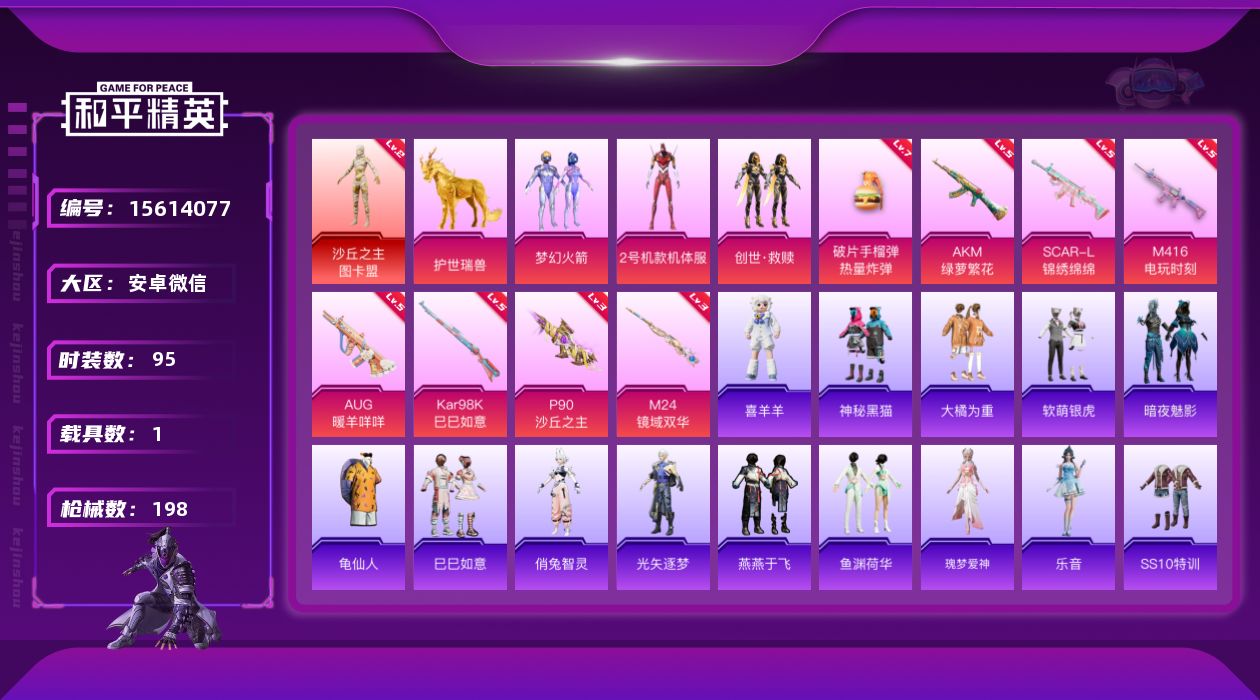 [15614077]安卓 微信-1神装-3粉装-8特效枪-1载具-10粉色飞行器-55785热力值-8王牌印记-95套装-198枪皮