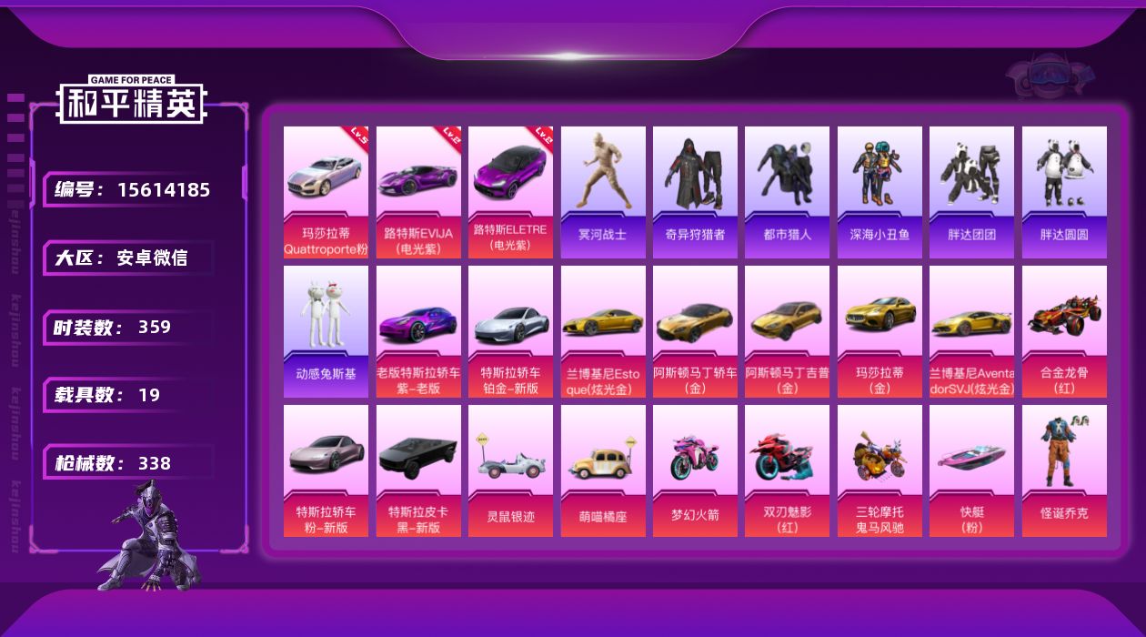 [15614185]送手机!背包枪械材料多!9个车辆升级徽章!11个三币车安卓 微信-无敌战神框-77粉装-25特效枪-19载具-16粉色飞行器-242870热力值-20王牌印记-359套装-338枪皮 【红色载具】:路特斯ELETRE(电光紫)(二级),路特斯EVIJA(电光紫)(二级),玛莎拉蒂Quattroporte(幻星粉)(五级) 【热门品类】:粉装-怪诞乔克,粉装-雪国幻梦,粉装-梦幻火箭,粉装-童趣迷兔,粉装-缤纷油彩,套装-浪漫天命,套装-都市猎人,套装-冥河战士,套装-深海小丑鱼,套装-小丑鱼,套装-奇异狩猎者,角色-军刀雅典娜,套装-胖达团团,套装-胖达圆圆,套装-动感兔斯基人偶服,套装-龟仙人,套装-潮萌小黄鸭,套装-暗影哥特,套装-浪漫波比,套装-粉红小猪,套装-萌熊伴侣 【粉色套装】:粉装-深海曼妙,粉装-粉色回忆,粉装-怪诞乔克,粉装-深渊皇后,粉装-甜心巧克力,粉装-宝贝奶油派,粉装-天使彩虹糖,粉装-雪国幻梦,粉装-蝶舞迷情,粉装-精灵迷巫,粉装-梦幻火箭,粉装-金属狂野,粉装-静灵氛围,粉装-智能音符,粉装-缤纷油彩,粉装-放客神游,粉装-天禅智恒,粉装-新星烈龙,粉装-向日葵,粉装-甜蜜誓约,粉装-极致幻想,粉装-花间之火,粉装-潮汐统领,粉装-锦绣火鲤,粉装-铁甲悍将,粉装-黄蜂伯爵,粉装-鳞翅贤者,粉装-迷蝶贵族,粉装-星点战士,粉装-俏皮狐尾,粉装-草莓生巧,粉装-苍蓝魅影,粉装-翡翠骑士,粉装-绚金战神,粉装-冰霜白皇,粉装-童趣迷兔,粉装-炙焰红王,粉装-香水柠檬,粉装-暗翼战神,粉装-绮梦青鸾,粉装-星之彼岸,粉装-相思残雪,粉装-甜梦冰蝶,粉装-绿野柔风,粉装-馨动时刻,粉装-烈焰拳霸,粉装-虎啸骄阳,粉装-飓风飞鹰,粉装-枪炮玫瑰,粉装-蜜桃特工,粉装-蝶舞蔷薇,粉装-葫芦兄弟,粉装-铁血龙王,粉装-焰龙焚天,粉装-骨龙祭渊,粉装-暗夜玫瑰,角色-闪耀迪迦,角色-赛罗闪耀型,粉装-彩虹鹿灵,粉装-山涧鹿灵,角色-洛天依,角色-零号机款机体服,角色-初号机款机体服,角色-2号机款机体服,粉装-蓝莓炮弹,粉装-绚金瑰梦,粉装-甜心娃娃,粉装-精灵娃娃,粉装-酣梦娃娃,粉装-天之羽翼,粉装-焦糖拿铁,粉装-碧影闪光,粉装-岚岚物语,粉装-海盐物语,粉装-薄荷物语,粉装-恐龙拽拽,粉装-星穹咏叹调 【粉色枪皮等级】:AKM-甜心宝贝(一级)
