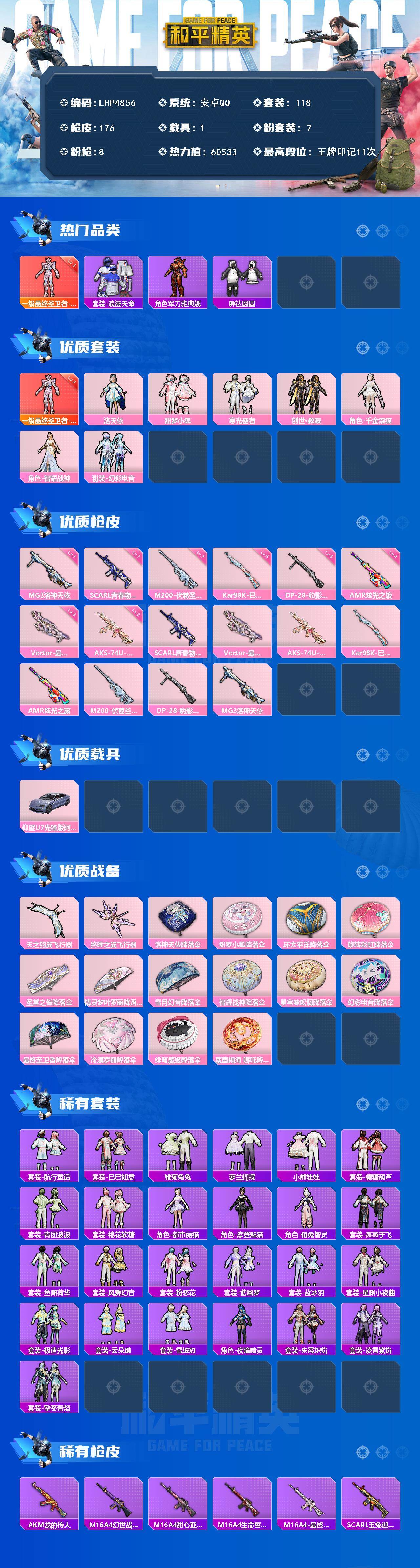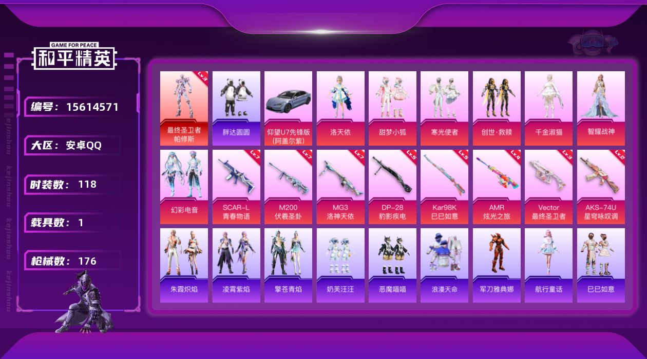 [15614571]【店主推荐捡漏号!可直接换绑】安卓 手Q-1神装-7粉装-8特效枪-1载具-2粉色飞行器-6.5w热力值-11王牌印记-118套装-176枪皮 【红色神装等级】:最终圣卫者-帕修斯(三级) 【红色角色神装】:最终圣卫者-帕修斯 【热门品类】:套装-浪漫天命,角色-军刀雅典娜,套装-胖达圆圆 【粉色套装】:角色-洛天依,粉装-甜梦小狐,粉装-寒光使者,套装-创世·救赎,角色-千金淑猫,角色-智耀战神,粉装-幻彩电音 【粉色枪皮等级】:SCAR-L-青春物语(七级),Vector-最终圣卫者(三级),AKS-74U-星穹咏叹调(二级),Kar98K-巳巳如意(五级),AMR-炫光之旅(四级),M200-伏羲圣卦(七级),DP-28-豹影疾电(五级),MG3-洛神天依(七级) 【粉色载具】:仰望U7(阿盖尔紫) 【粉色枪皮】:SCAR-L-青春物语,Vector-最终圣卫者,AKS-74U-星穹咏叹调,Kar98K-巳巳如意,AMR-炫光之旅,M200-伏羲圣卦,DP-28-豹影疾电,MG3-洛神天依 【粉色飞行器】:天之羽翼飞行器,终晖之翼飞行器 【粉色降落伞】:洛神天依降落伞,甜梦小狐降落伞,环太平洋降落伞,旋转彩虹降落伞,圣堂之誓降落伞,精灵梦叶罗丽降落伞,雪月幻音降落伞,智耀战神降落伞,星穹咏叹调降落伞,幻彩电音降落伞,最终圣卫者降落伞,冷漠罗丽降落伞,绯穹魔姬降落伞,魔童闹海 哪吒降落伞 【稀有套装】:套装-航行童话,套装-巳巳如意,套装-雏菊兔兔,套装-萝兰蝴蝶,套装-小熊娃娃,套装-糖糖葫芦,套装-青团波波,套装-棉花软糖,角色-都市丽猫,角色-摩登魅猫,角色-俏兔智灵,套装-燕燕于飞,套装-鱼渊荷华,套装-风舞幻音,套装-粉恋花,套装-紫幽梦,套装-蓝冰羽,套装-星渊小夜曲,套装-极速光影,套装-云朵鹅,套装-雪绒豹,角色-夜瞳黯灵,套装-朱霞炽焰,套装-凌霄紫焰,套装-擎苍青焰 【稀有枪皮】:AKM-龙的传人,M16A4-幻世战舞者,M16A4-甜心亚梦,M16A4-生命誓言,M16A4-最终圣卫者,SCAR-L-玉兔迎春,M416-糯团青竹,M416-蓝色火焰,AUG-天降萌叽,QBZ-洛神天依,M762-云朵鹅,Mk47-洛神天依,Mk47-炫光之旅,G36C-青丘仙客,AC-VAL-天降萌叽,AC-VAL-快闪甜心,AC-VAL-甜心亚梦,蜜獾-