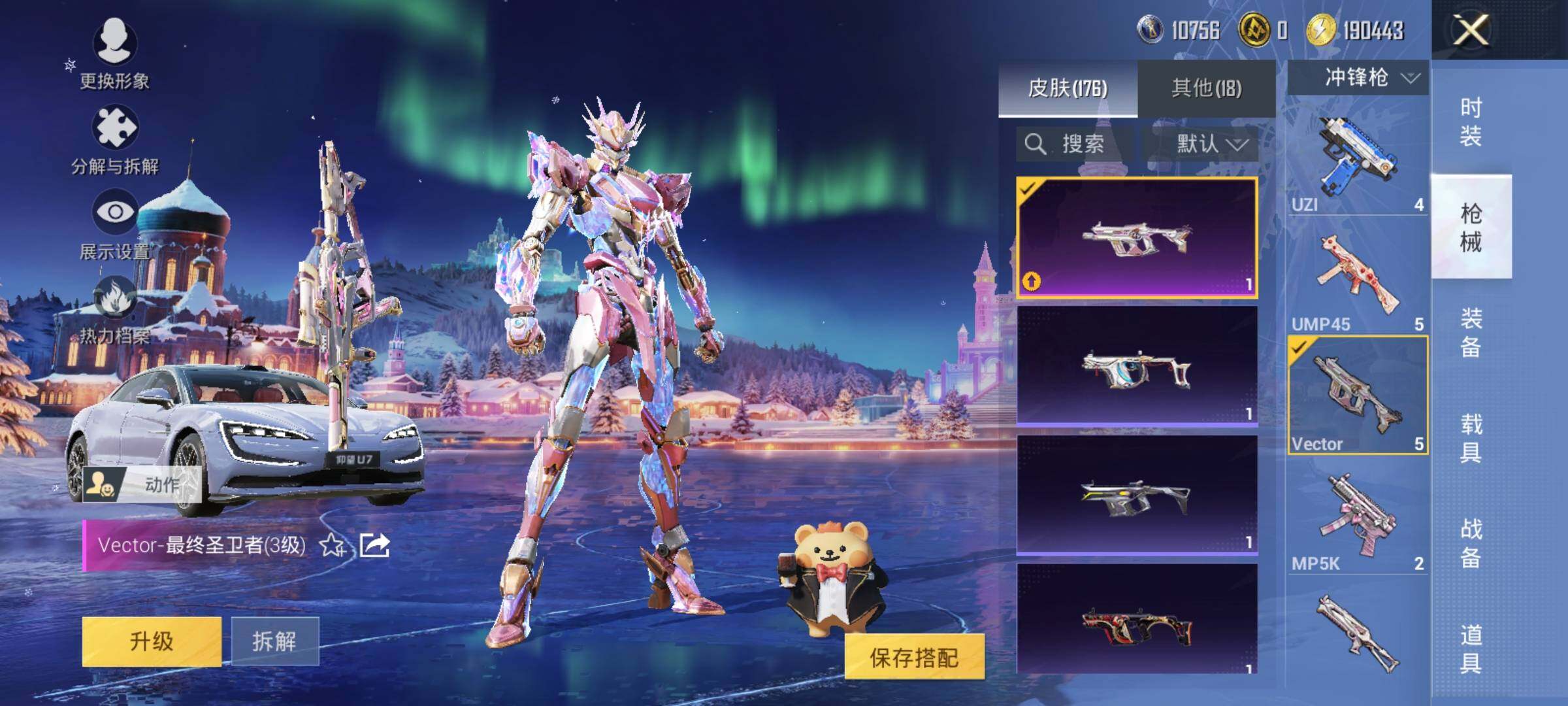 【粉色枪皮等级】:SCAR-L-青春物语(七级),Vector-最终圣卫者(三级),AKS-74U-星穹咏叹调(二级),Kar98K-巳巳如意(五级),AMR-炫光之旅(四级),M200-伏羲圣卦(七级),DP-28-豹影疾电(五级),MG3-洛神天依(七级)