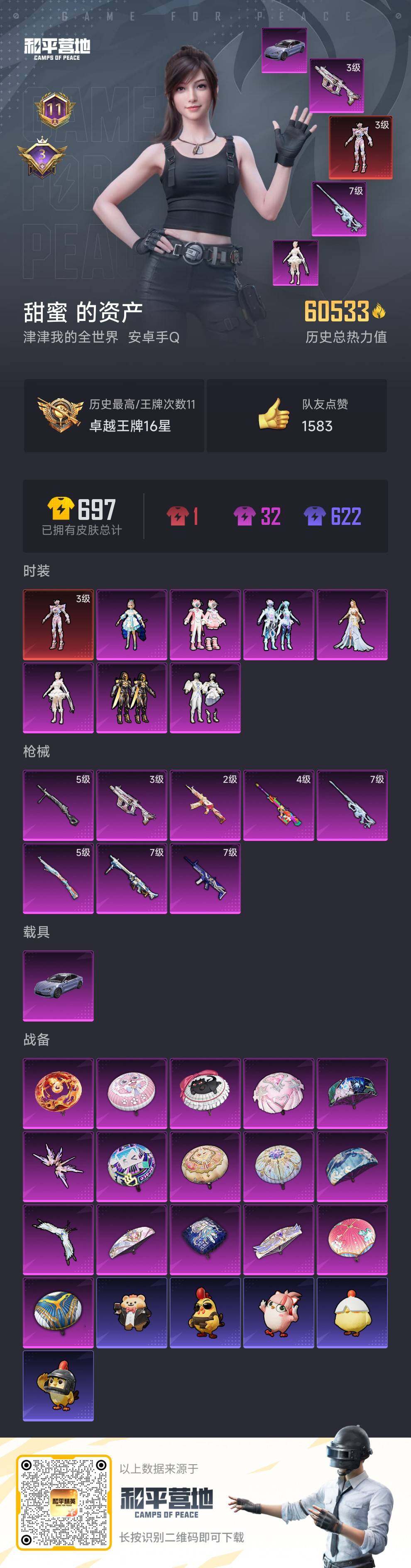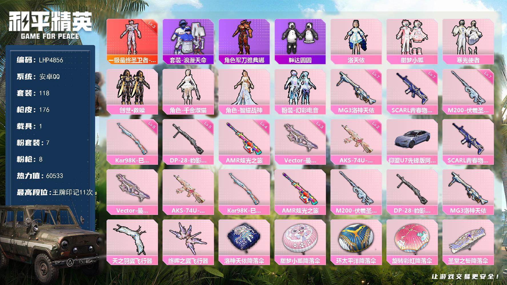 [15614571]【店主推荐捡漏号!可直接换绑】安卓 手Q-1神装-7粉装-8特效枪-1载具-2粉色飞行器-6.5w热力值-11王牌印记-118套装-176枪皮