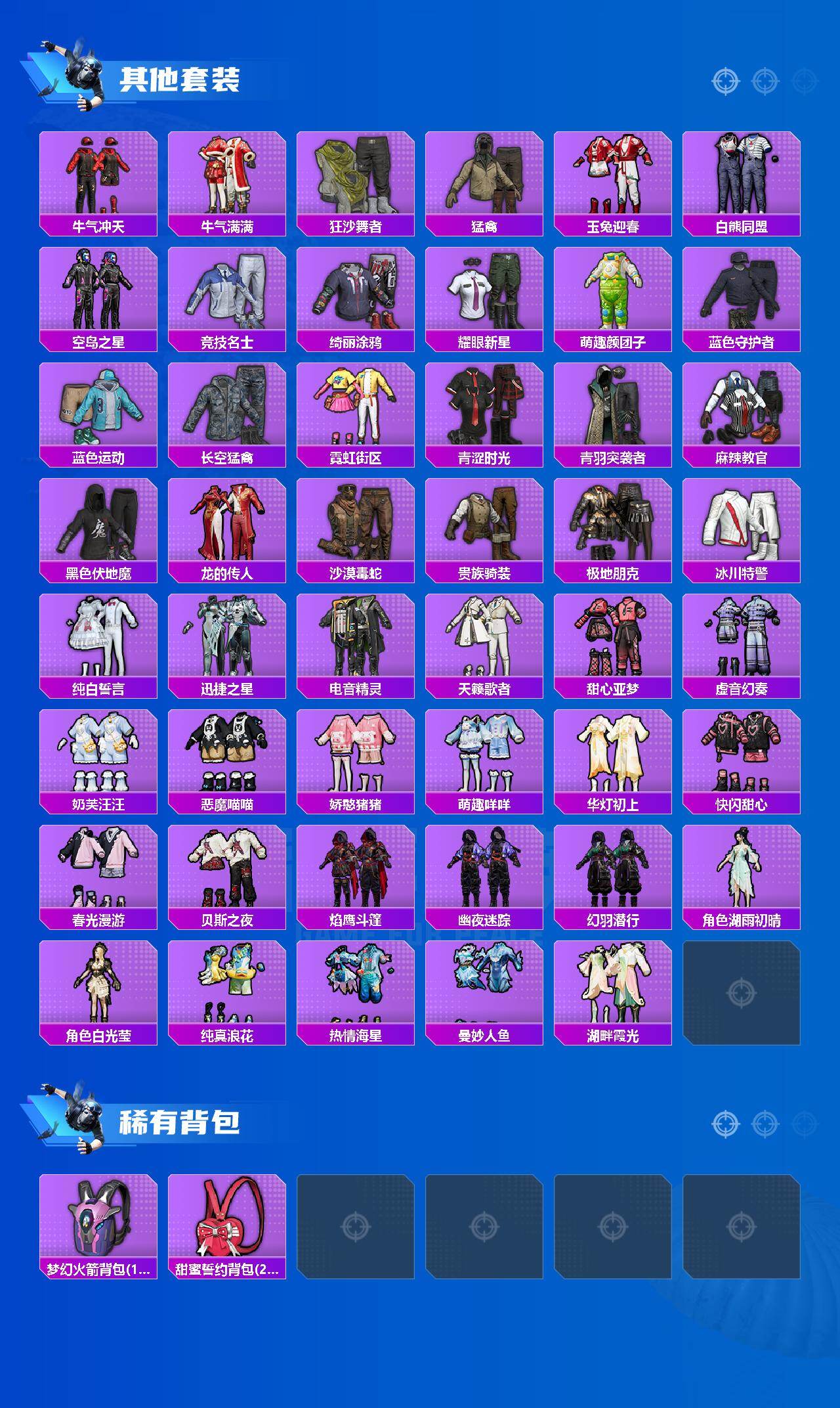 【稀有套装】:套装-航行童话,套装-巳巳如意,套装-雏菊兔兔,套装-萝兰蝴蝶,套装-小熊娃娃,套装-糖糖葫芦,套装-青团波波,套装-棉花软糖,角色-都市丽猫,角色-摩登魅猫,角色-俏兔智灵,套装-燕燕于飞,套装-鱼渊荷华,套装-风舞幻音,套装-粉恋花,套装-紫幽梦,套装-蓝冰羽,套装-星渊小夜曲,套装-极速光影,套装-云朵鹅,套装-雪绒豹,角色-夜瞳黯灵,套装-朱霞炽焰,套装-凌霄紫焰,套装-擎苍青焰