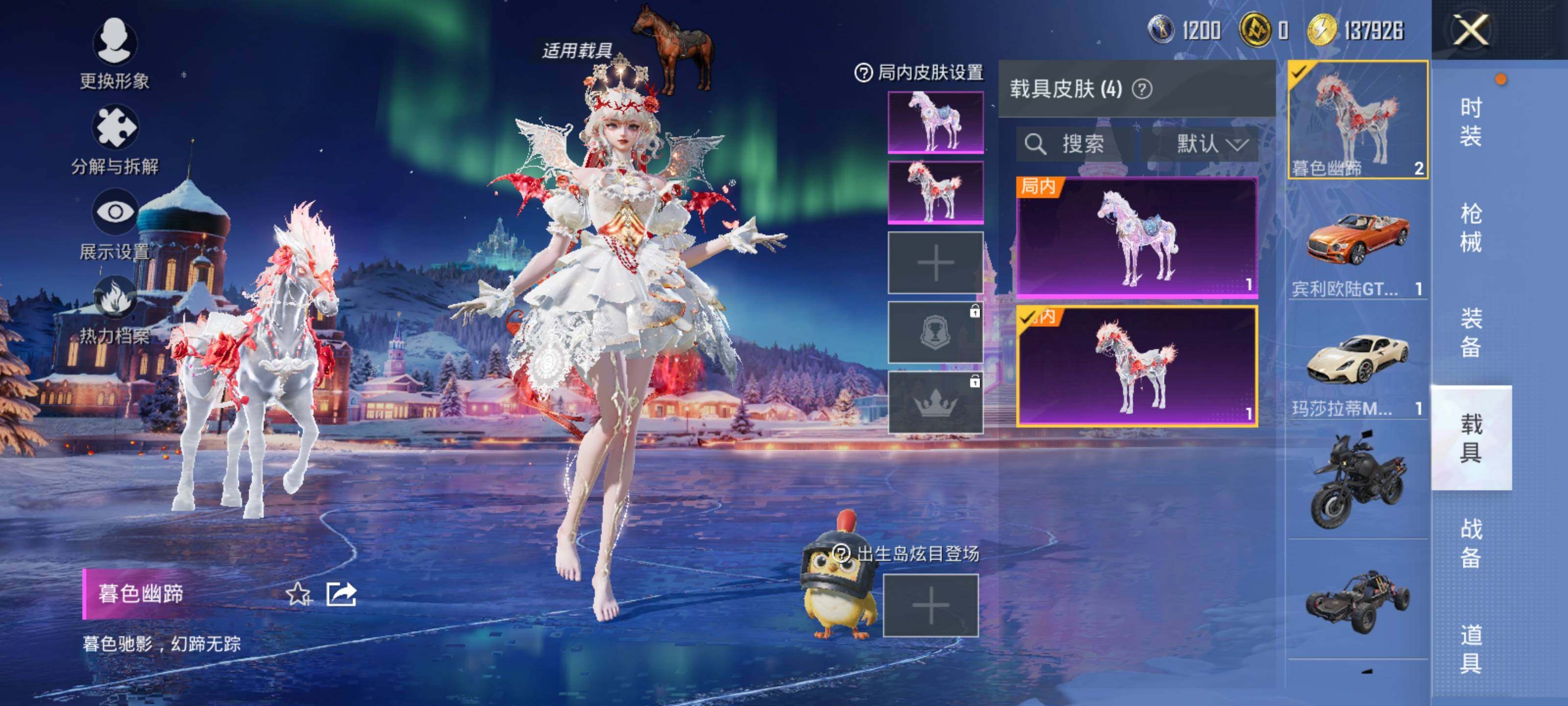【粉色载具】:玛莎拉蒂MC20(星石白),宾利欧陆GT敞篷(火焰橘),晶梦灵驹,暮色幽蹄
