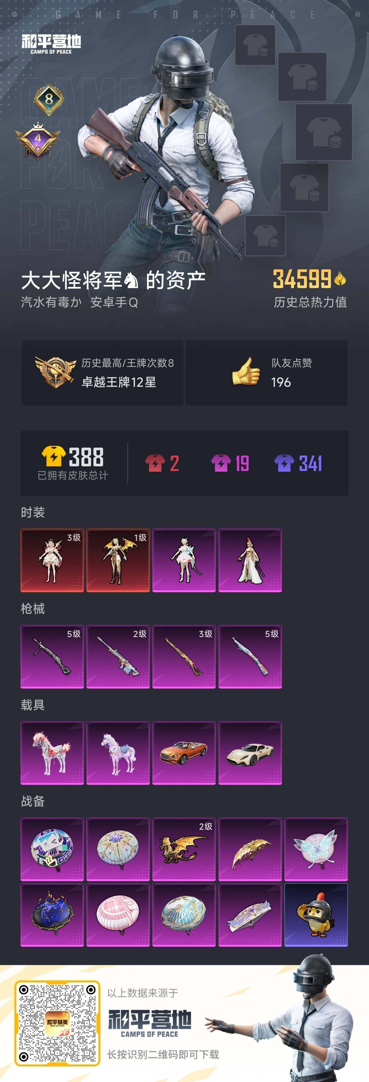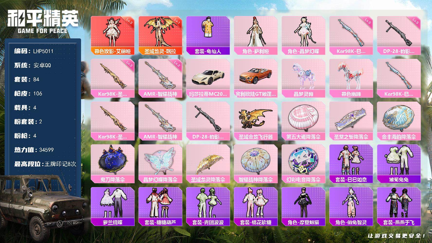 [15614560]【店主推荐捡漏号!可直接换绑】安卓 手Q-2神装-2粉装-4特效枪-4载具-1粉色飞行器-3.4w热力值-8王牌印记-84套装-106枪皮