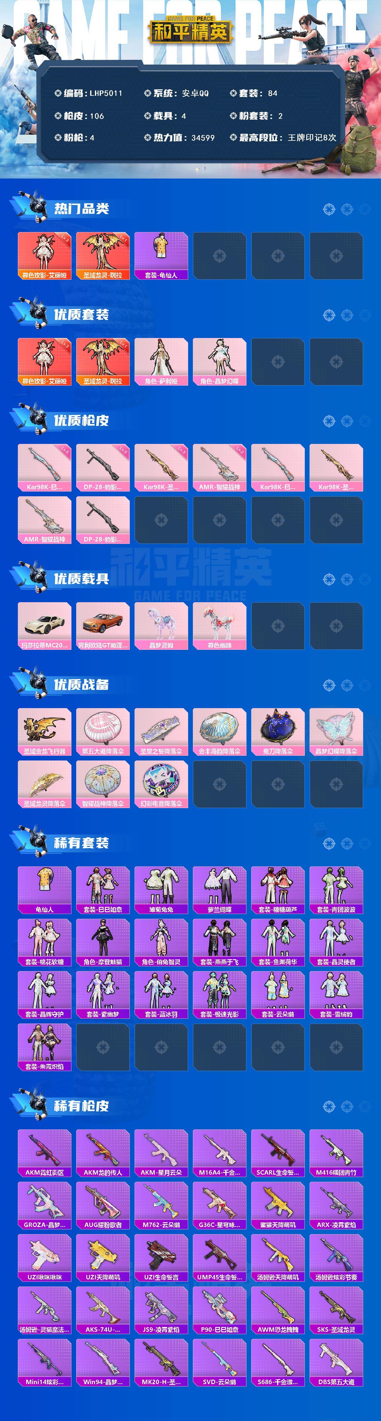 [15614560]【店主推荐捡漏号!可直接换绑】安卓 手Q-2神装-2粉装-4特效枪-4载具-1粉色飞行器-3.4w热力值-8王牌印记-84套装-106枪皮 【红色神装等级】:暮色玫影-艾丽娅(三级),圣域龙灵-瑞拉(一级) 【红色角色神装】:暮色玫影-艾丽娅,圣域龙灵-瑞拉 【热门品类】:套装-龟仙人 【粉色套装】:角色-萨利娅,角色-晶梦幻蝶 【粉色枪皮等级】:Kar98K-巳巳如意(五级),Kar98K-圣域龙灵(三级),AMR-智耀战神(二级),DP-28-豹影疾电(五级) 【粉色载具】:玛莎拉蒂MC20(星石白),宾利欧陆GT敞篷(火焰橘),晶梦灵驹,暮色幽蹄 【粉色枪皮】:Kar98K-巳巳如意,Kar98K-圣域龙灵,AMR-智耀战神,DP-28-豹影疾电 【粉色飞行器】:圣域金龙飞行器 【粉色降落伞】:第五大道降落伞,圣堂之誓降落伞,金丰海韵降落伞,鬼刀降落伞,晶梦幻蝶降落伞,圣域龙灵降落伞,智耀战神降落伞,幻彩电音降落伞 【稀有套装】:套装-龟仙人,套装-巳巳如意,套装-雏菊兔兔,套装-萝兰蝴蝶,套装-糖糖葫芦,套装-青团波波,套装-棉花软糖,角色-摩登魅猫,角色-俏兔智灵,套装-燕燕于飞,套装-鱼渊荷华,套装-晶灵使者,套装-晶辉守护,套装-紫幽梦,套装-蓝冰羽,套装-极速光影,套装-云朵鹅,套装-雪绒豹,套装-朱霞炽焰 【稀有枪皮】:AKM-霓虹街区,AKM-龙的传人,AKM-星月云朵,M16A4-千金淑猫,SCAR-L-生命誓言,M416-糯团青竹,GROZA-晶梦幻蝶,AUG-耀粉歌者,M762-云朵鹅,G36C-星穹咏叹调,蜜獾-天降萌叽,ARX-凌霄紫焰,UZI-啾咪啾咪,UZI-天降萌叽,UZI-生命誓言,UMP45-生命誓言,汤姆逊-天降萌叽,汤姆逊-炫彩节奏,汤姆逊-灵猫魔法师,AKS-74U-鬼刀,JS9-凌霄紫焰,P90-巳巳如意,AWM-恐龙拽拽,SKS-圣域龙灵,Mini14-炫彩节奏,Win94-晶梦幻蝶,MK20-H-圣域龙灵,SVD-云朵鹅,S686-千金淑猫,DBS-第五大道,DBS-幻彩电音,SPAS-12-云朵鹅,M249-彩虹符号,M249-绯穹魔姬,MG3-智耀战神,MG-36-凌霄紫焰,P92-凌霄紫焰,短管霰弹-圣域龙灵,沙漠之鹰-云朵鹅,TMP-9-江南烟雨,大砍刀-云朵鹅,撬棍-信仰神谕,平底锅-凌霄紫焰,破片手榴