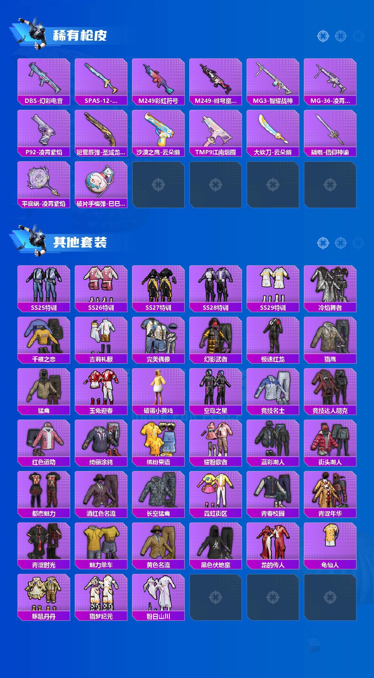 【稀有枪皮】:AKM-霓虹街区,AKM-龙的传人,AKM-星月云朵,M16A4-千金淑猫,SCAR-L-生命誓言,M416-糯团青竹,GROZA-晶梦幻蝶,AUG-耀粉歌者,M762-云朵鹅,G36C-星穹咏叹调,蜜獾-天降萌叽,ARX-凌霄紫焰,UZI-啾咪啾咪,UZI-天降萌叽,UZI-生命誓言,UMP45-生命誓言,汤姆逊-天降萌叽,汤姆逊-炫彩节奏,汤姆逊-灵猫魔法师,AKS-74U-鬼刀,JS9-凌霄紫焰,P90-巳巳如意,AWM-恐龙拽拽,SKS-圣域龙灵,Mini14-炫彩节奏,Win94-晶梦幻蝶,MK20-H-圣域龙灵,SVD-云朵鹅,S686-千金淑猫,DBS-第五大道,DBS-幻彩电音,SPAS-12-云朵鹅,M249-彩虹符号,M249-绯穹魔姬,MG3-智耀战神,MG-36-凌霄紫焰,P92-凌霄紫焰,短管霰弹-圣域龙灵,沙漠之鹰-云朵鹅,TMP-9-江南烟雨,大砍刀-云朵鹅,撬棍-信仰神谕,平底锅-凌霄紫焰,破片手榴