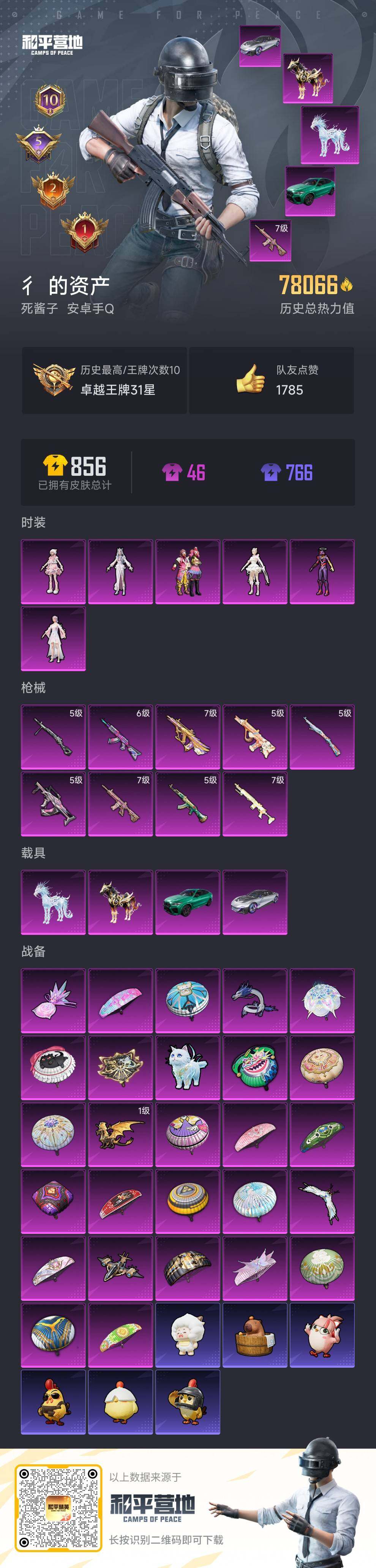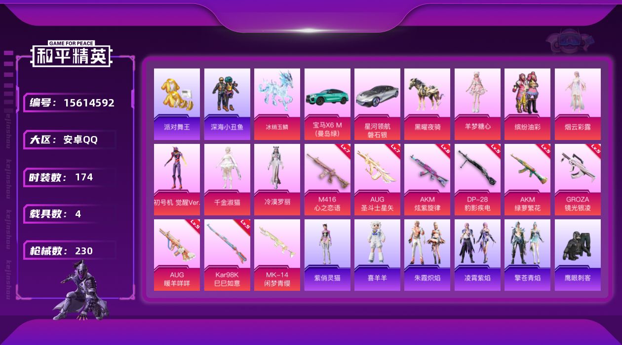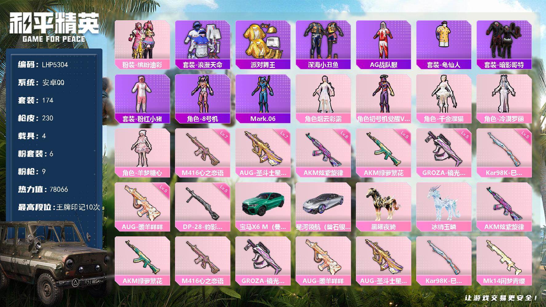 [15614592]【特价出售/店主推荐】安卓 手Q-6粉装-9特效枪-4载具-6粉色飞行器-7.8w热力值-10王牌印记-174套装-230枪皮