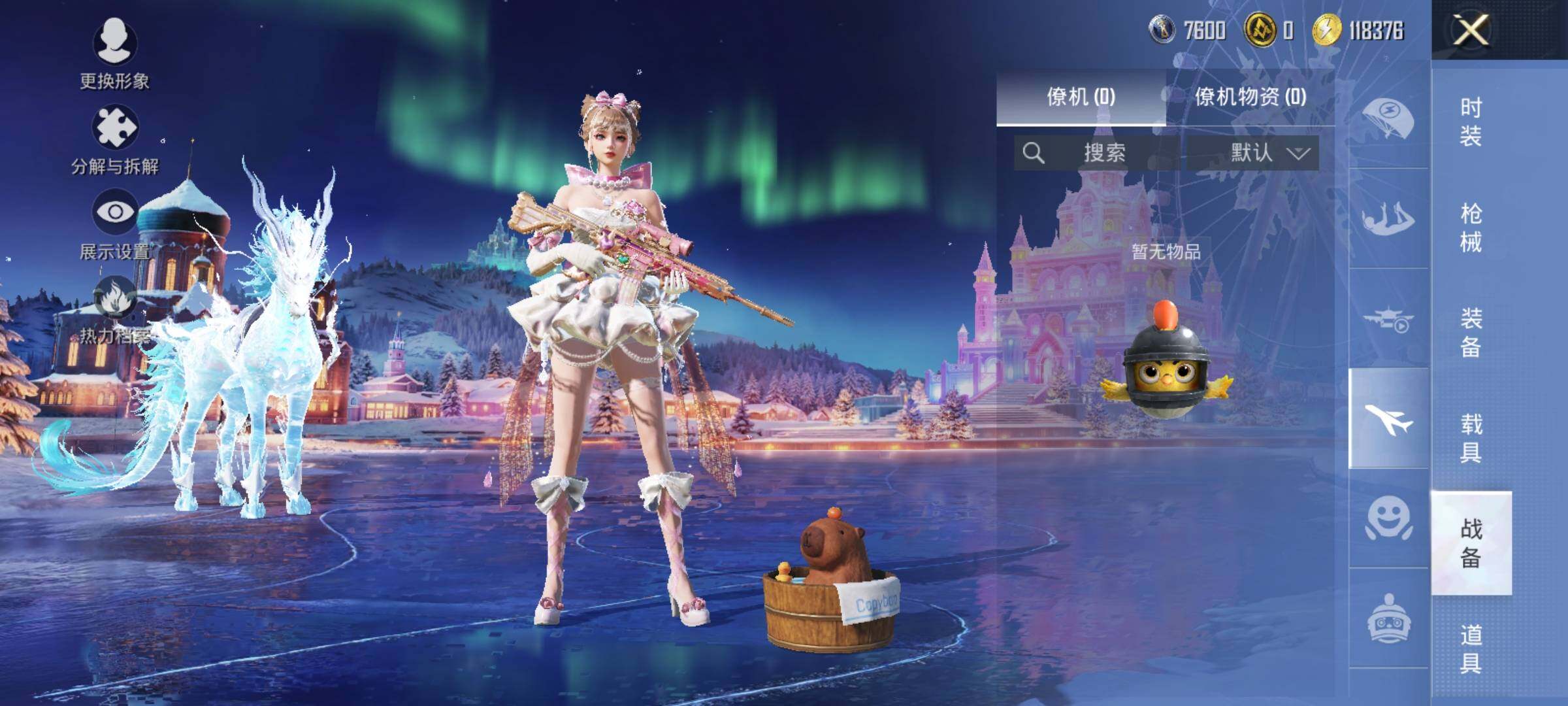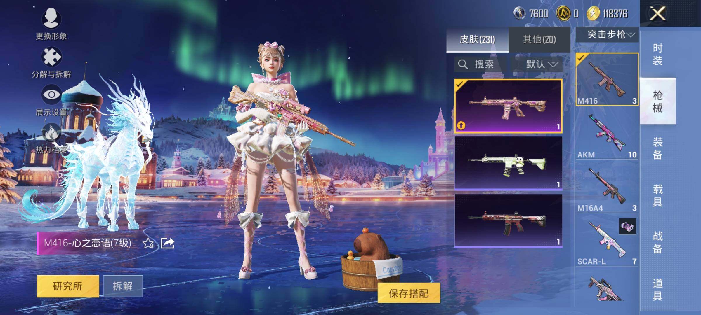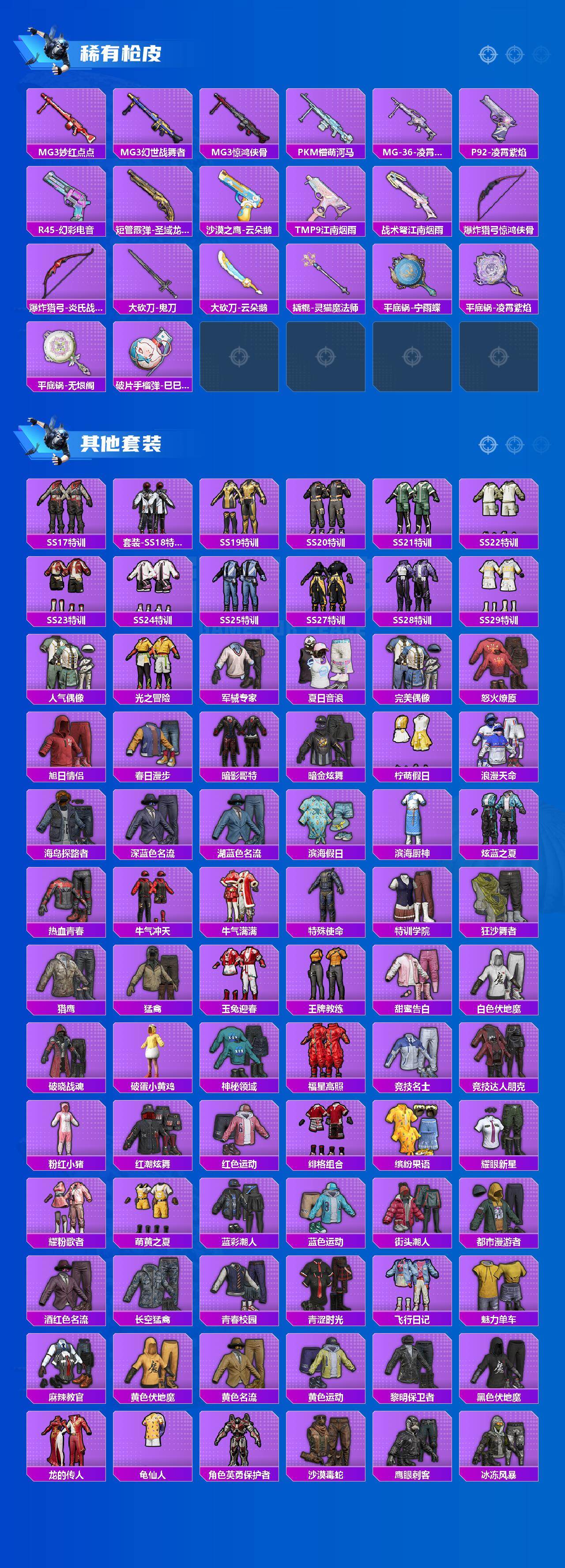 AKM-炫紫旋律,AKM-绿萝繁花,M416-心之恋语,GROZA-镜光银凌,AUG-暖羊咩咩,Kar98K-巳巳如意,Mk14-闲梦青缨
