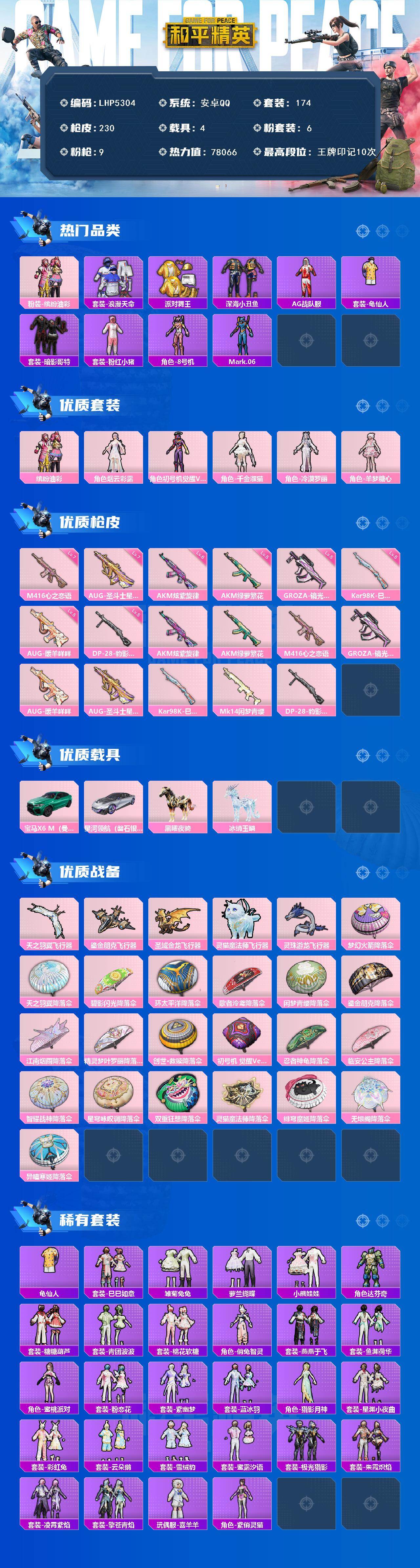 [15614592]【特价出售/店主推荐】安卓 手Q-6粉装-9特效枪-4载具-6粉色飞行器-7.8w热力值-10王牌印记-174套装-230枪皮 【热门品类】:粉装-缤纷油彩,套装-浪漫天命,套装-派对舞王,套装-深海小丑鱼,套装-AG战队服,套装-龟仙人,套装-暗影哥特,套装-粉红小猪,角色-8号机,角色-Mark.06 【粉色套装】:粉装-缤纷油彩,角色-烟云彩露,角色-初号机 觉醒Ver.,角色-千金淑猫,角色-冷漠罗丽,角色-羊梦糖心 【粉色枪皮等级】:AKM-炫紫旋律(六级),AKM-绿萝繁花(五级),M416-心之恋语(七级),GROZA-镜光银凌(五级),AUG-暖羊咩咩(五级),AUG-圣斗士星矢(七级),Kar98K-巳巳如意(五级),DP-28-豹影疾电(五级) 【粉色载具】:宝马X6 M(曼岛绿),星河领航(磐石银),黑曜夜骑,冰绡玉鳞 【粉色枪皮】:AKM-炫紫旋律,AKM-绿萝繁花,M416-心之恋语,GROZA-镜光银凌,AUG-暖羊咩咩,AUG-圣斗士星矢,Kar98K-巳巳如意,Mk14-闲梦青缨,DP-28-豹影疾电 【粉色飞行器】:天之羽翼飞行器,鎏金朋克飞行器,圣域金龙飞行器,灵猫魔法师飞行器,灵珠游龙飞行器 【粉色降落伞】:梦幻火箭降落伞,天之羽翼降落伞,碧影闪光降落伞,环太平洋降落伞,歌者泠鸢降落伞,闲梦青缨降落伞,鎏金朋克降落伞,江南烟雨降落伞,精灵梦叶罗丽降落伞,创世·救赎降落伞,初号机 觉醒Ver.降落伞,忍者神龟降落伞,临安公主降落伞,智耀战神降落伞,星穹咏叹调降落伞,双重狂想降落伞,灵猫魔法师降落伞,绯穹魔姬降落伞,无垠阁降落伞,异瞳寒姬降落伞,炫彩糖果降落伞 【稀有套装】:套装-龟仙人,套装-巳巳如意,套装-雏菊兔兔,套装-萝兰蝴蝶,套装-小熊娃娃,角色-达芬奇,套装-糖糖葫芦,套装-青团波波,套装-棉花软糖,角色-俏兔智灵,套装-燕燕于飞,套装-鱼渊荷华,角色-蜜桃派对,套装-粉恋花,套装-紫幽梦,套装-蓝冰羽,角色-猎影月神,套装-星渊小夜曲,套装-彩虹兔,套装-云朵鹅,套装-雪绒豹,套装-蜜露汐语,套装-极光猎影,套装-朱霞炽焰,套装-凌霄紫焰,套装-擎苍青焰,玩偶服-喜羊羊,角色-紫俏灵猫,套装-炫彩糖果 【稀有枪皮】:AUG-冰晶雪宝,AKM-夜灯,AKM-彩虹符号,AKM-生命誓言,AKM-破晓战魂,AKM-龙的传人