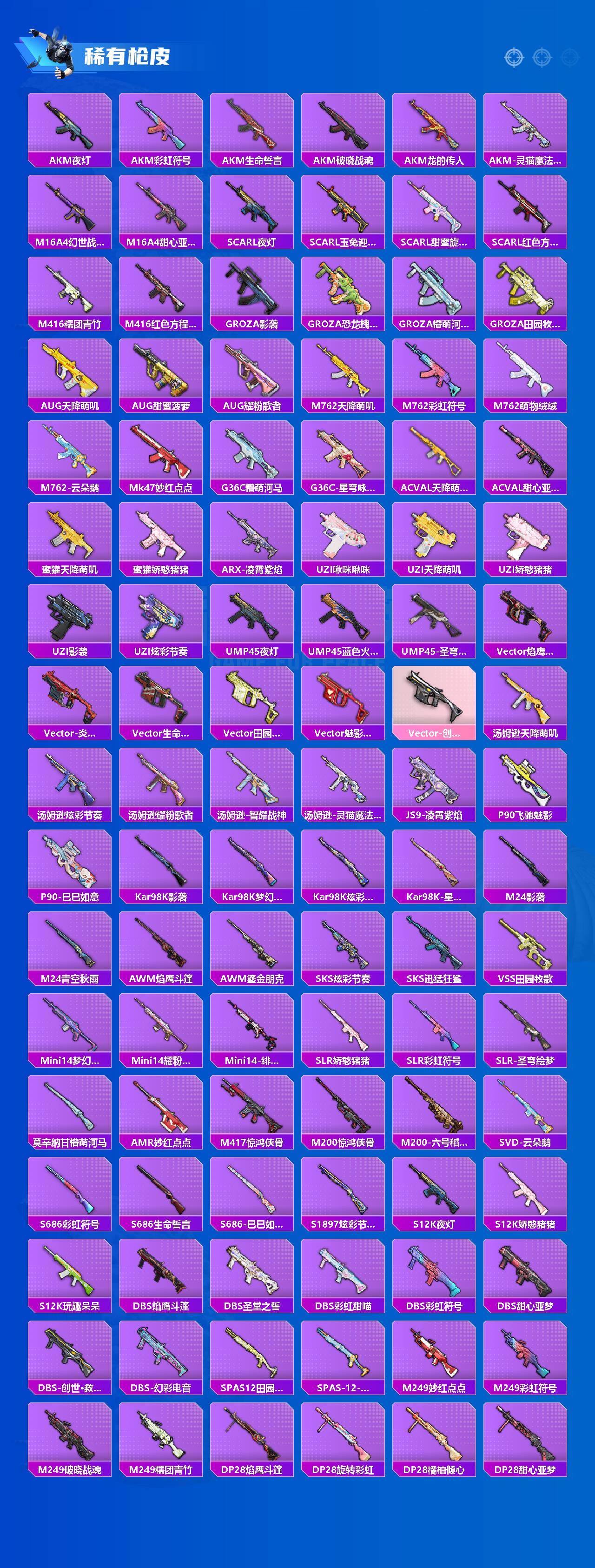【稀有枪皮】:AUG-冰晶雪宝,AKM-夜灯,AKM-彩虹符号,AKM-生命誓言,AKM-破晓战魂,AKM-龙的传人