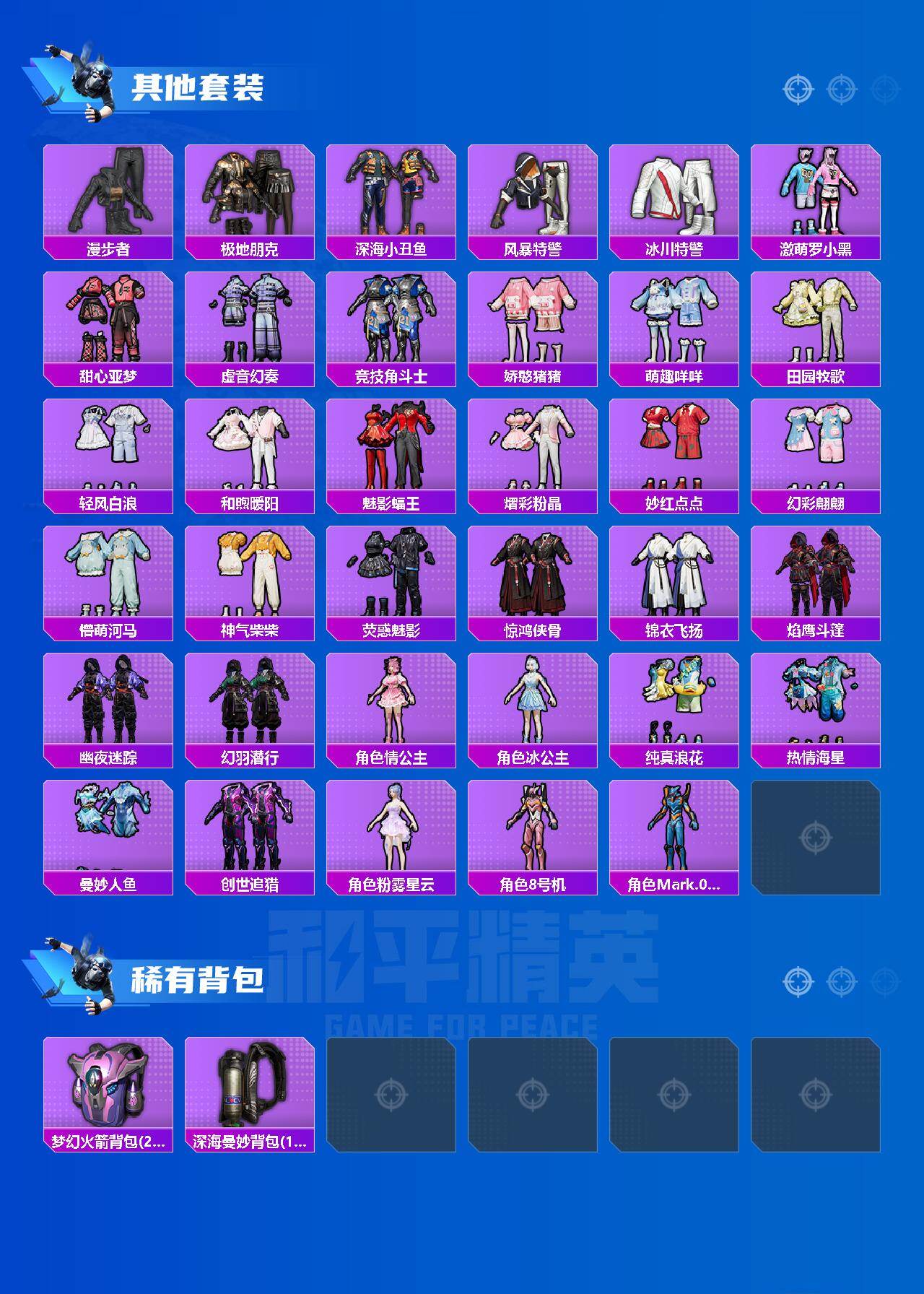 套装-缤纷油彩,套装-派对舞王,套装-深海小丑鱼,角色-烟云彩露,角色-觉醒初号机,角色-千金淑猫,套装-鹰眼刺客