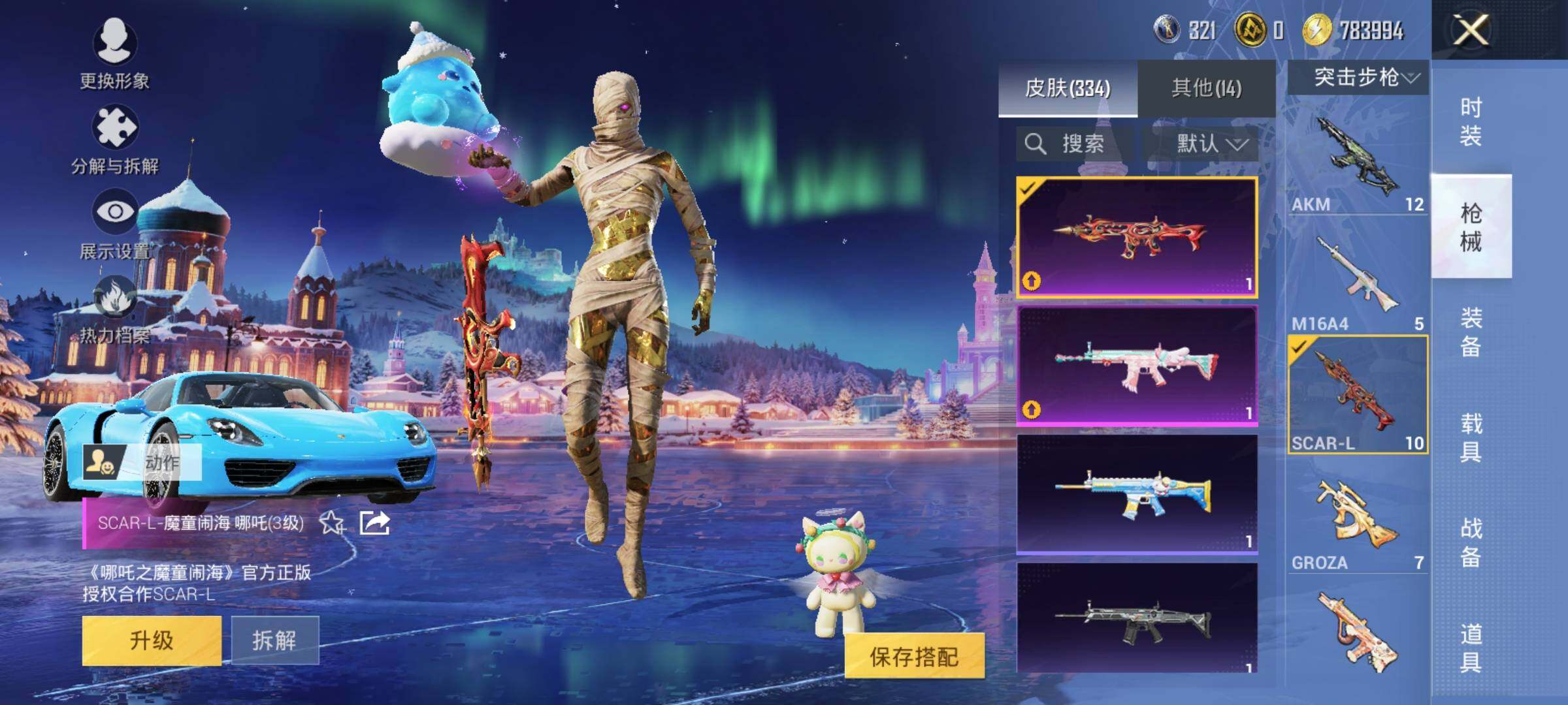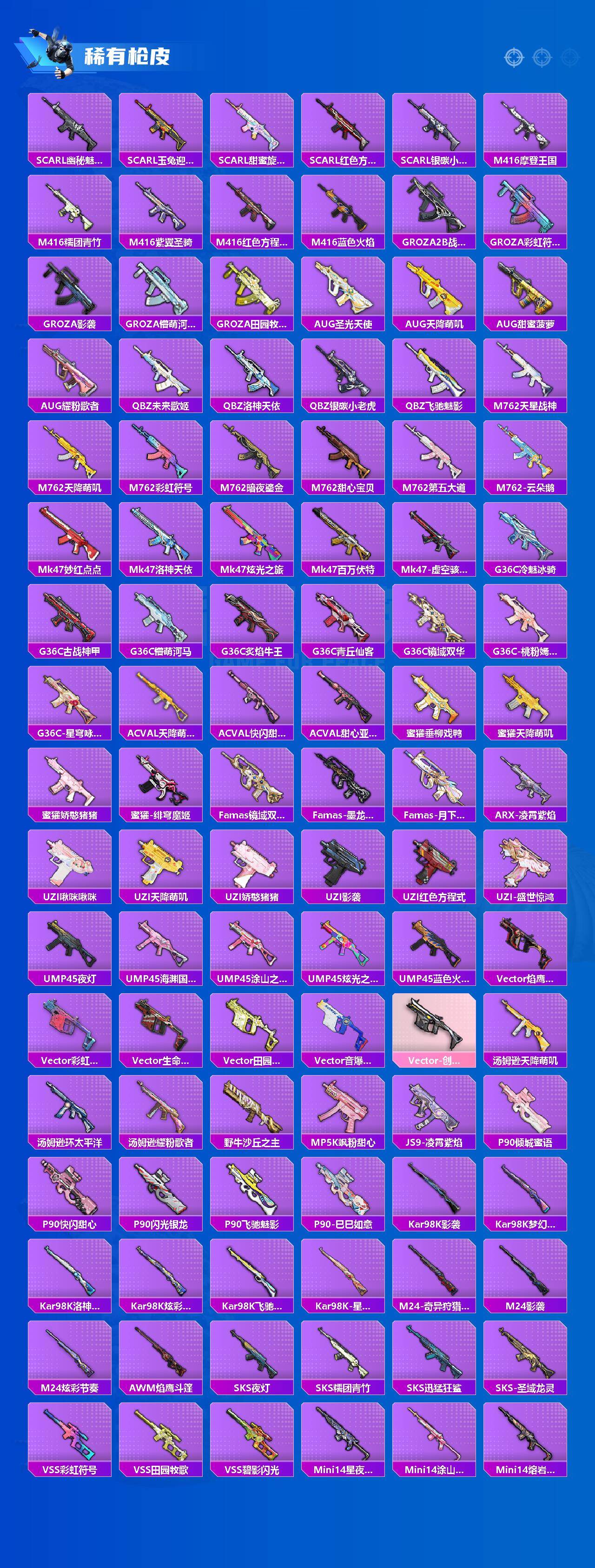 【粉色枪皮】:AKM-魔法神域,AKM-幽焰骑士,SCAR-L-锦绣绵绵,SCAR-L-魔童闹海 哪吒,M416-全功率超战,M416-墨龙九天,GROZA-精灵之光,AUG-暖羊咩咩,Famas-初号机 觉醒Ver.,AKS-74U-星穹咏叹调,Kar98K-创世·救赎,Kar